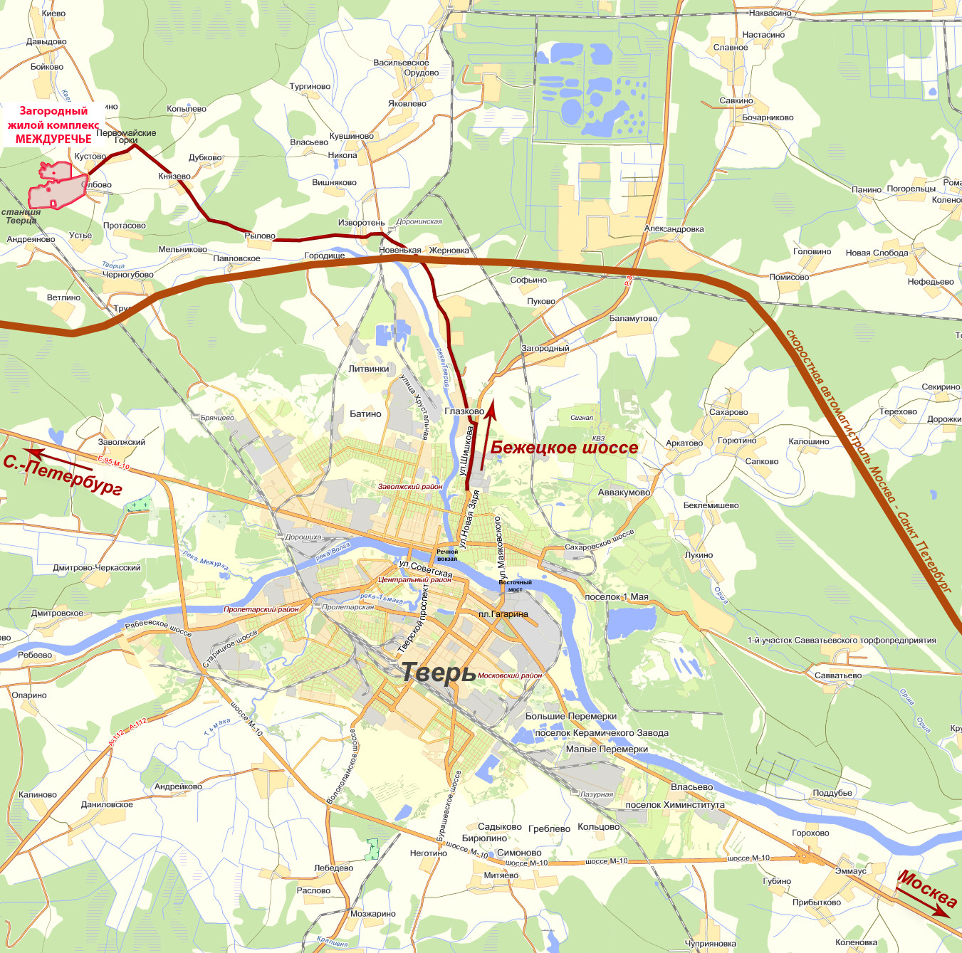 В продаже есть участки в части посёлка в 10-15 минутах пешком до ж/д станции Тверца (Ленинградское направление, 5-я остановка от жд. станции Тверь (Тверь-Пролетарка-Дорошиха-Брянцево-Санаторий-Тверца). До города 7 минут (Дорошиха) - 15 минут (Тверь-жд вокзал) в том числе на комфортабельных электричках Ласточка. От 13 рейсов в одну сторону ежедневно. Есть возможность с пересадкой в Твери за 2, 5 часа на электричке доехать до Москвы (Ленинградский вокзал). Не зависимо от погоды и дороги вы за 15 минут приезжаете в центр города и из города в свой дом.