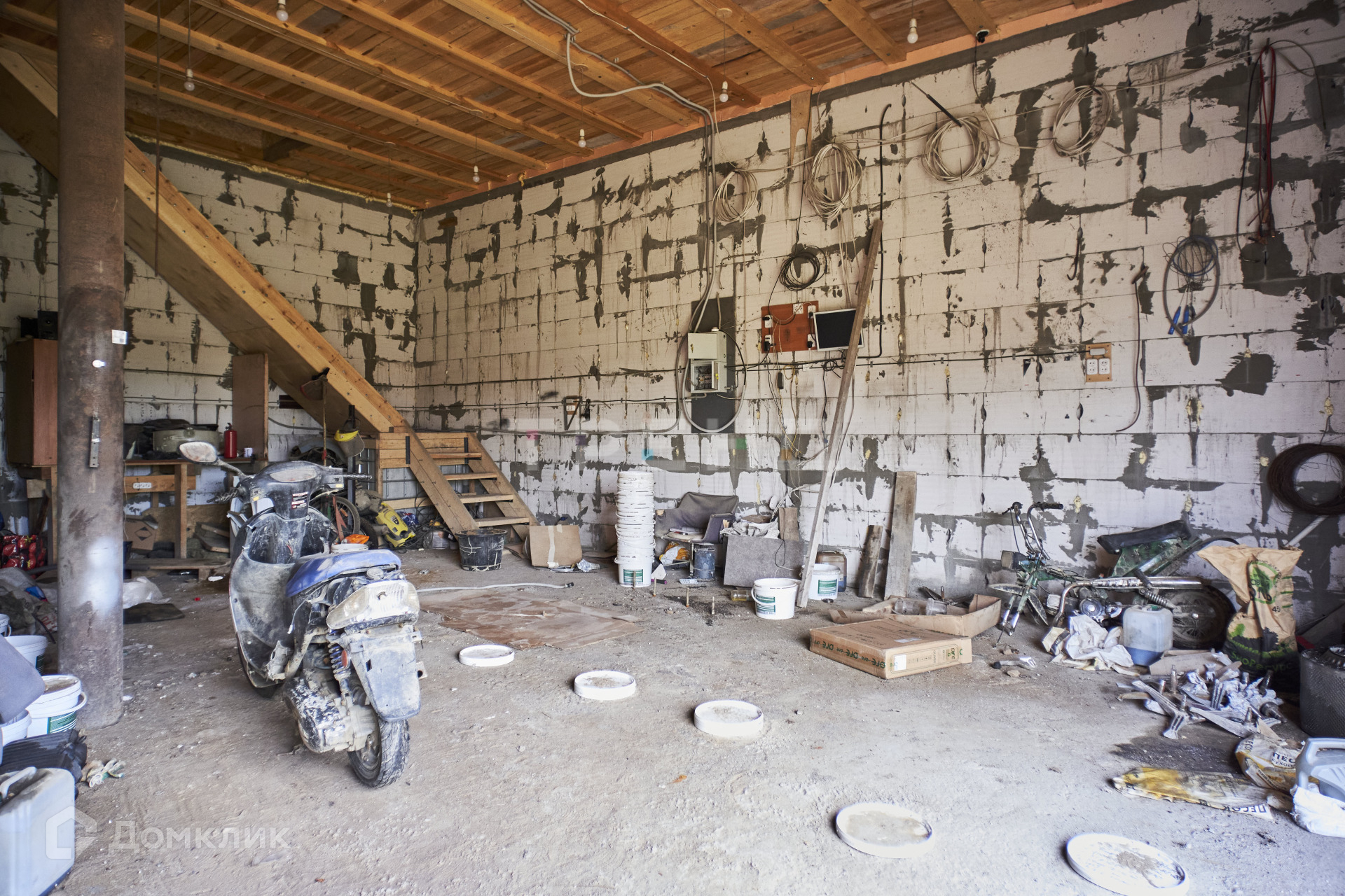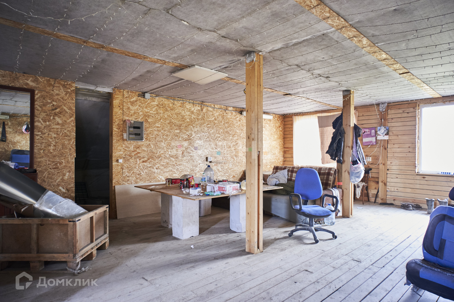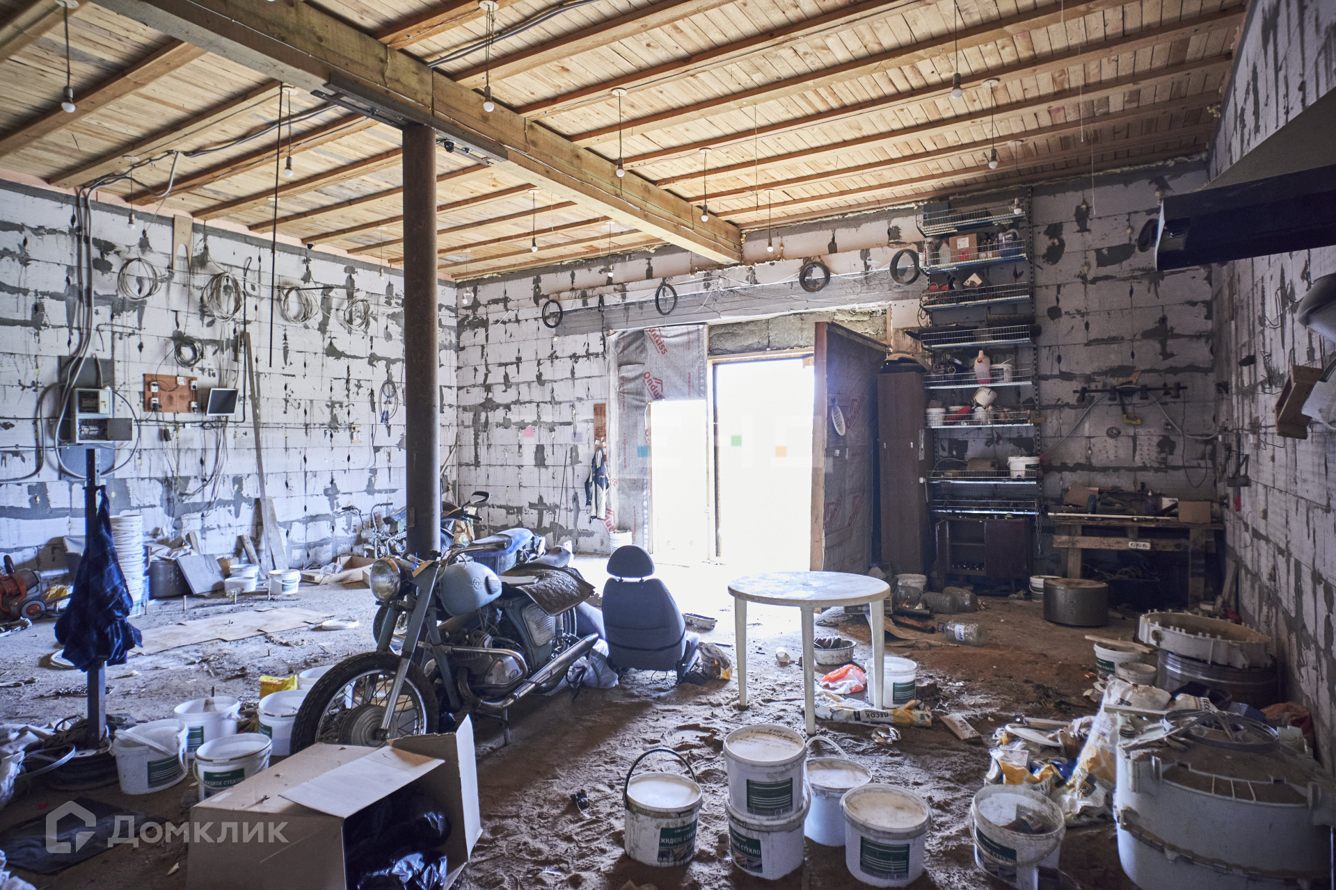 Окон на первом этаже нет, есть ворота 3.75*3, перегородок на первом этаже нет, только столб по центру. Из всех коммуникаций проведены электричество и интернет.