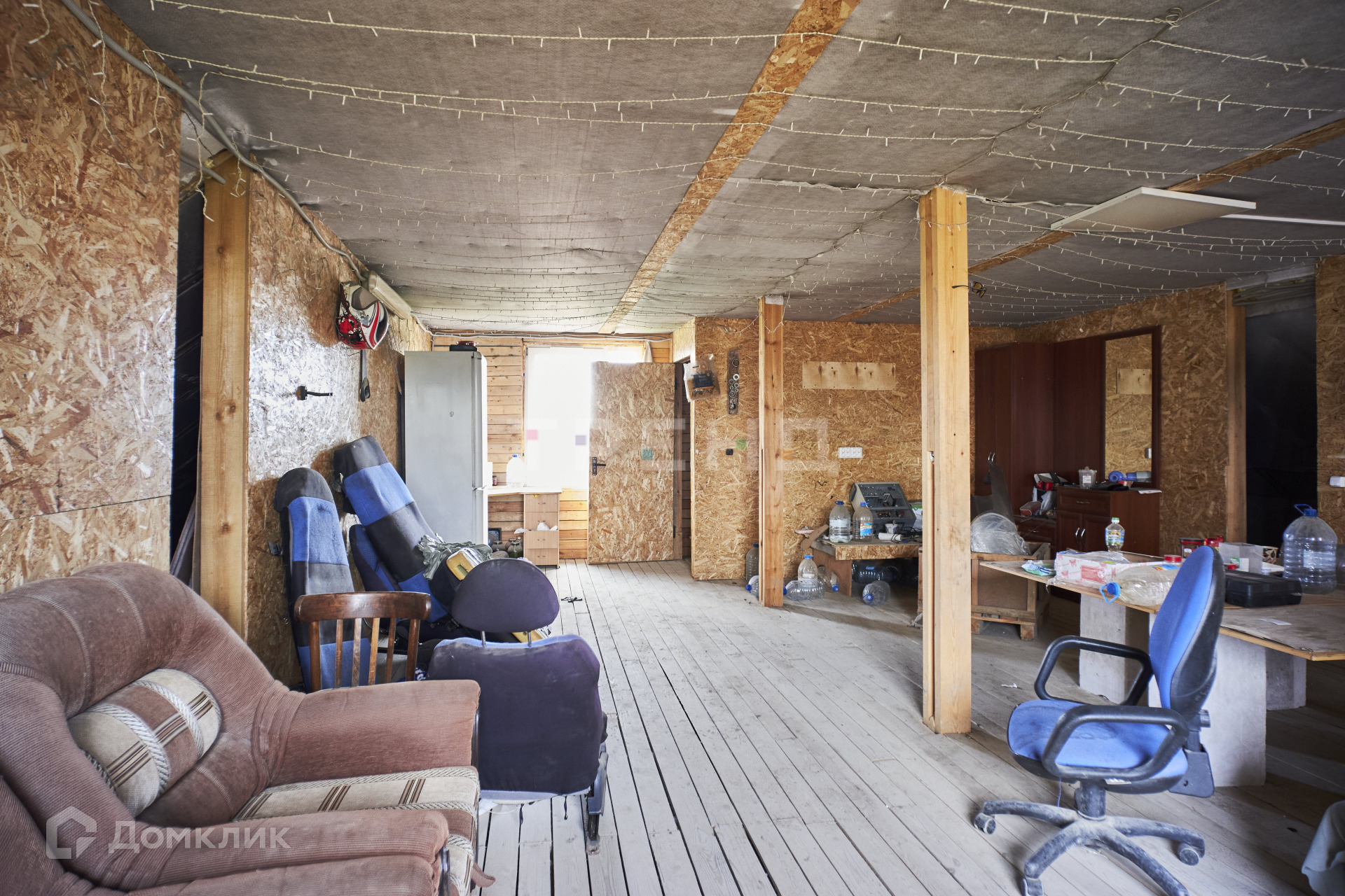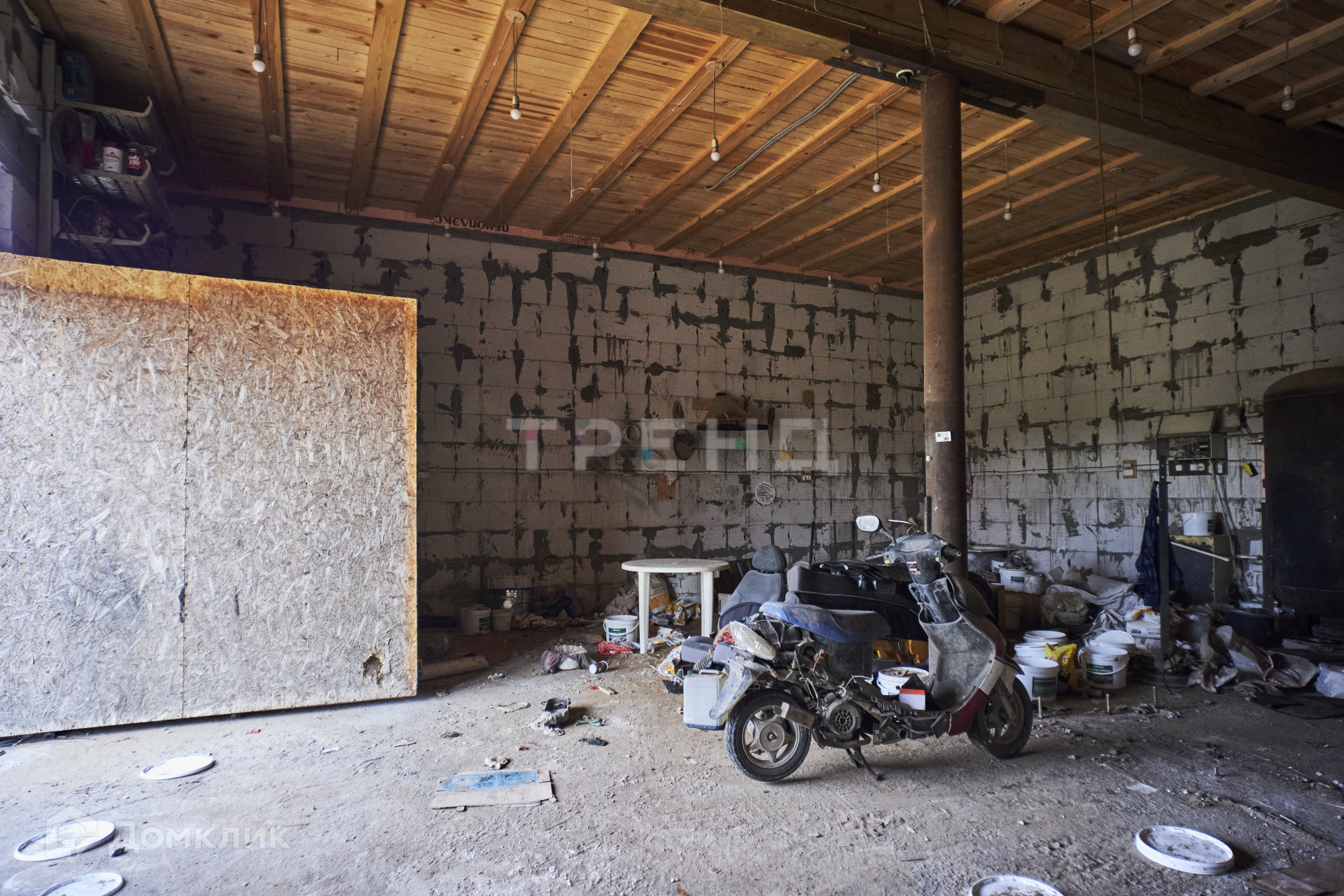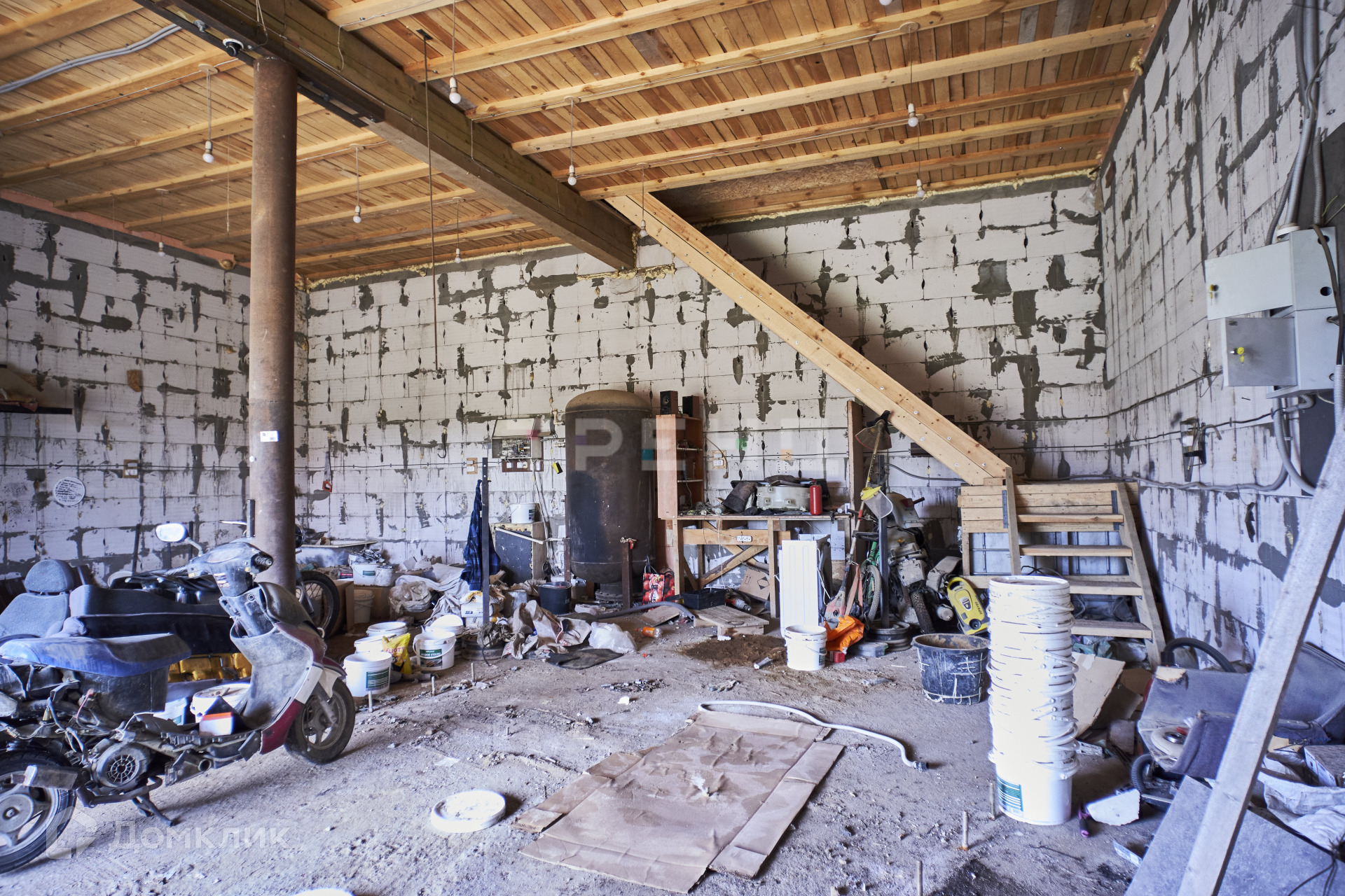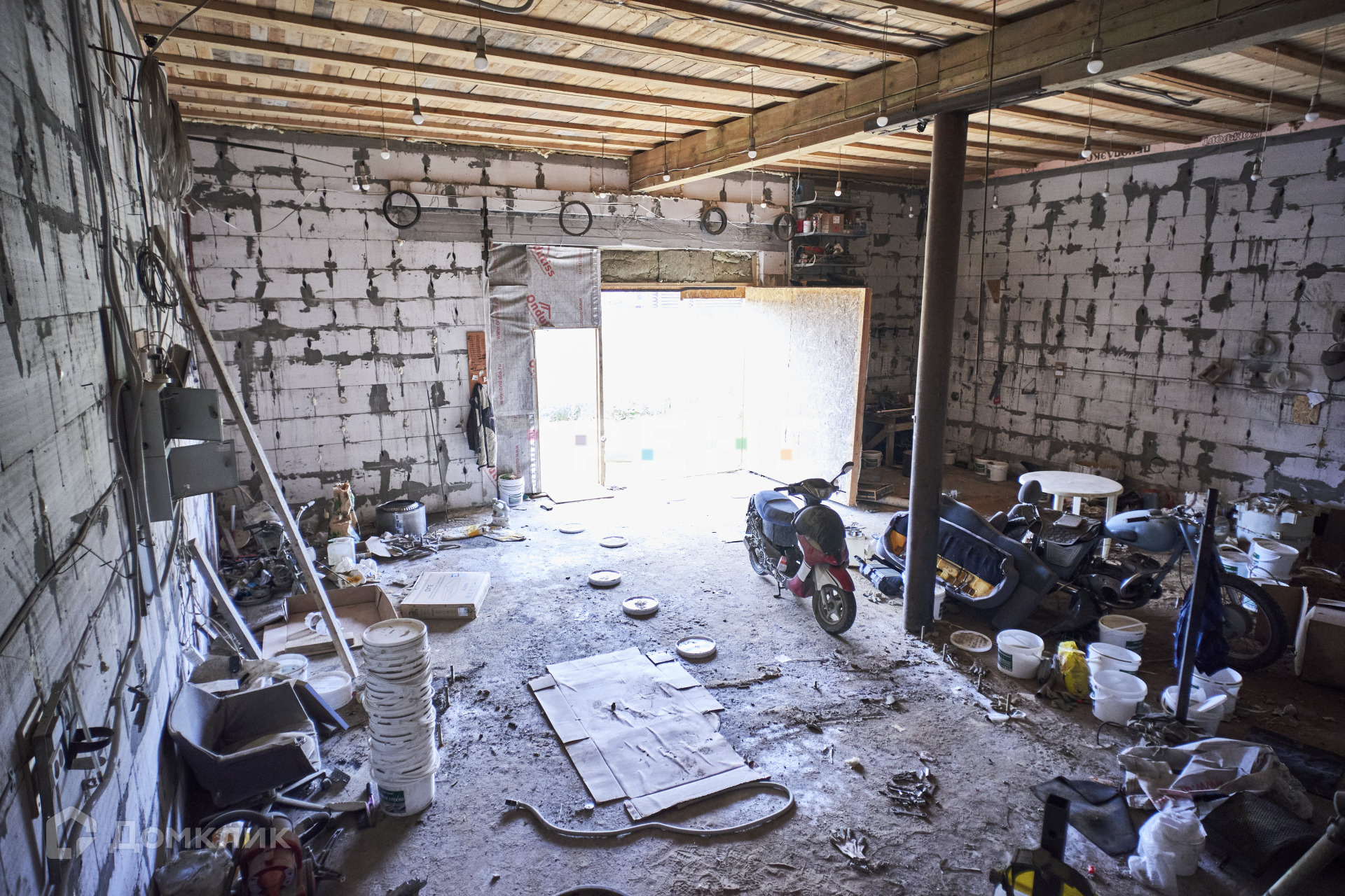 Окон на первом этаже нет, есть ворота 3.75*3, перегородок на первом этаже нет, только столб по центру. Из всех коммуникаций проведены электричество и интернет.