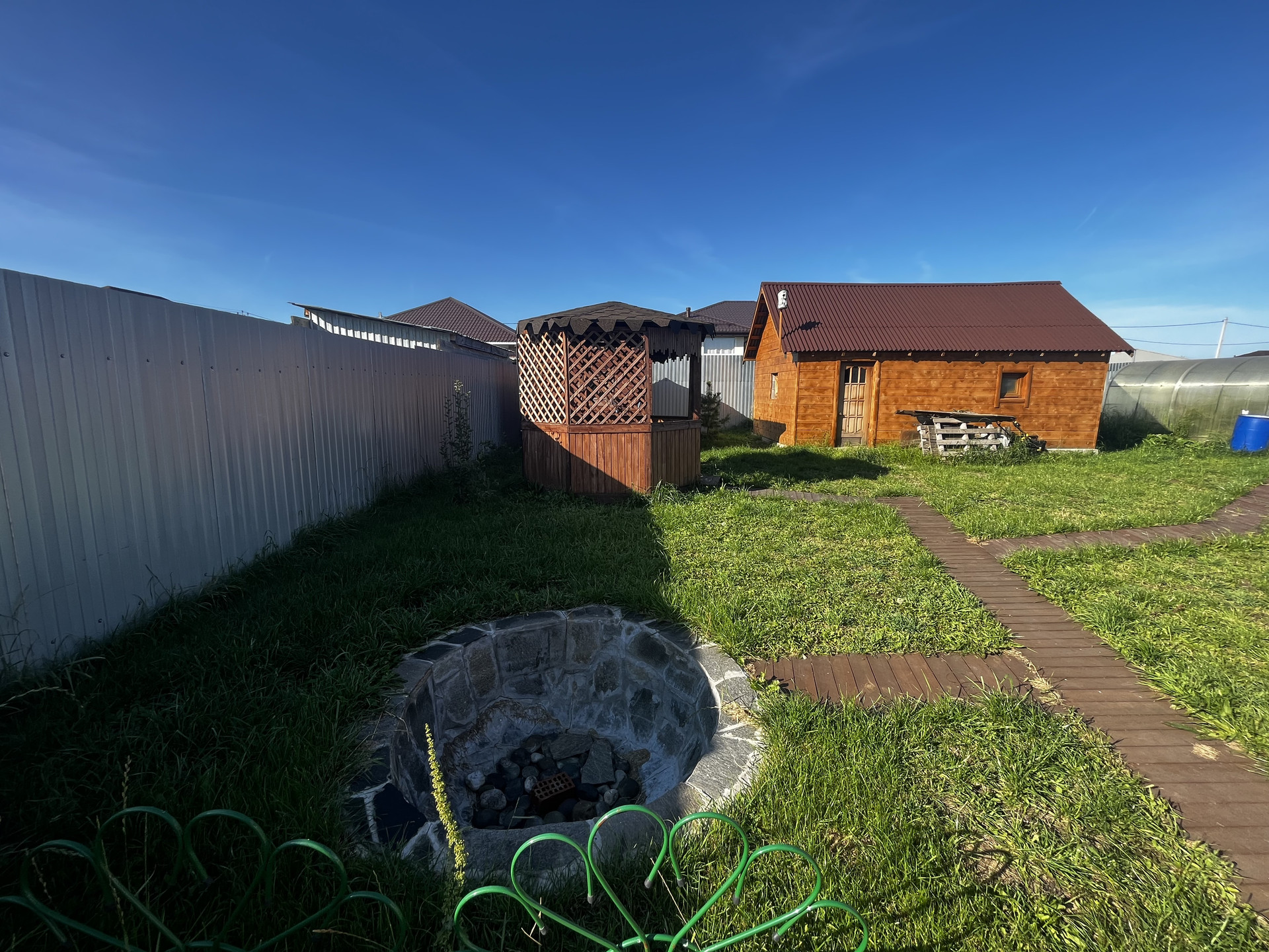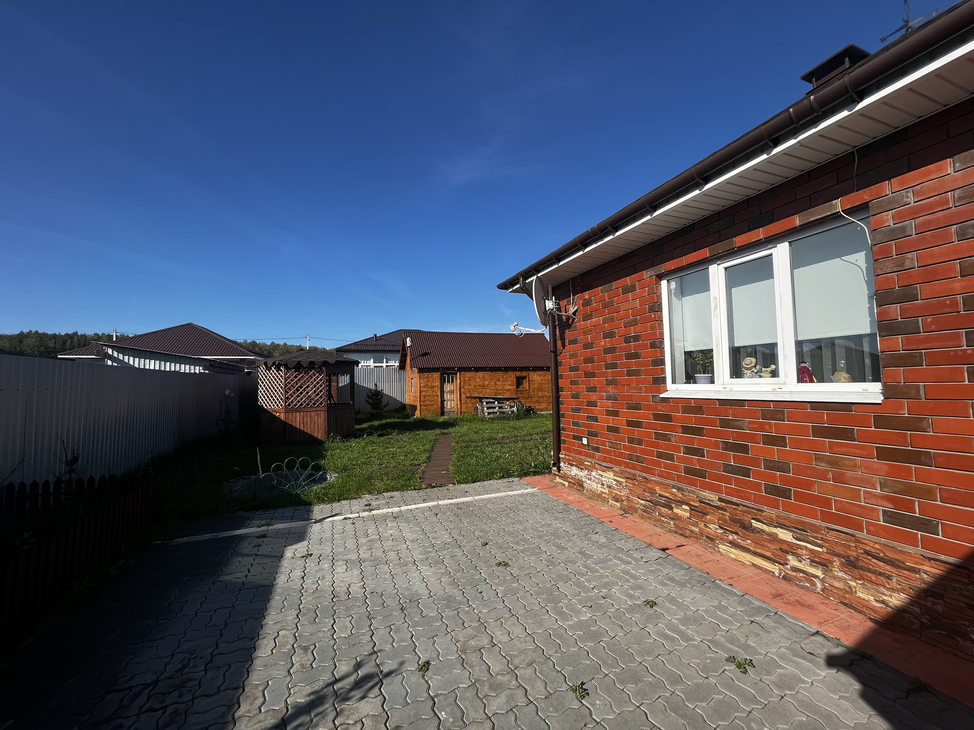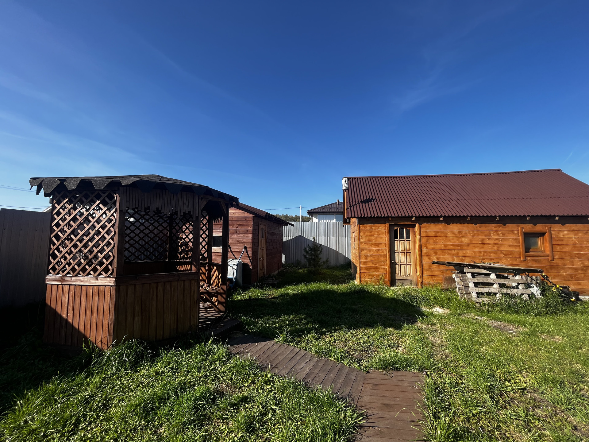 Коттедж и участок полностью благоустроены и оснащены всем необходимым для комфортного проживания. На территории участка есть сад, беседка, зона барбекю, гараж, крытая парковка, а также здания для бани и хозяйственных построек. Также есть теплица и проведён водопровод.