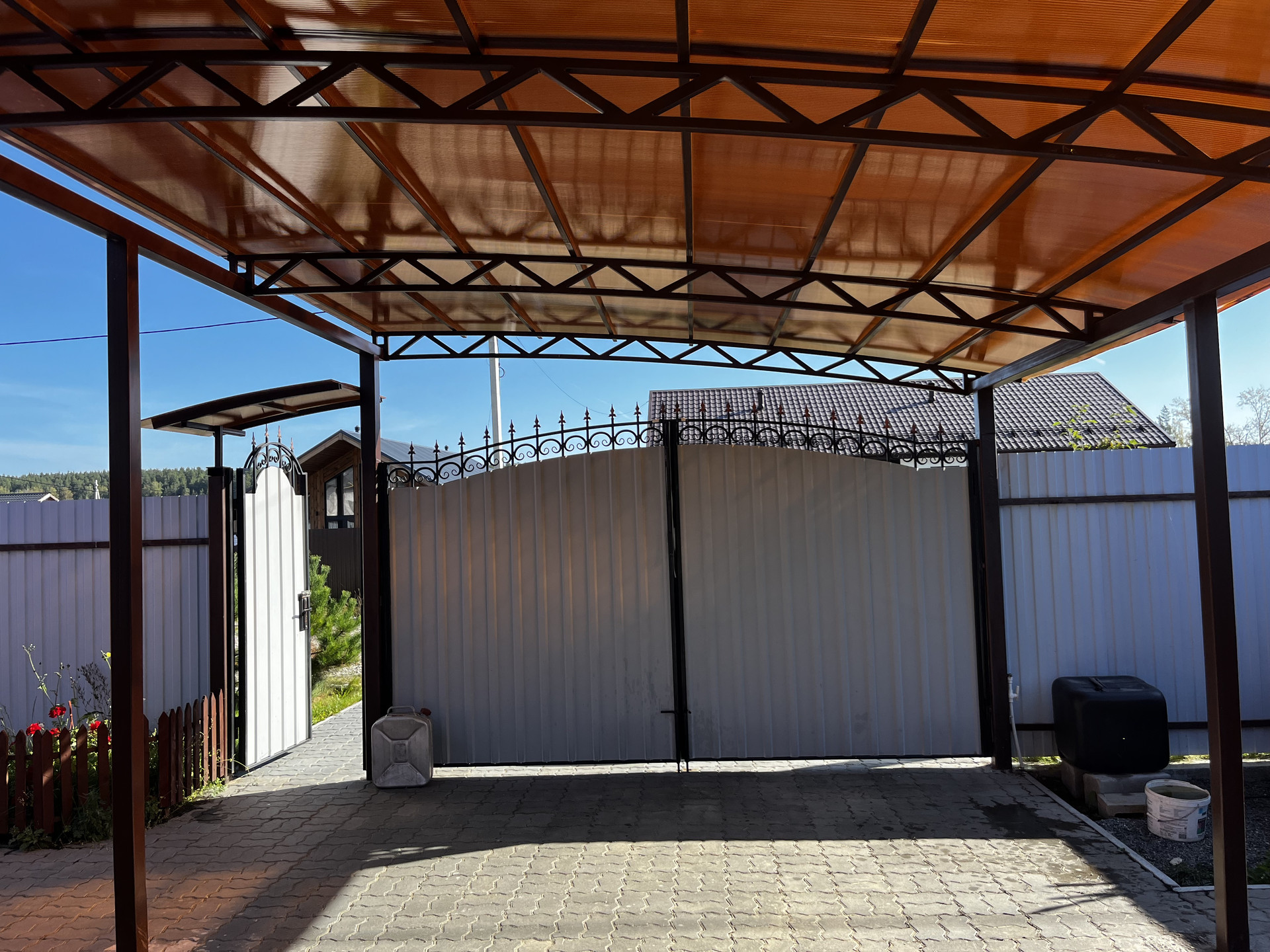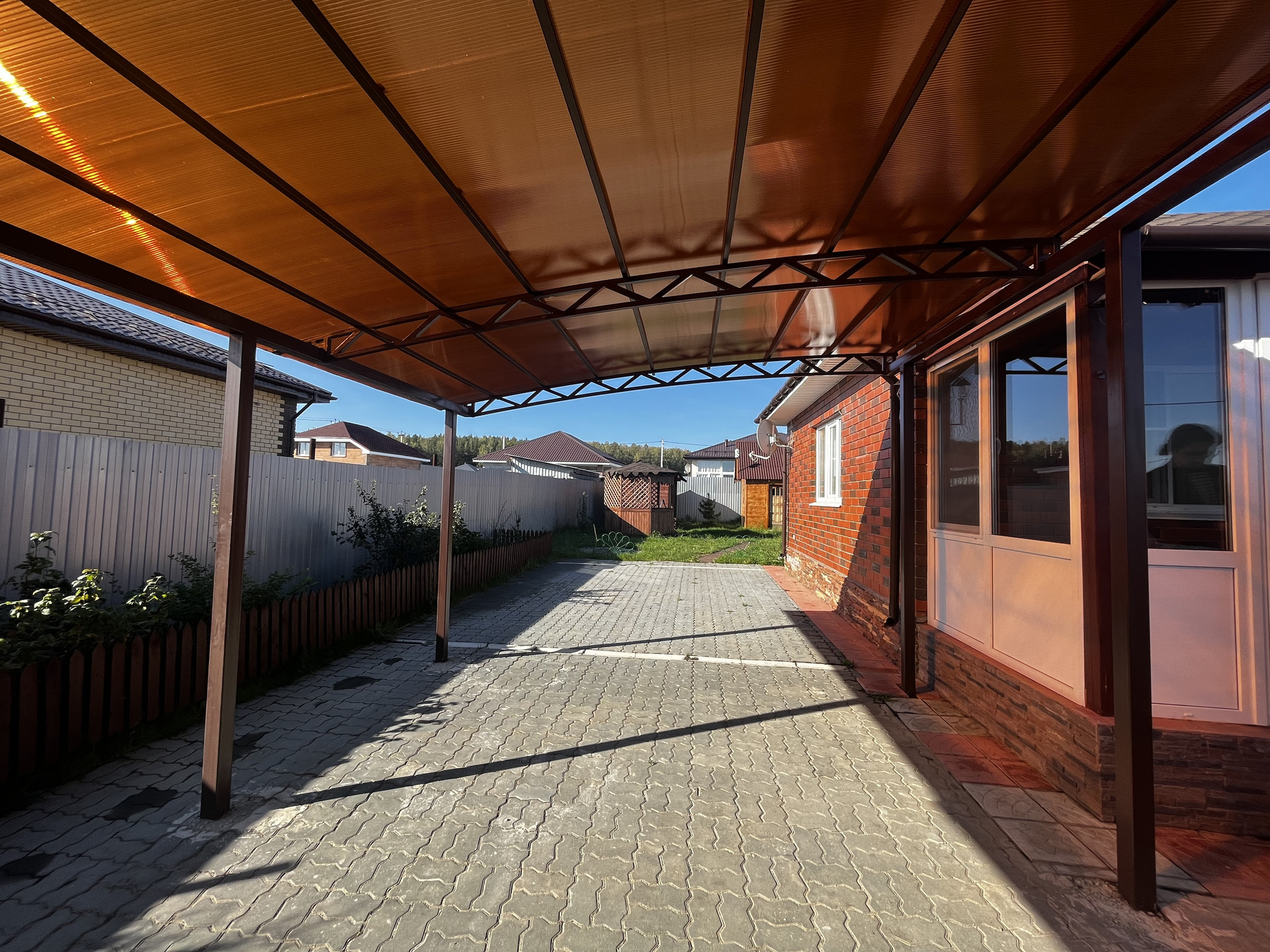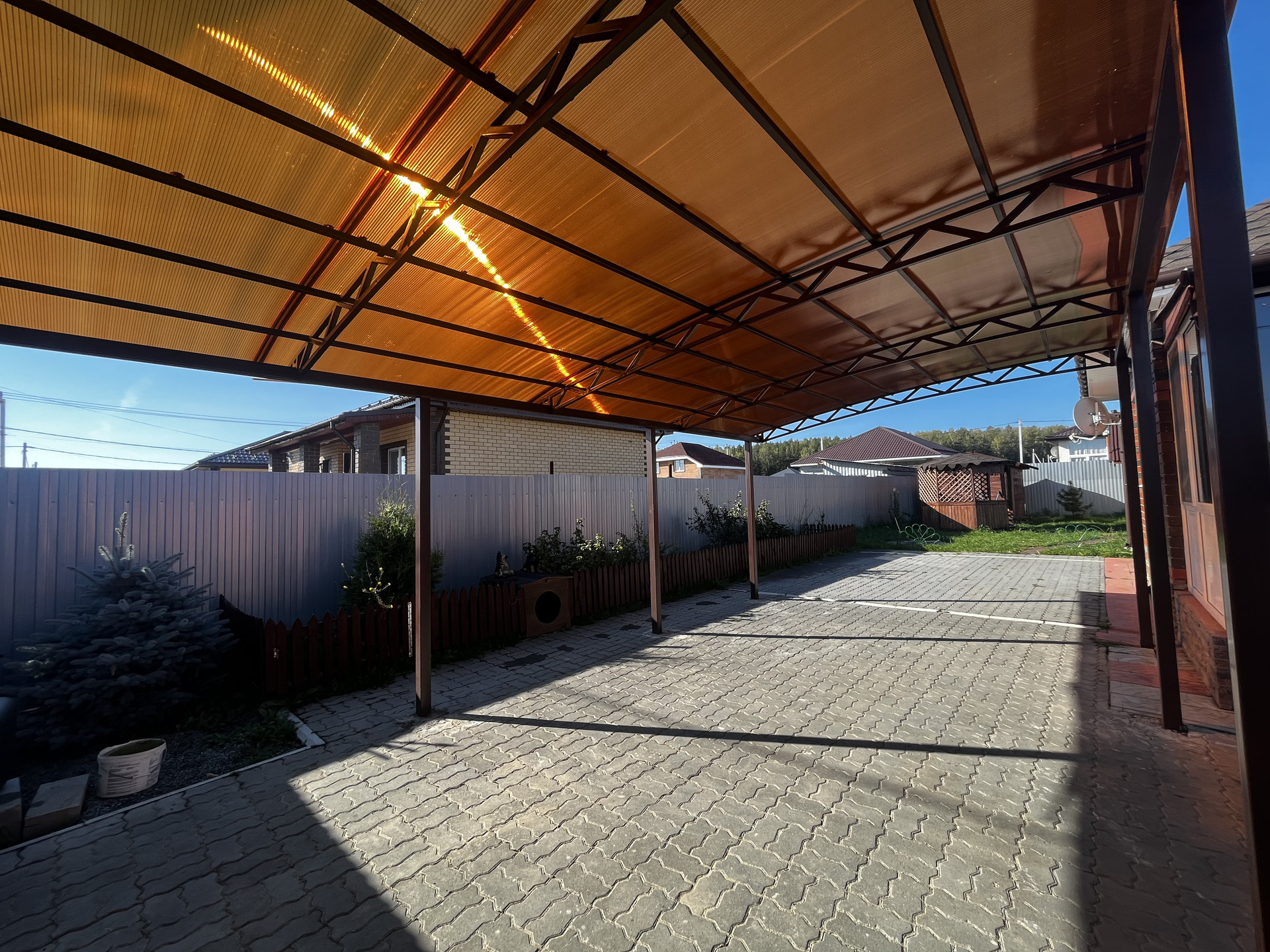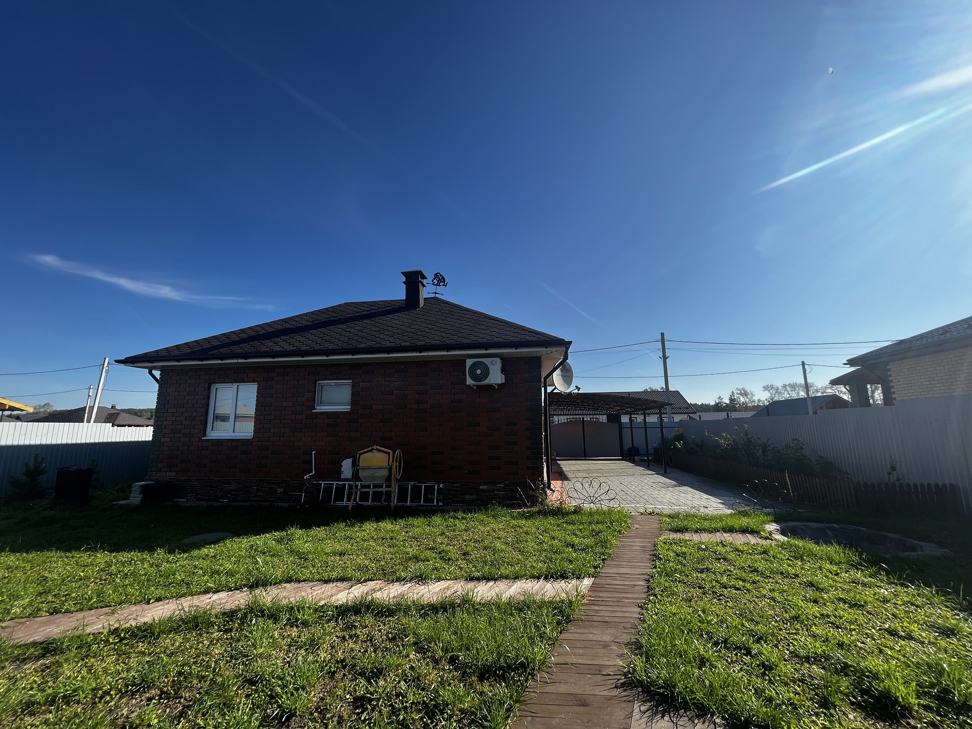Коттедж и участок полностью благоустроены и оснащены всем необходимым для комфортного проживания. На территории участка есть сад, беседка, зона барбекю, гараж, крытая парковка, а также здания для бани и хозяйственных построек. Также есть теплица и проведён водопровод.
