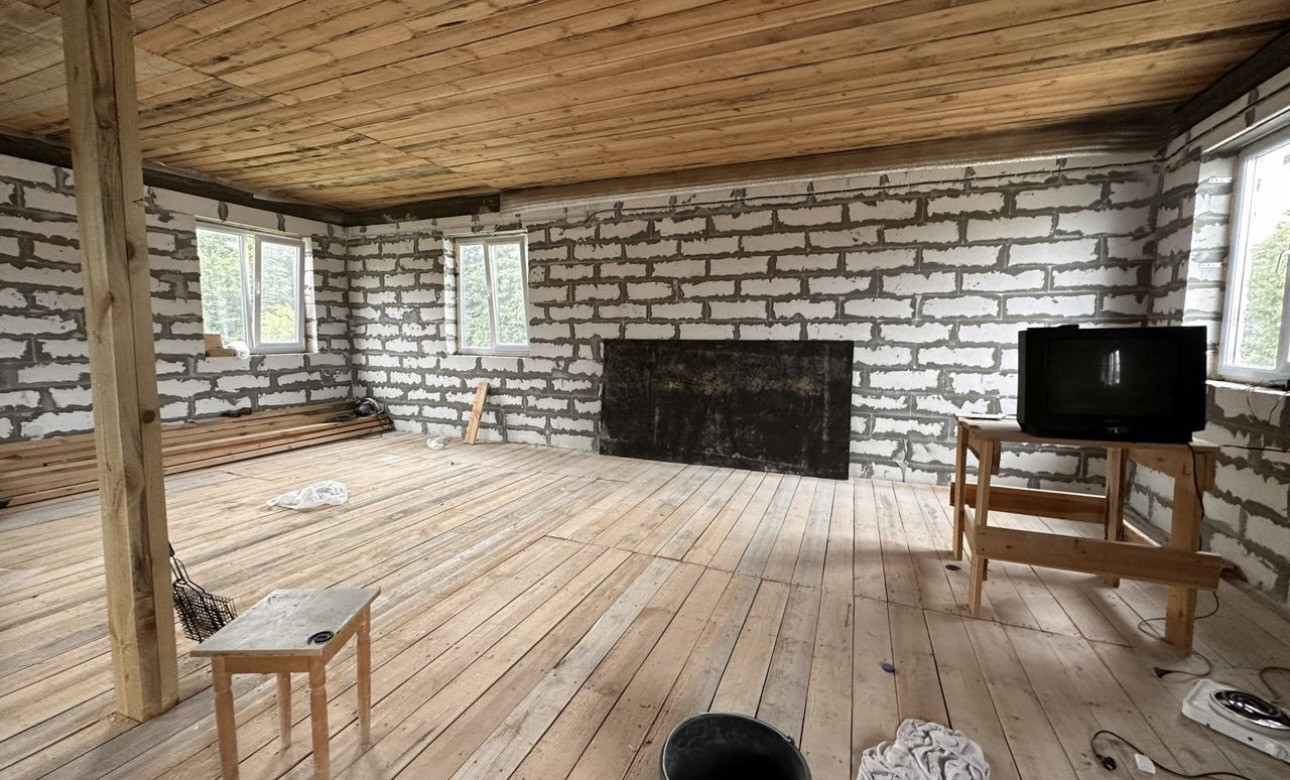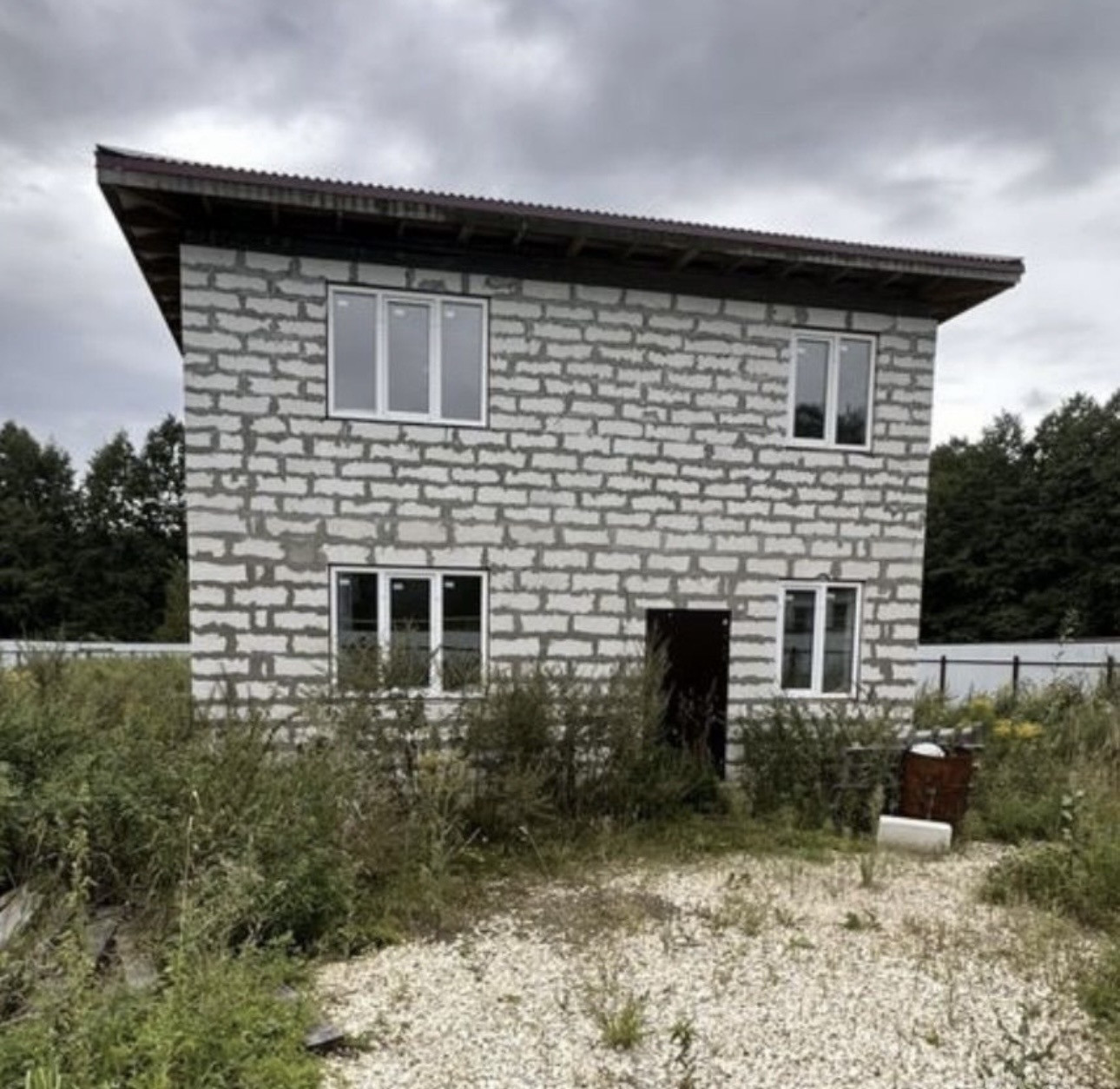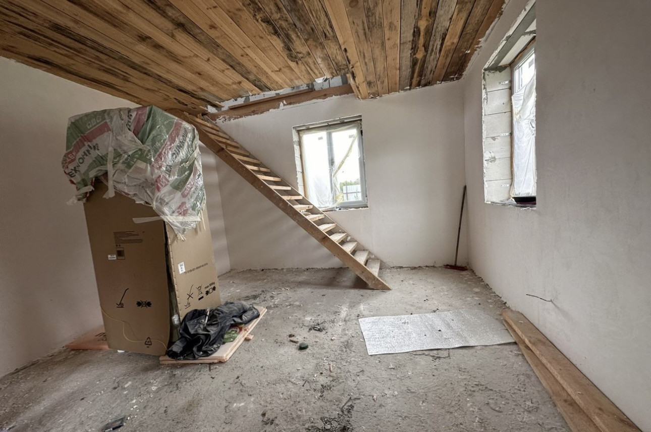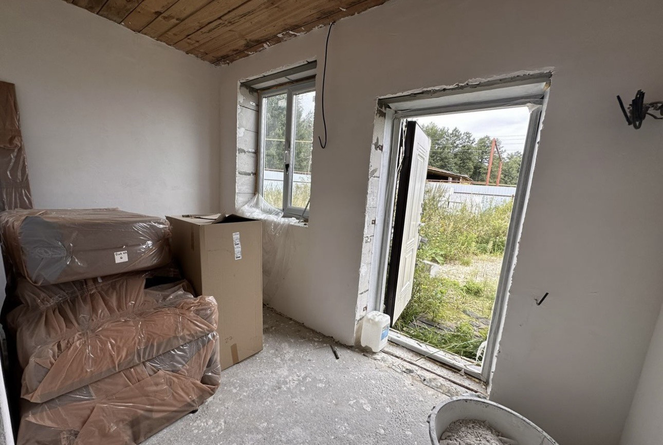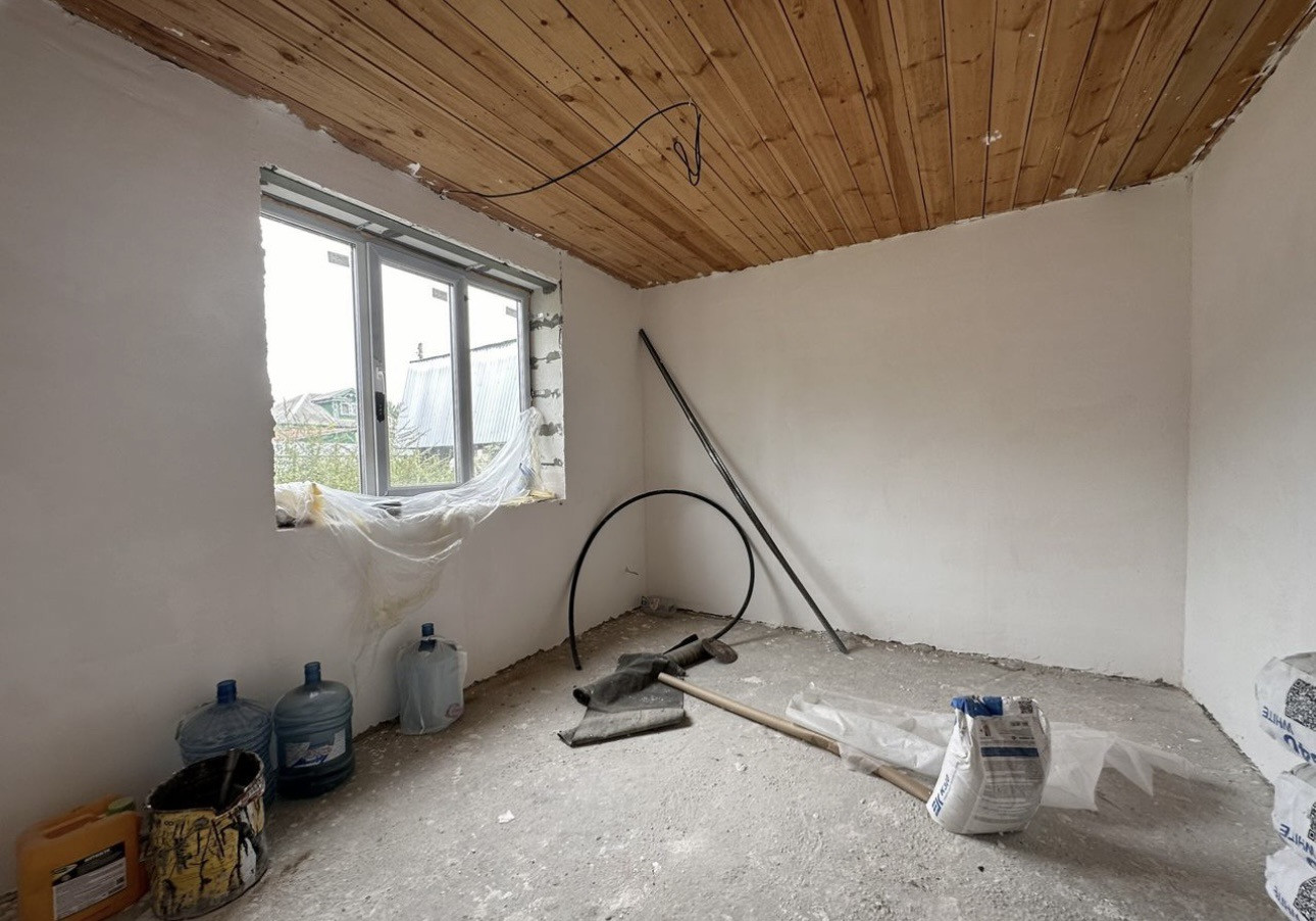 Фундамент монолитная плита, пластиковые окна, входные двери с термо разрывом, перекрытие деревянные, крыша 4 х скатная Металлочерепица. По ремонту: начали делать, на первом и втором этаже проведена провода, первый этаж отштукат