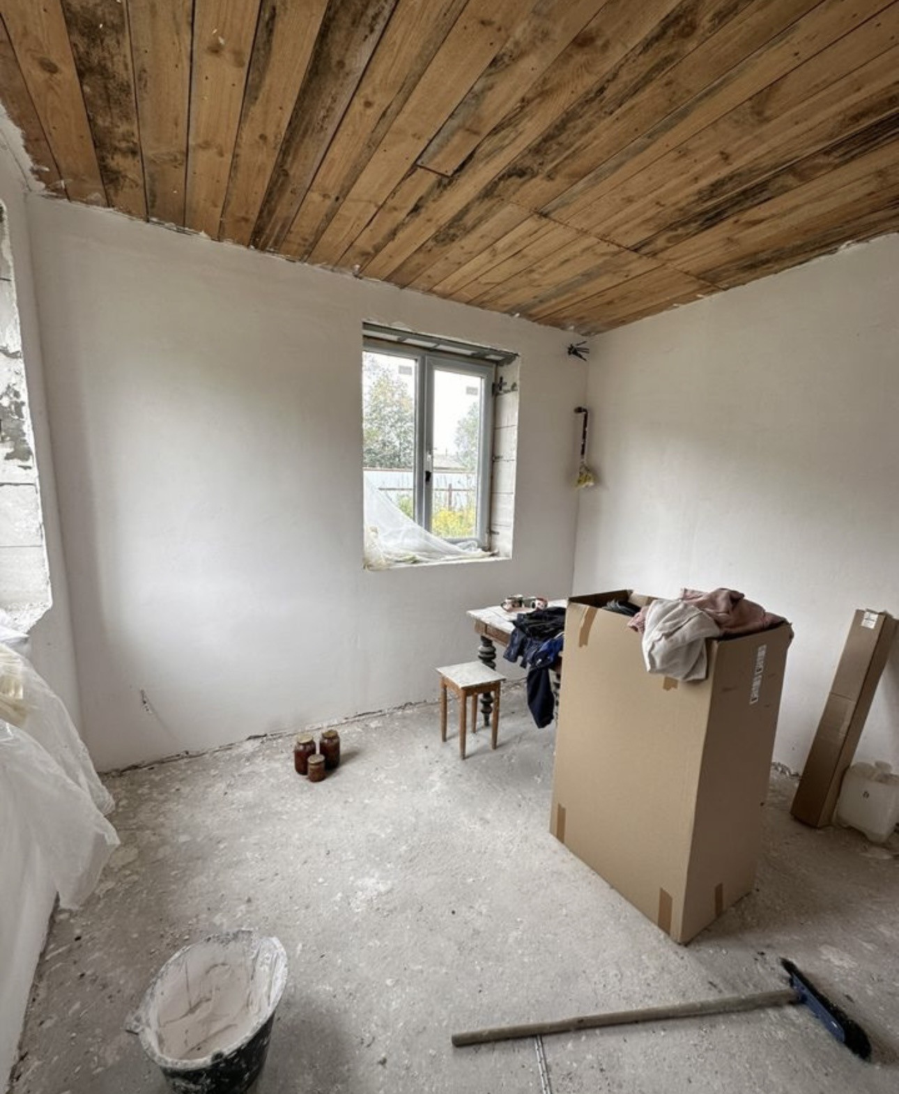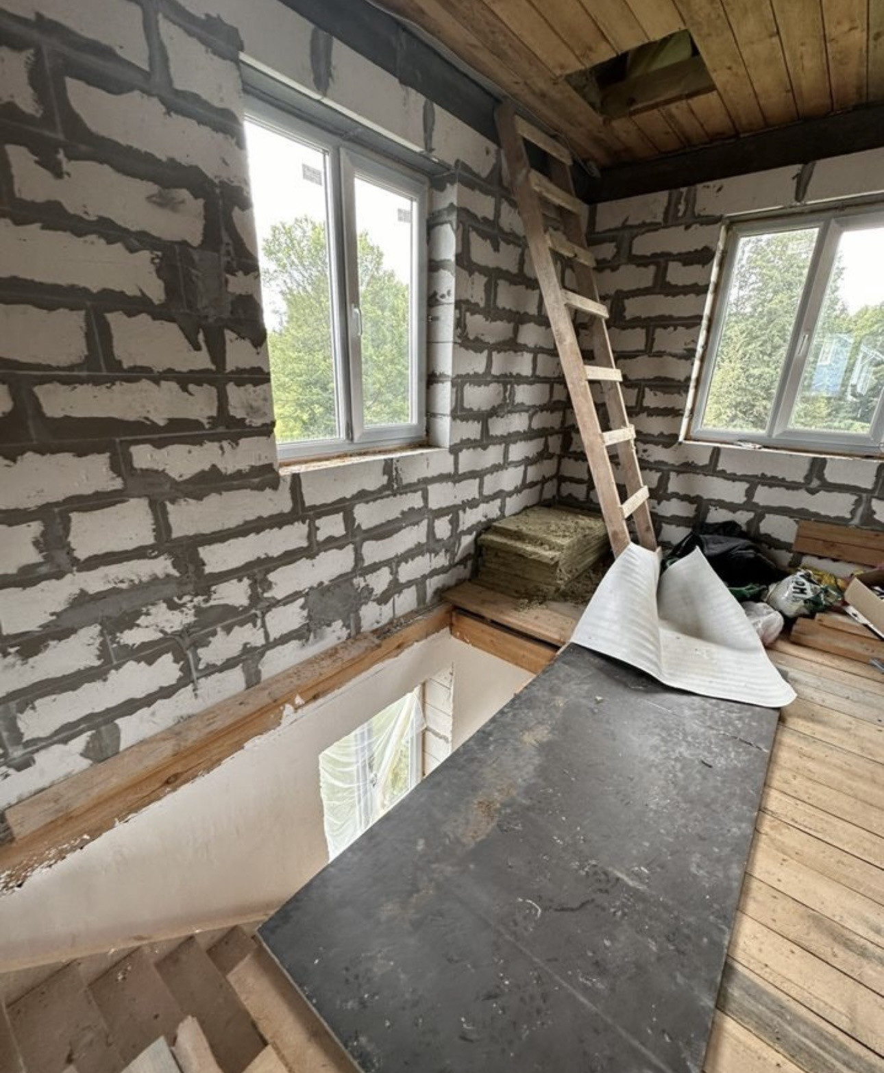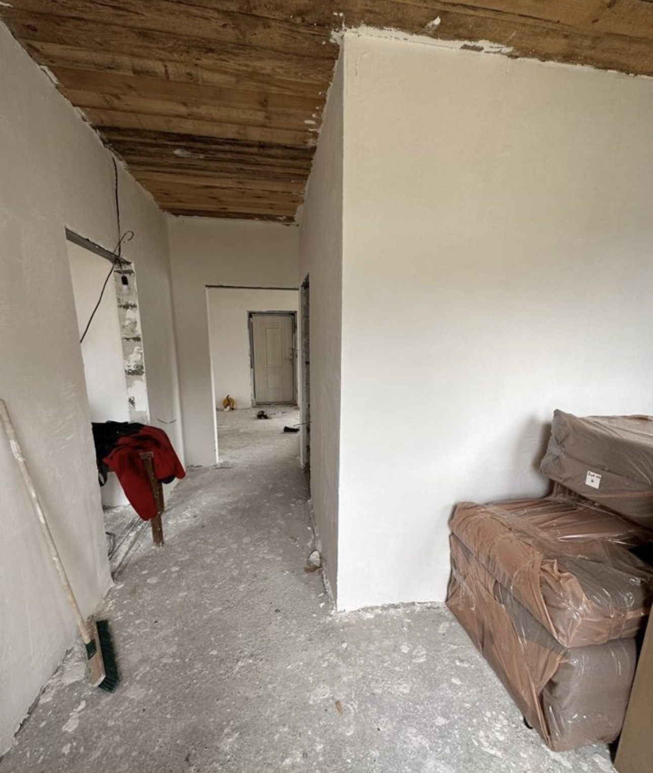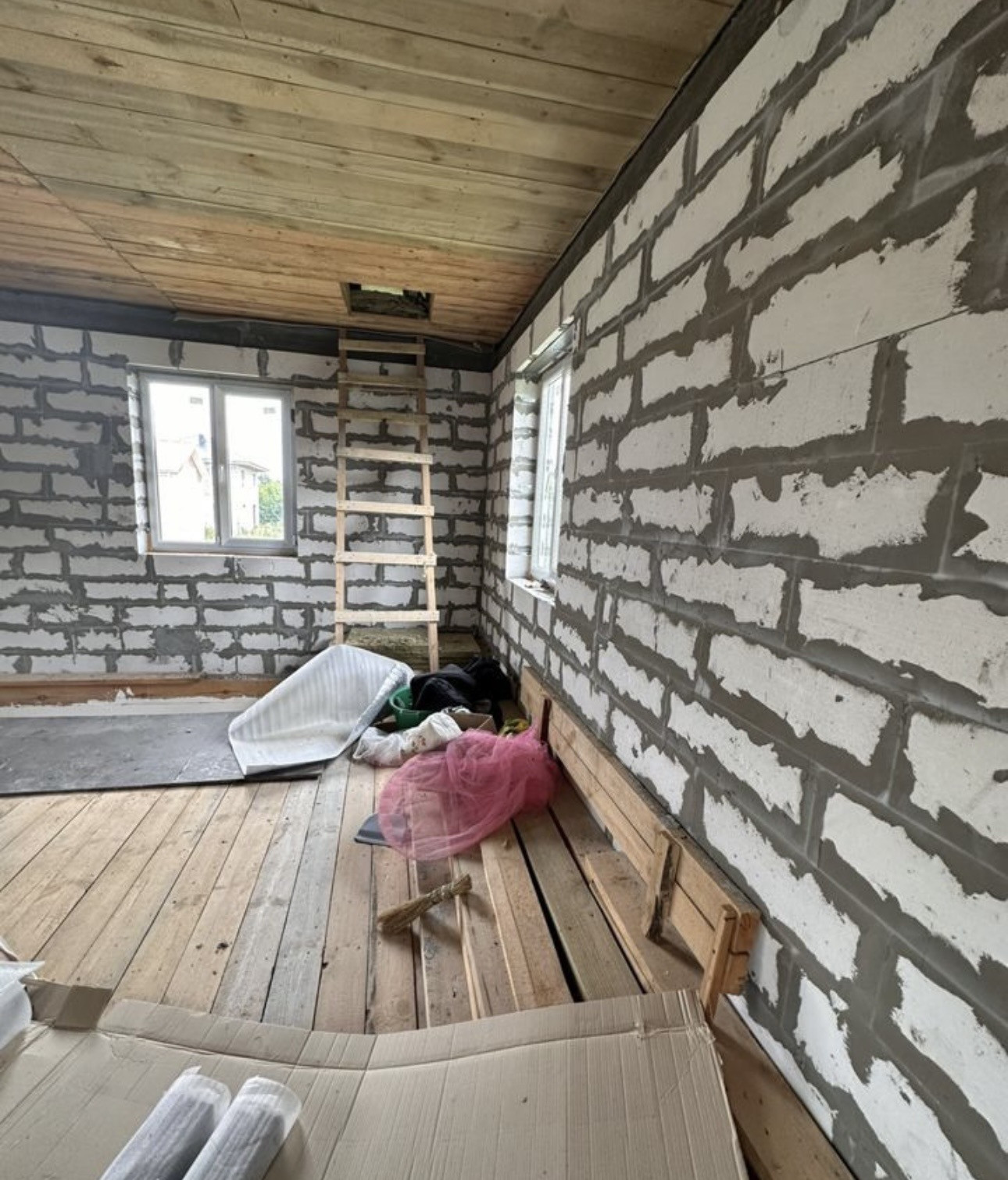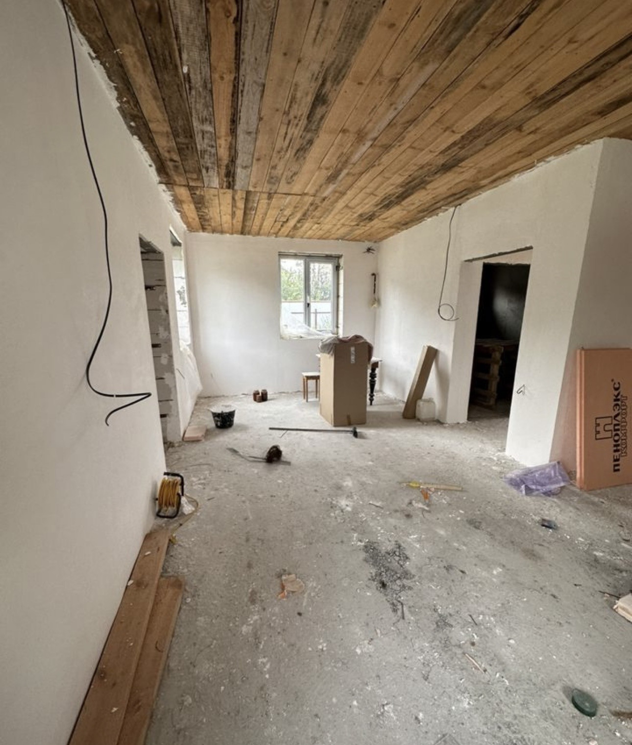 Фундамент монолитная плита, пластиковые окна, входные двери с термо разрывом, перекрытие деревянные, крыша 4 х скатная Металлочерепица. По ремонту: начали делать, на первом и втором этаже проведена провода, первый этаж отштукат