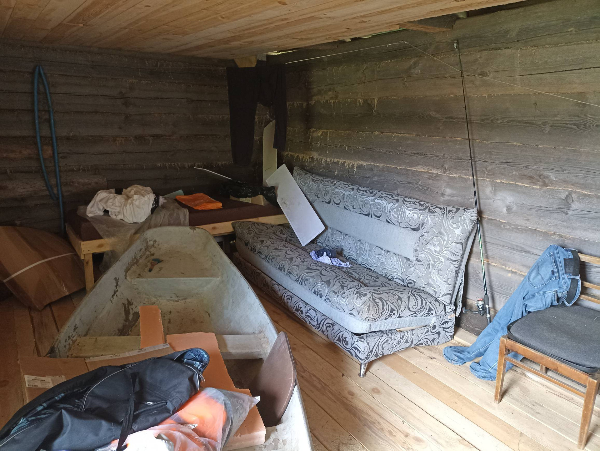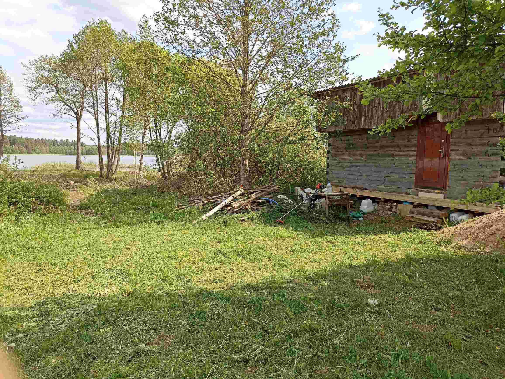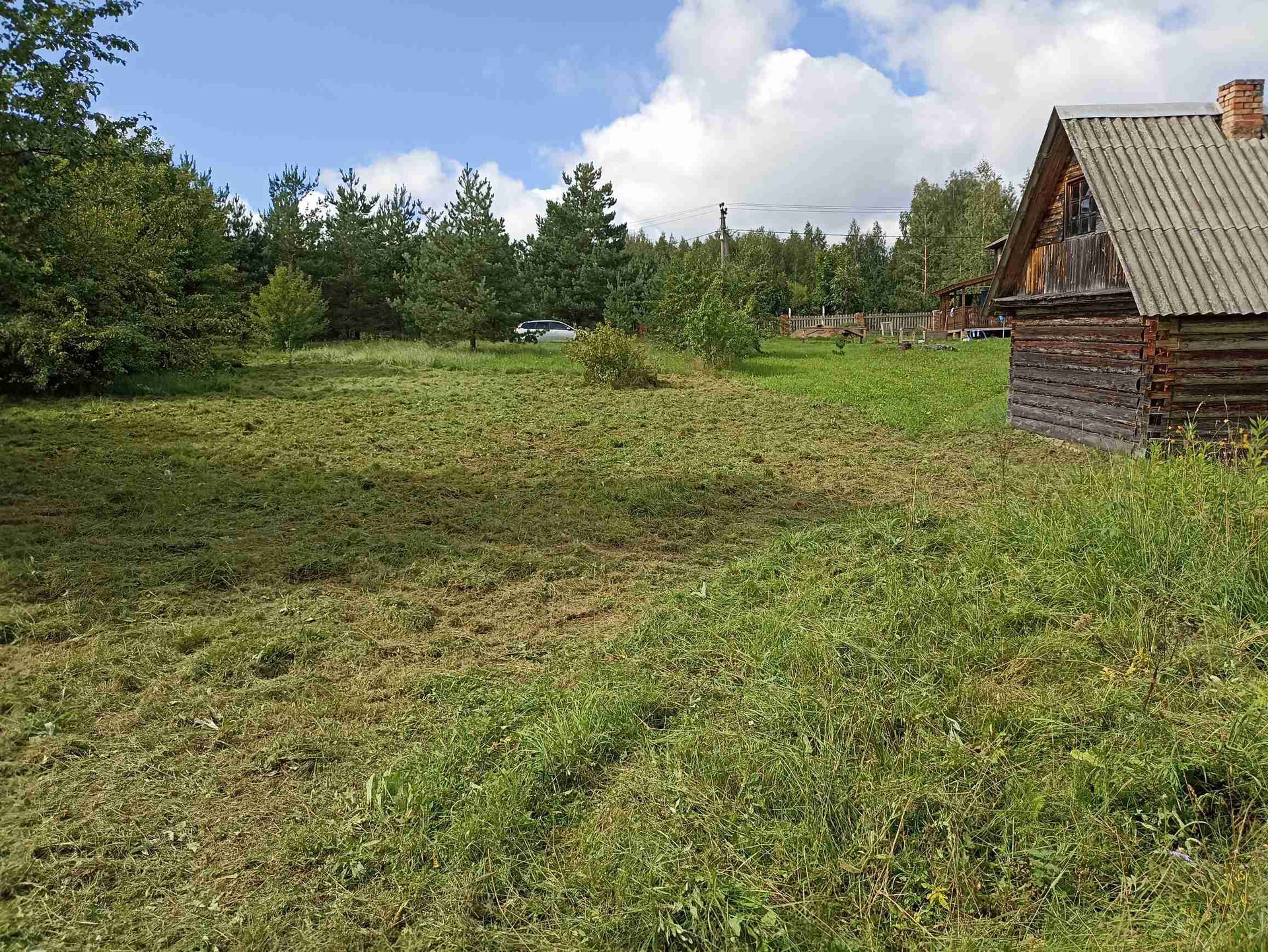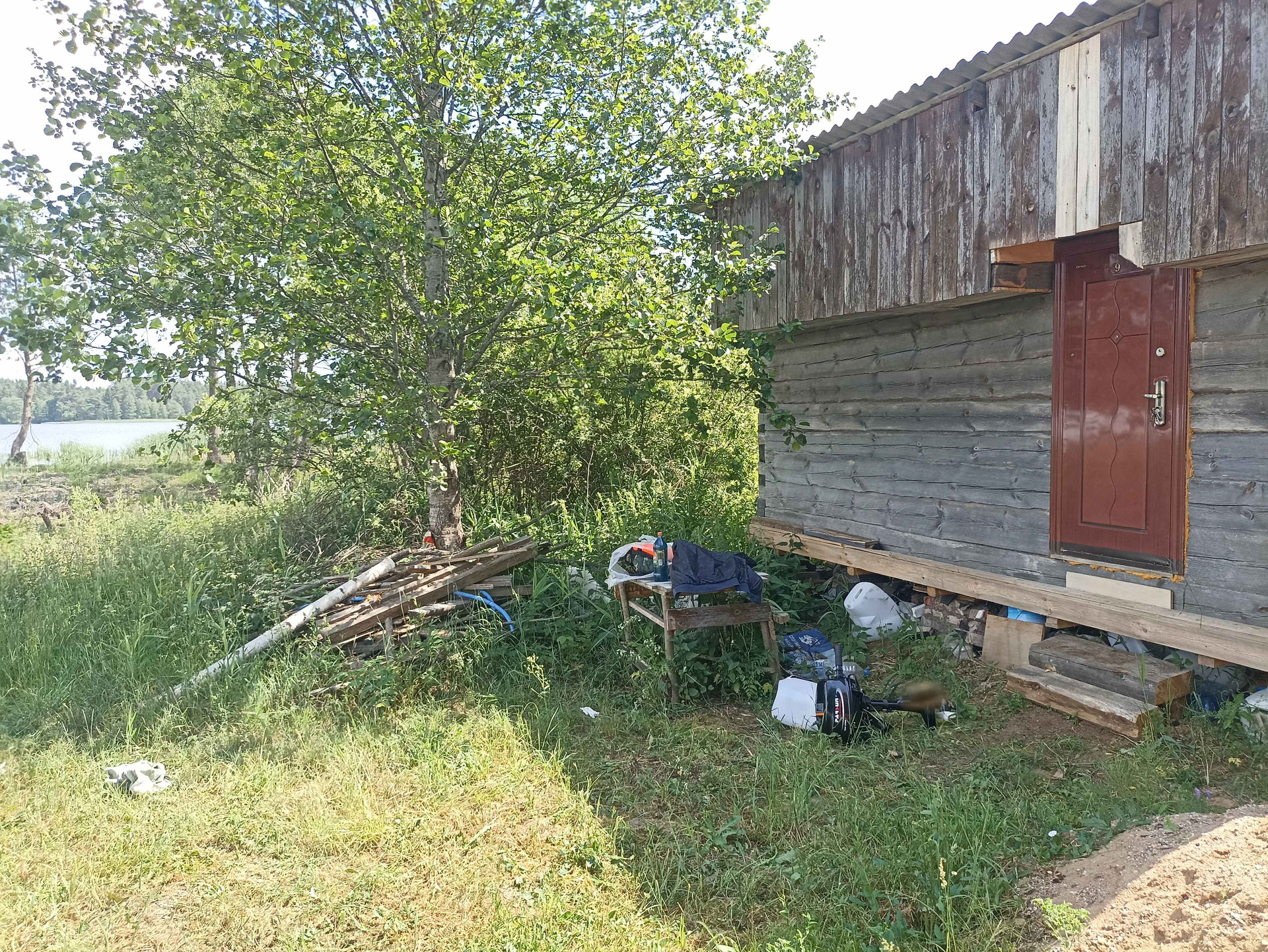 1.На участке хозпостройка 25 м кв, из сруба (не каркасник) размером 6,3*4,0 м. Внутри лодка. Металл дверь (два замка), ПВХ окно (с москитной, новое), пол 50 мм по лагам 150 мм. Для декоративной обшивки доска на обрешетку завезена. Можно оперативно строить дом - есть где разместить материал, а также местные специалисты в Опухликах, срубят и поставят сруб дома.