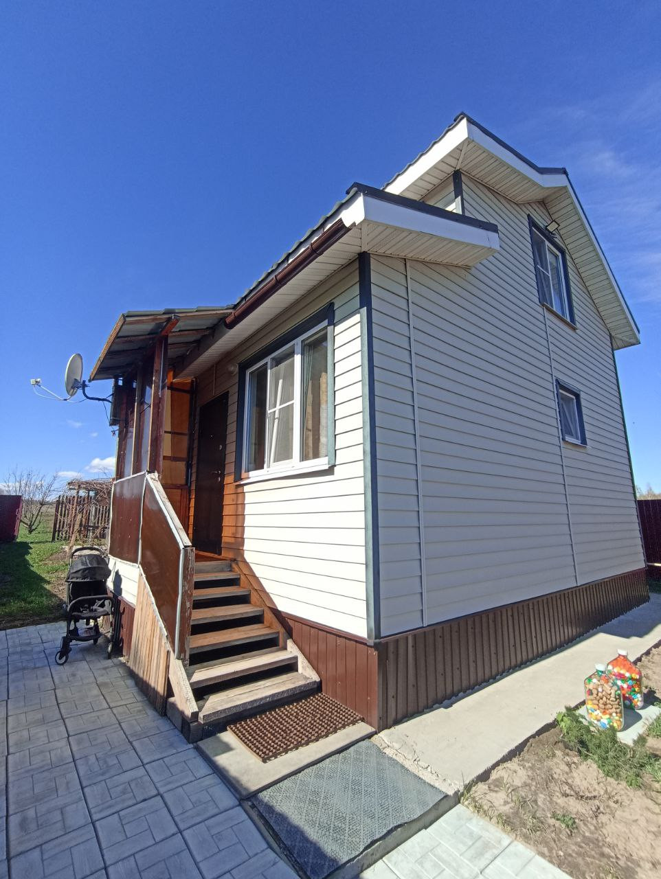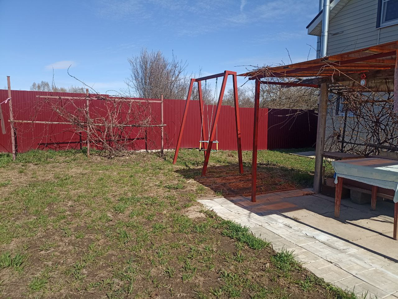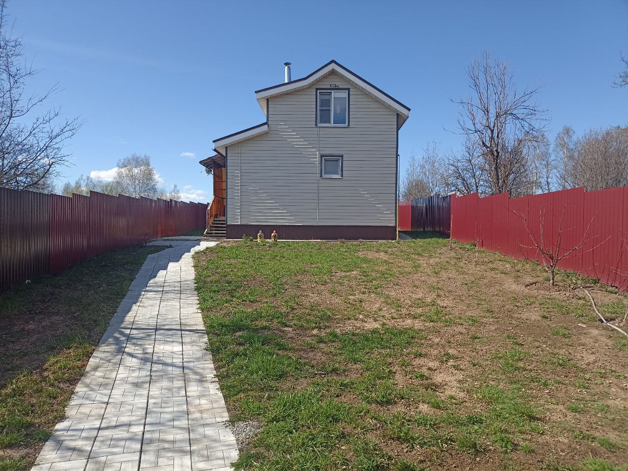 Большой огород, где растут плодоносящие деревья и кустарники (яблони, груши, малина, смородина, виноград), есть теплицы. Территория ухоженная - газонная трава, брусчатка, беседка, обвитая виноградной лозой, песочница для детей, качели. В деревне есть пруд, детская площадка.