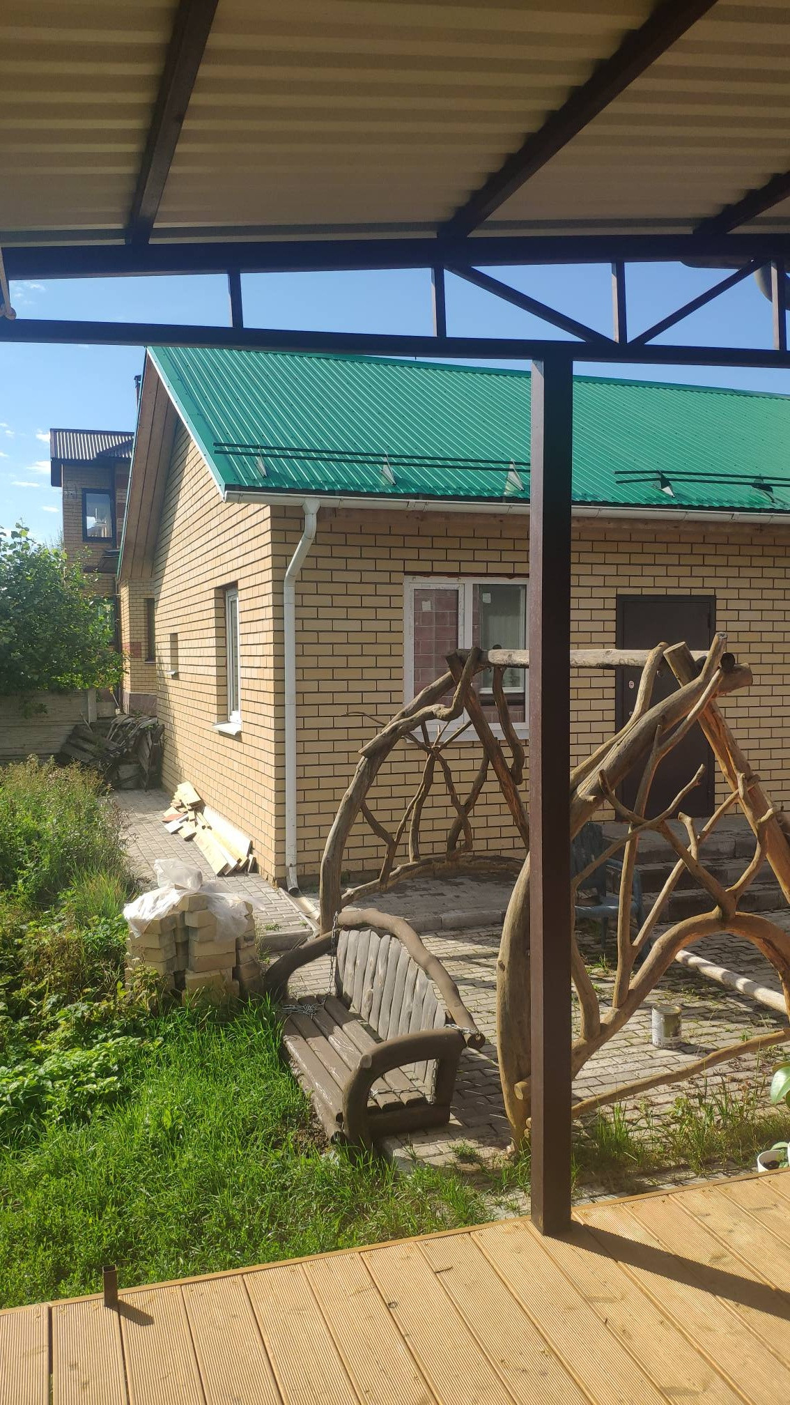 Есть новый гараж на две машины с дополнительным помещением для хозяйственных нужд.