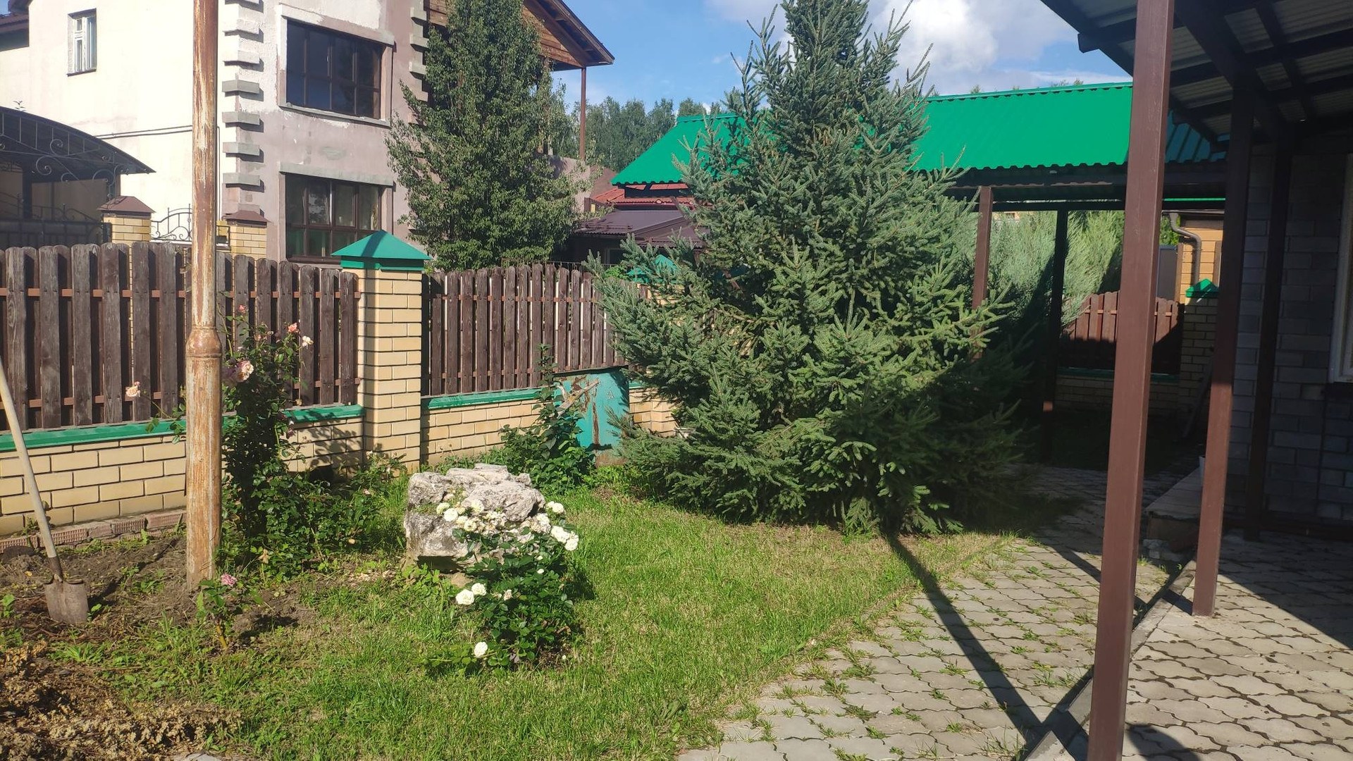 Перед домом брусчатка переходящая в зеленую зону с красивыми цветами и вечнозелеными деревьями.