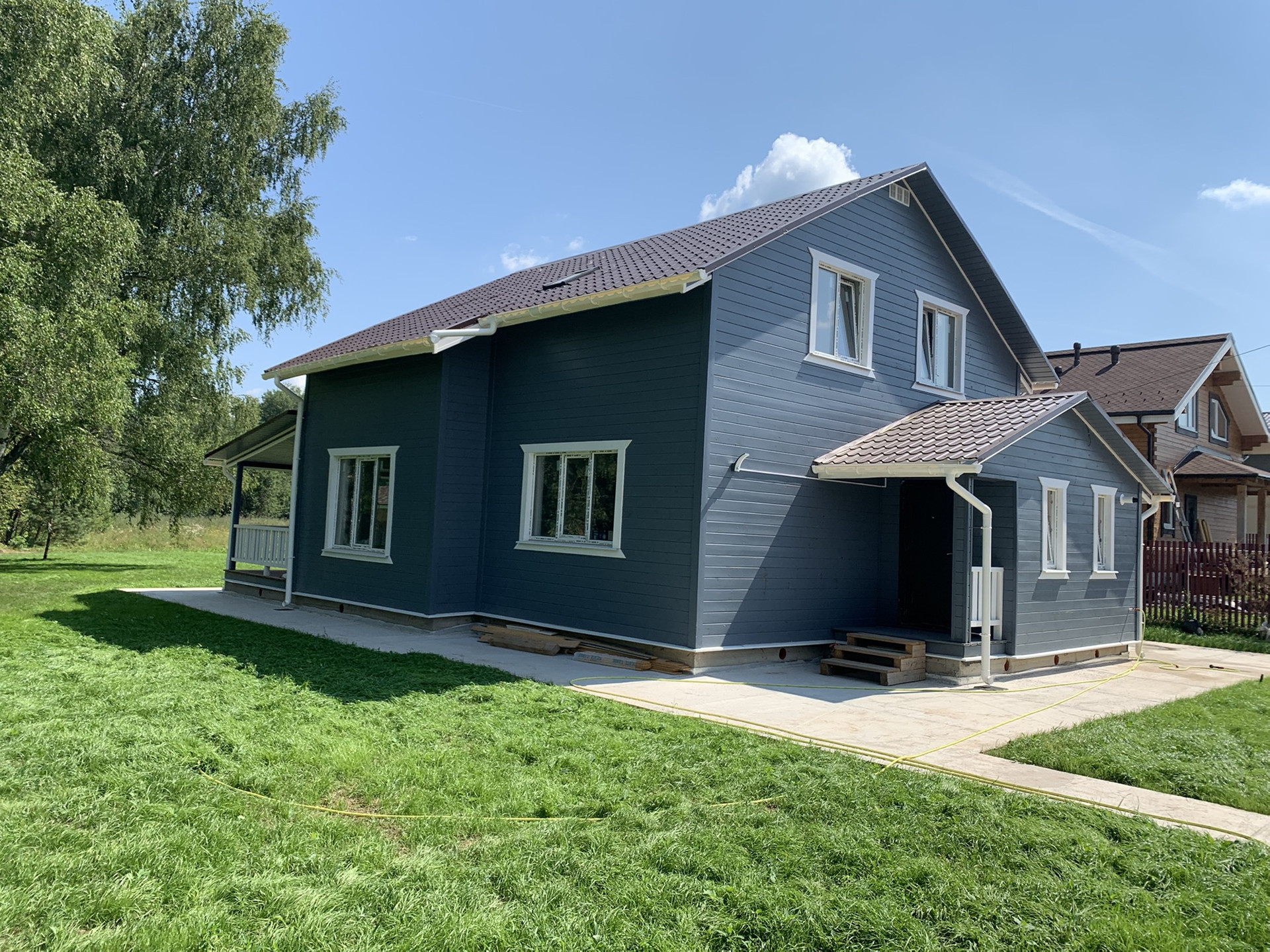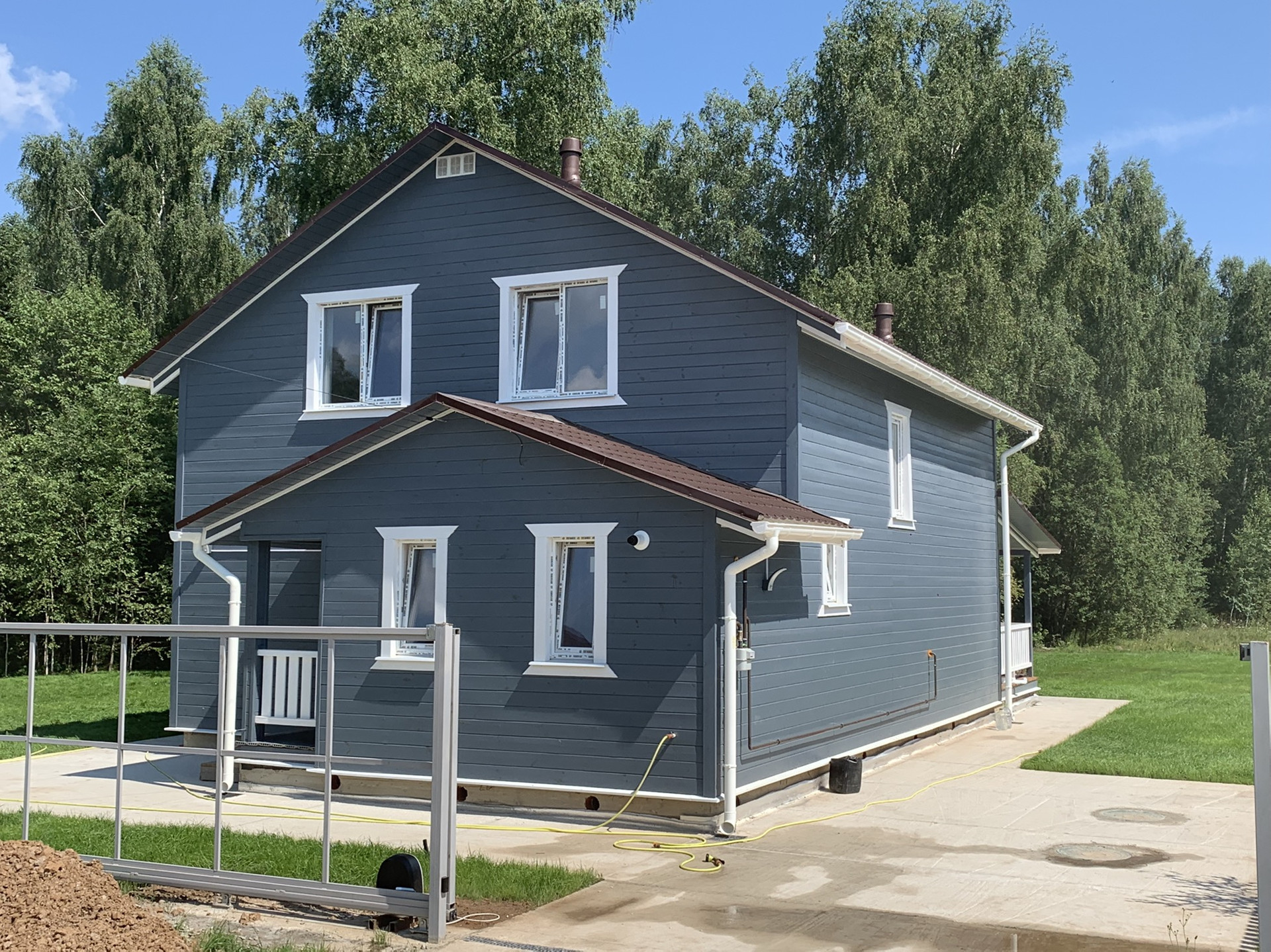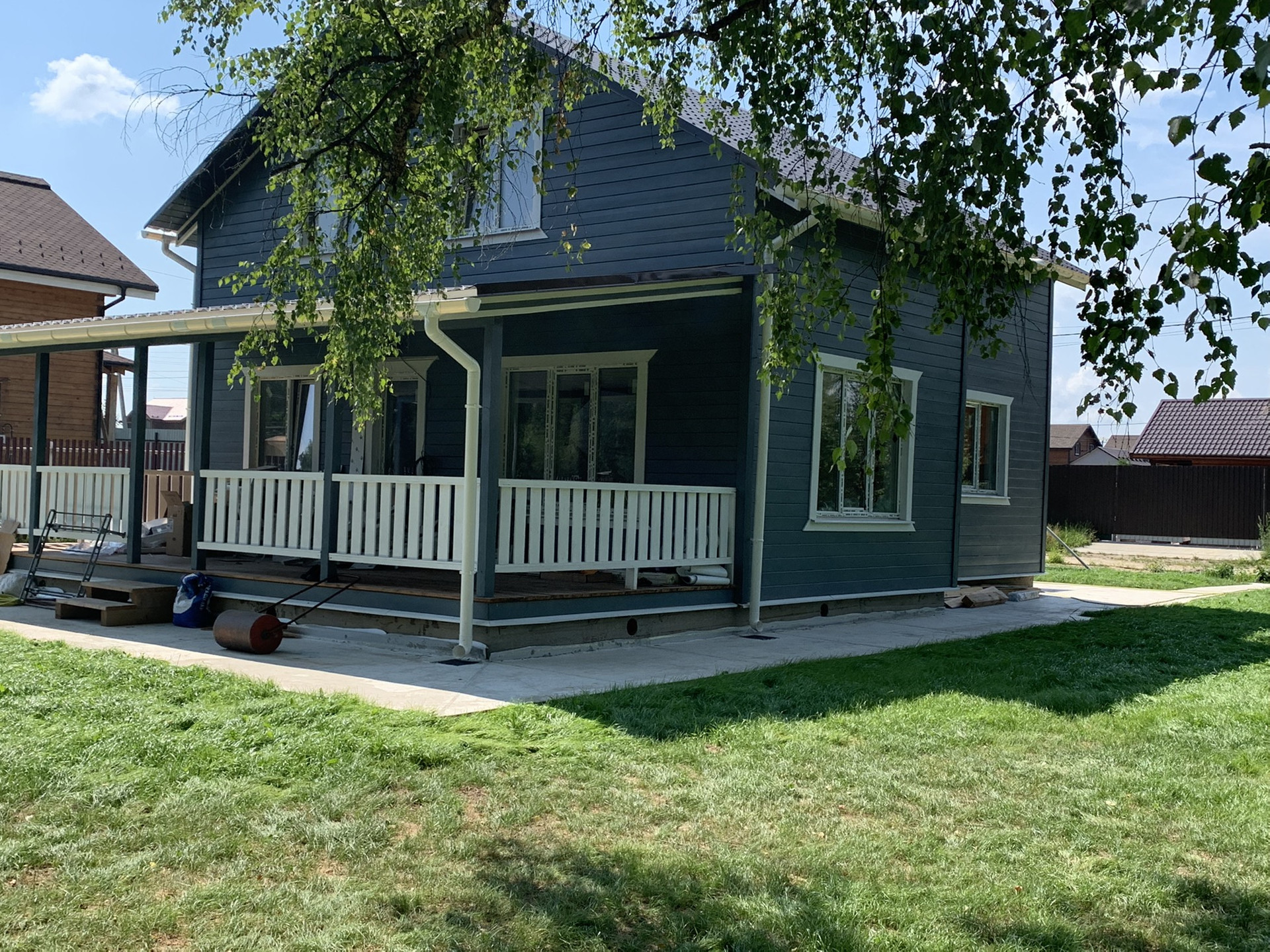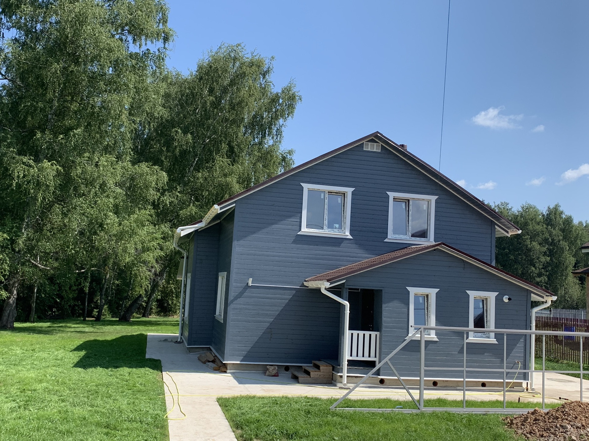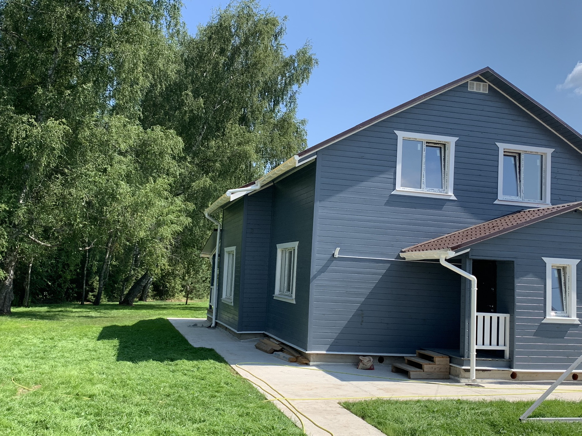 Оборудована отмостка вокруг дома и стоянка для автомобиля.