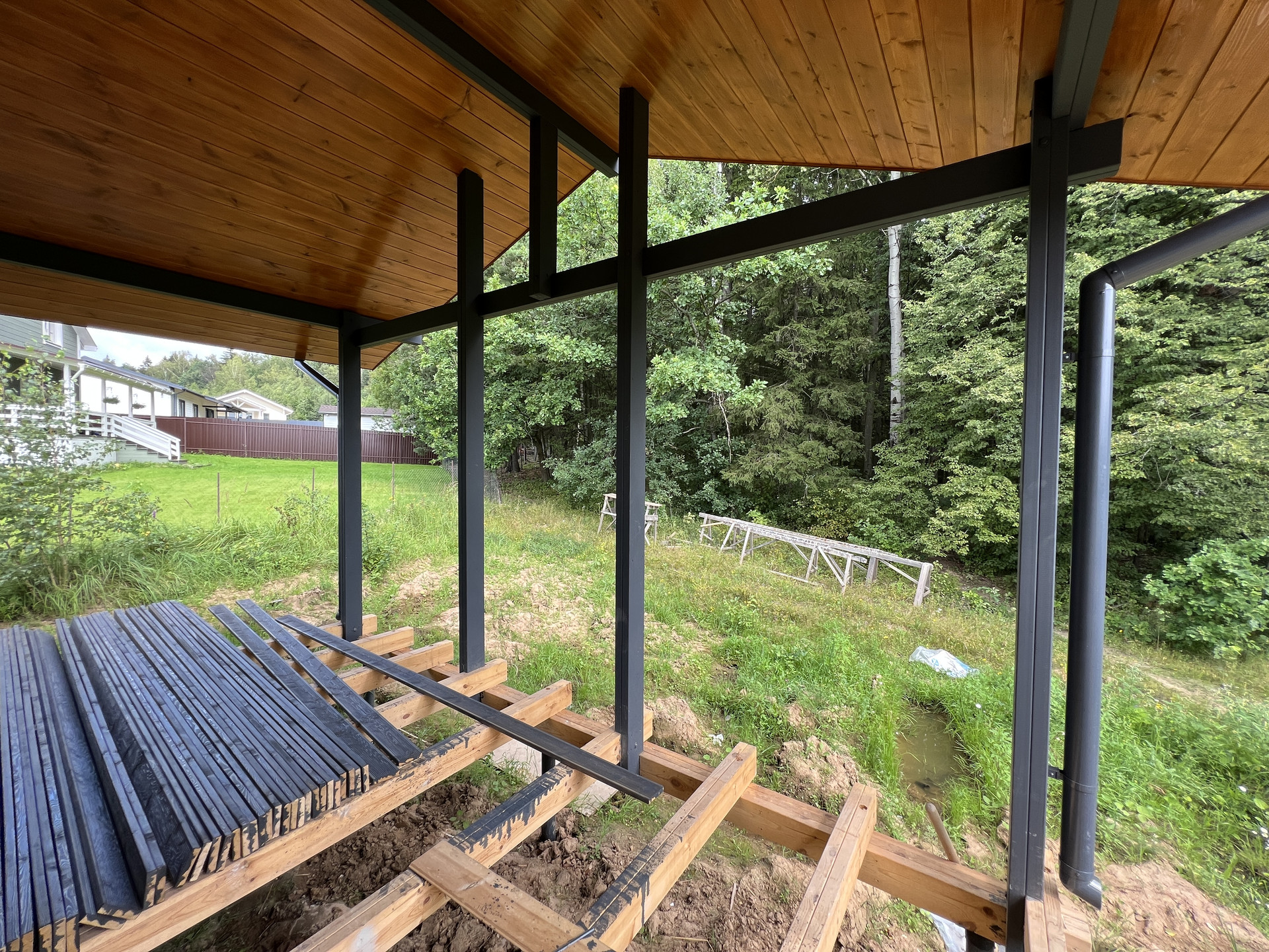 Забор - штакетник / рабица; оборудована отмостка вокруг дома и стоянка для автомобиля.