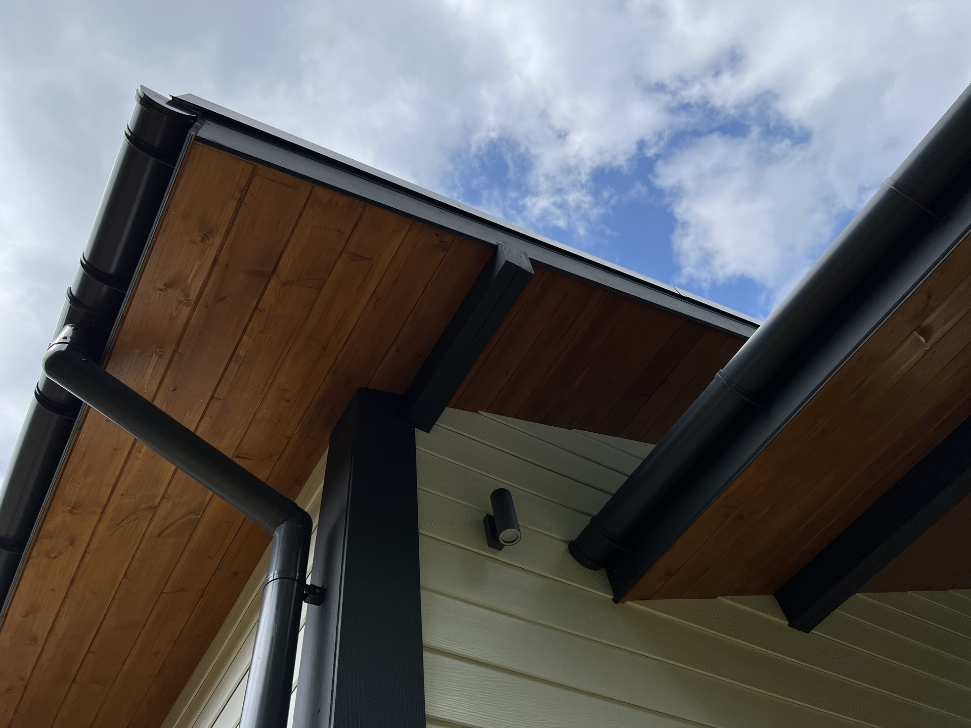 Внешняя отделка дома - фиброцементный сайдинг DECOVER с декорирующими элементами из лиственницы, декоративная подсветка дома. Окна - двухкамерные стеклопакеты REHAU Delight 70 mm; Крыша - мягкая кровля; Крыша и фасад - вентилируемые; установлена водосточная система;