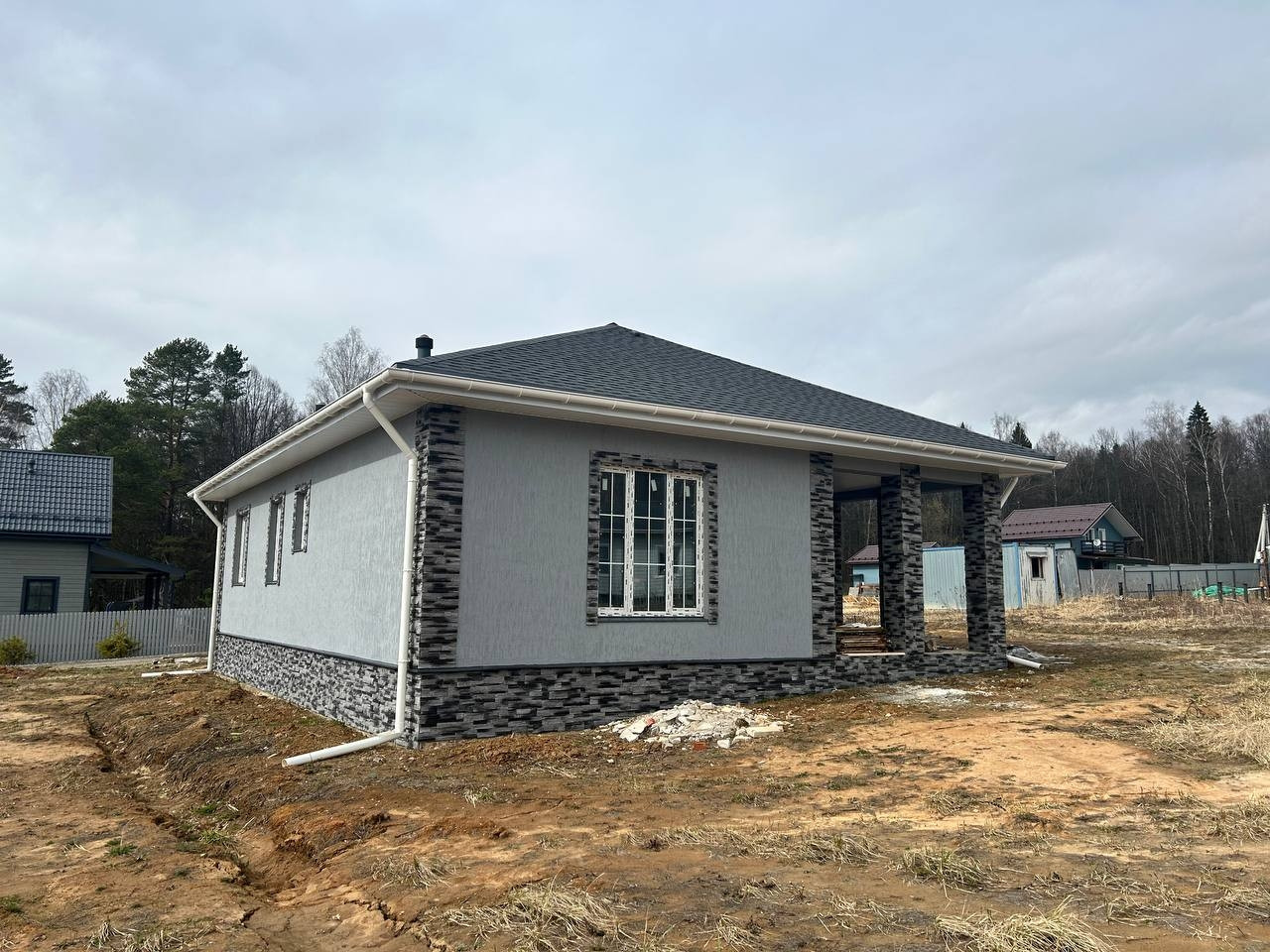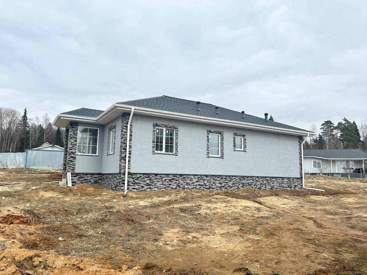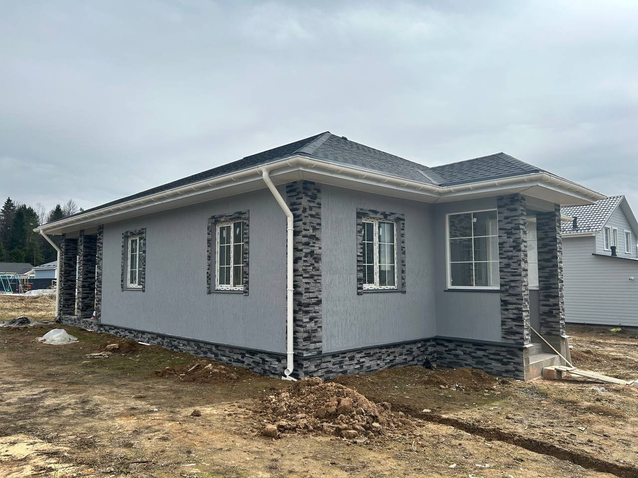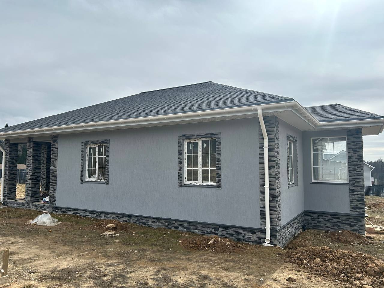 Материал дома: газобетонные блоки +утепление.; Межкомнатные перегородки - газобетонный блок; Фундамент – монолитная плита. Полы - плитка/ламинат; Внешняя отделка дома – фасадная декоративная штукатурка и кирпич; Внутренняя отделка дома - плитка/штукатурка/обои; Окна - двухкамерные стеклопакеты с раскладкой; Крыша - мягкая кровля; Установлена водосточная система.