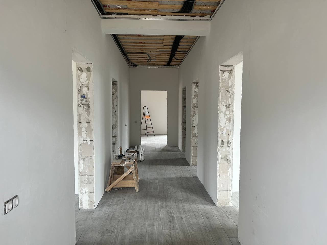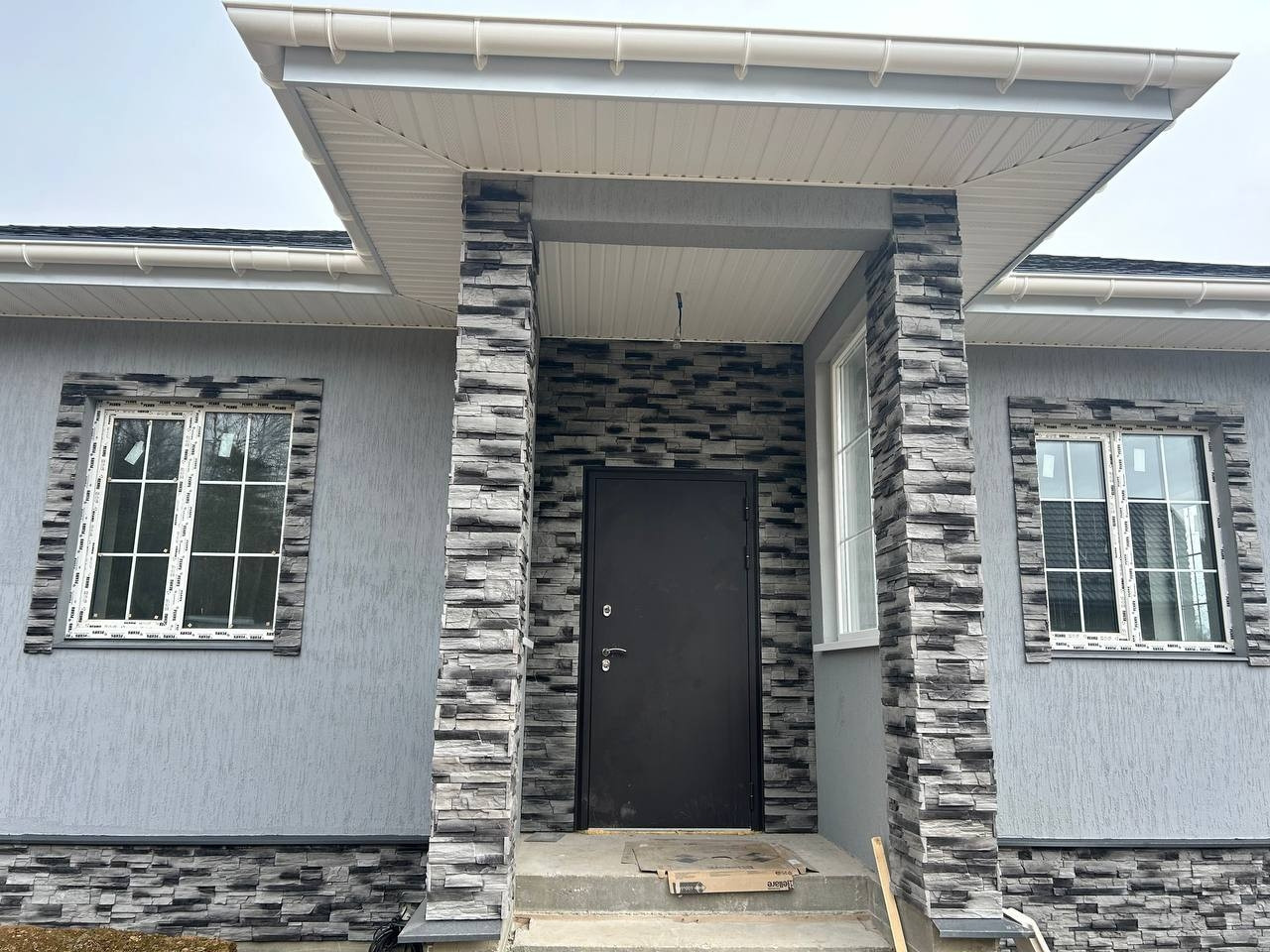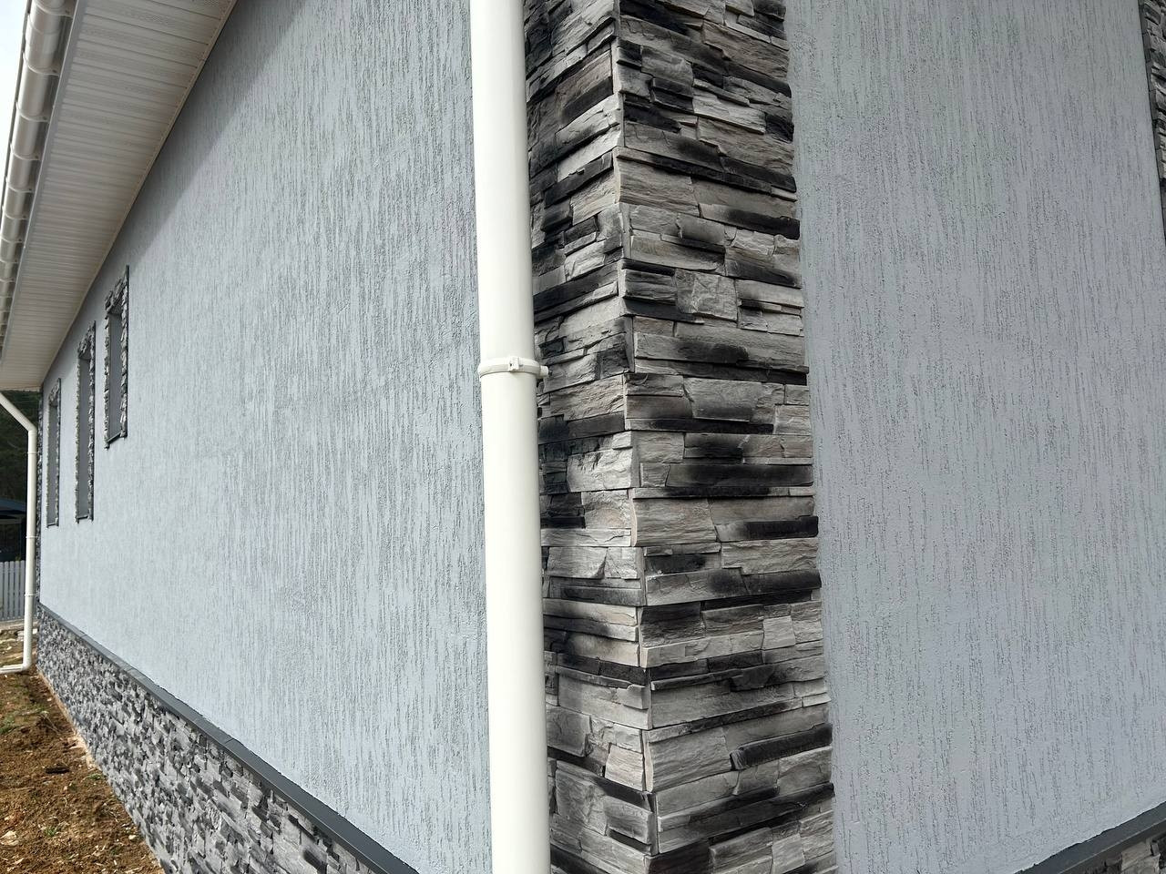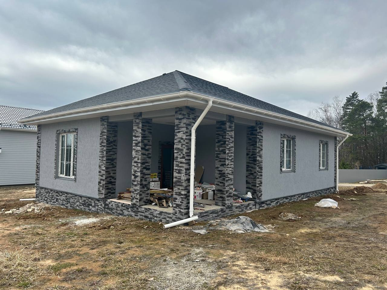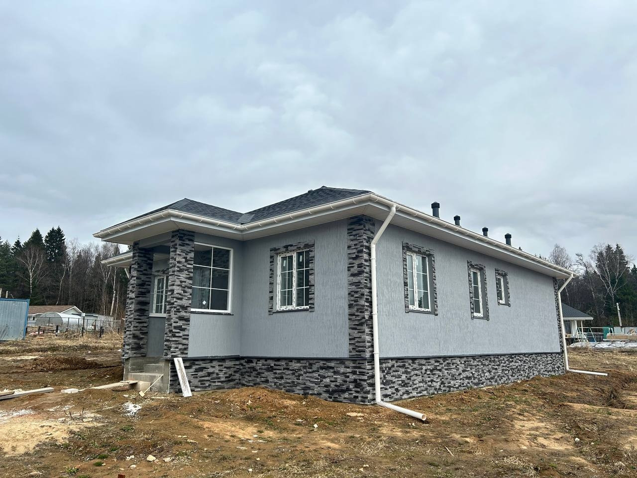 Материал дома: газобетонные блоки +утепление.; Межкомнатные перегородки - газобетонный блок; Фундамент – монолитная плита. Полы - плитка/ламинат; Внешняя отделка дома – фасадная декоративная штукатурка и кирпич; Внутренняя отделка дома - плитка/штукатурка/обои; Окна - двухкамерные стеклопакеты с раскладкой; Крыша - мягкая кровля; Установлена водосточная система.