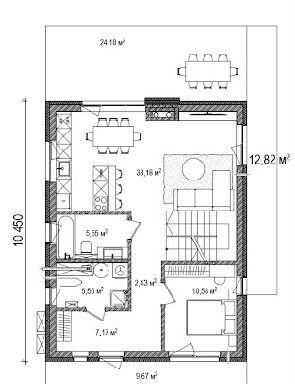 На первом этаже расположена просторная кухня-гостиная 38.2 кв.м с камином и с выходом на террасу - 24 кв.м, спальня, санузел, гардеробная, котельная.