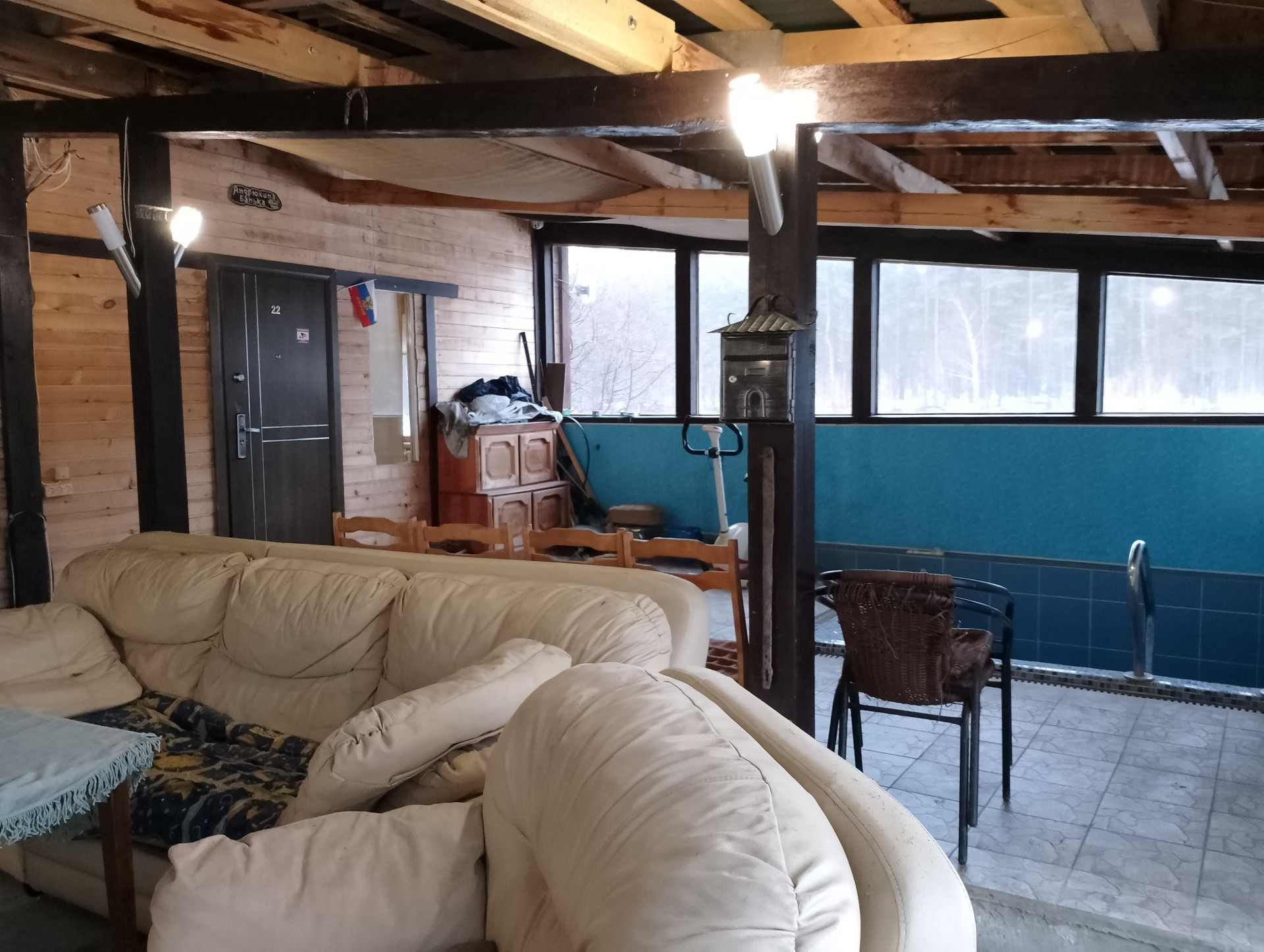 Во дворе под крышей оборудован бассейн, зона для отдыха, барбекю. На территории участка установлена теплица (поликарбонат), хозпостройки.