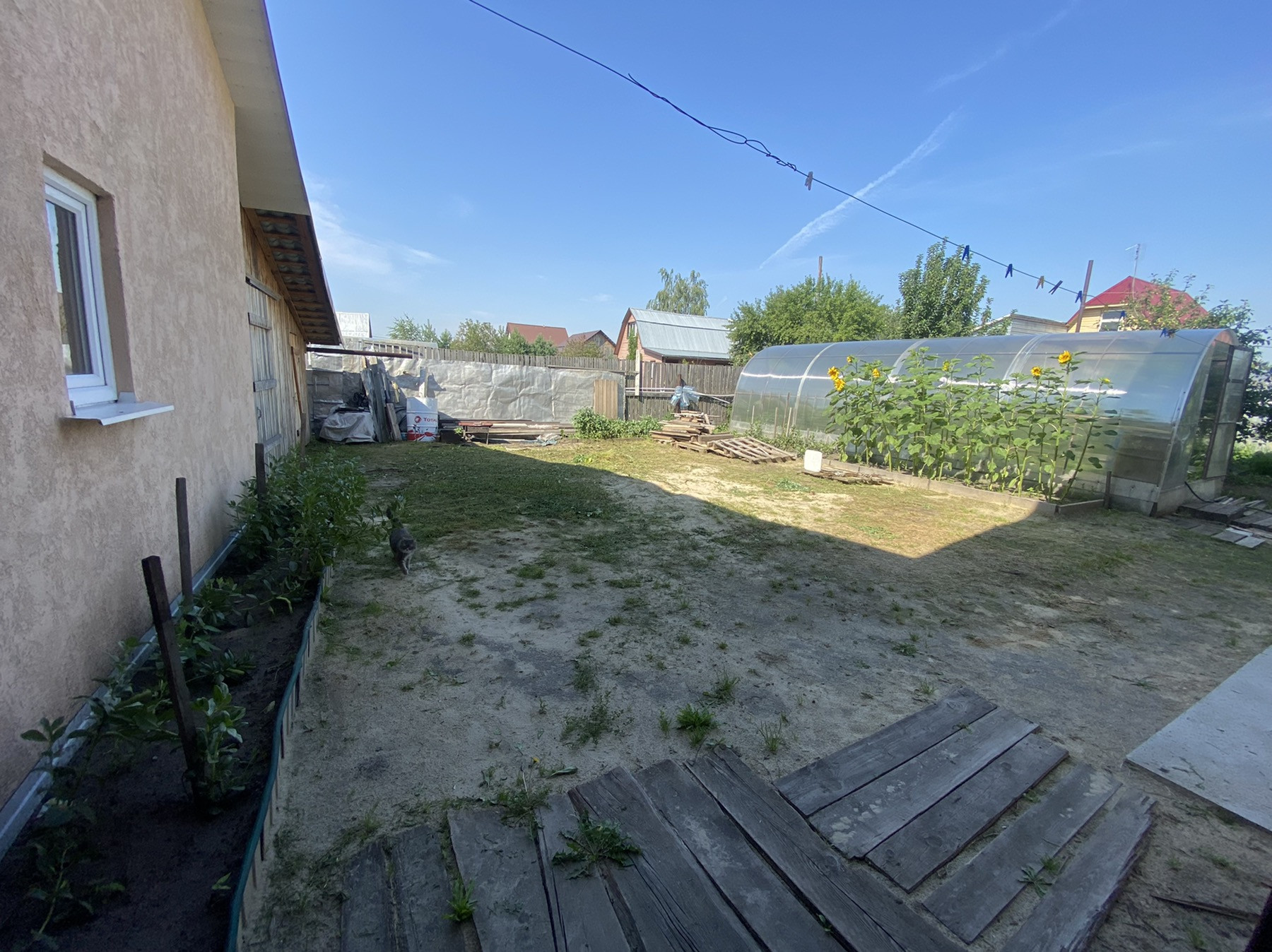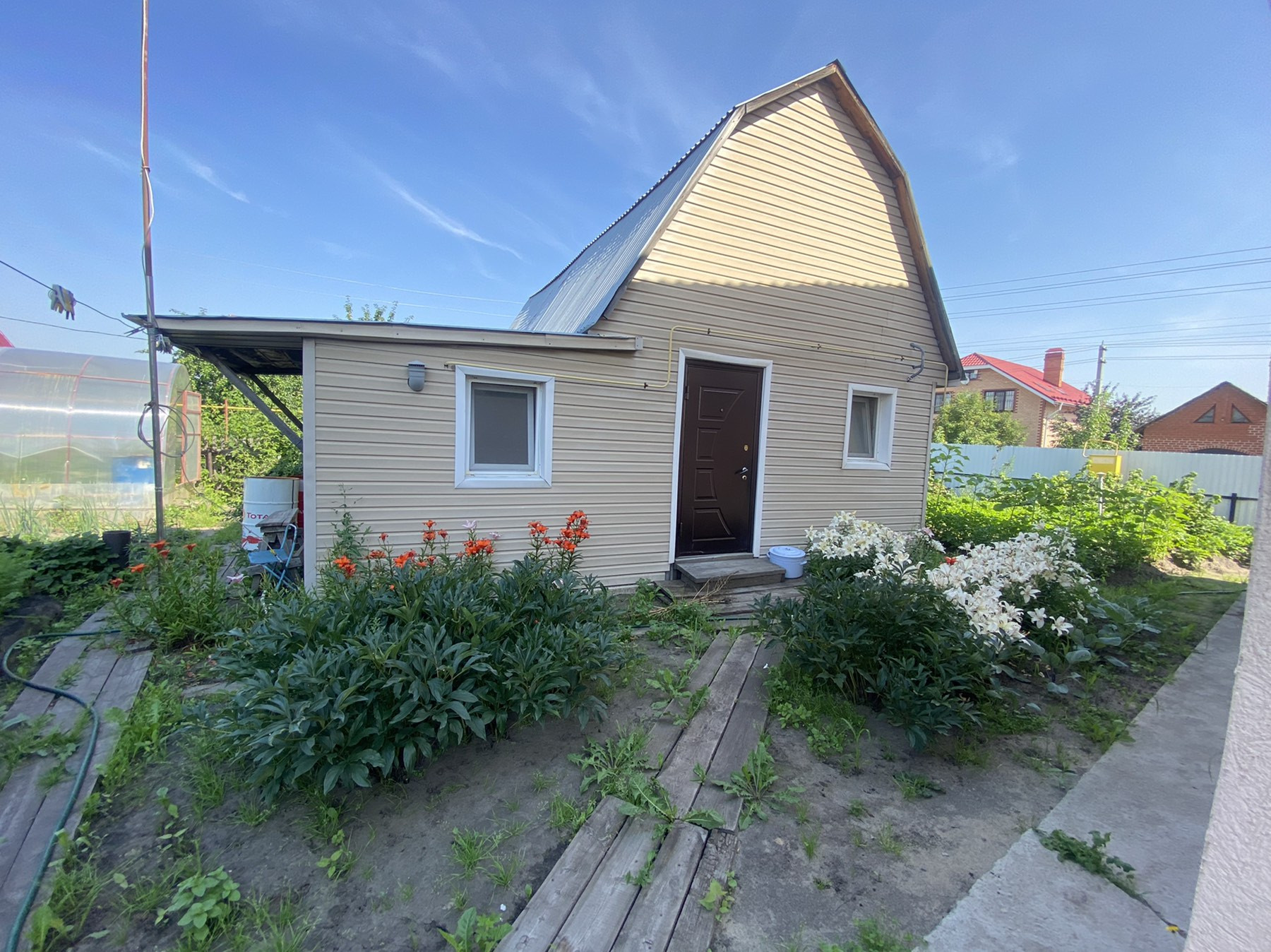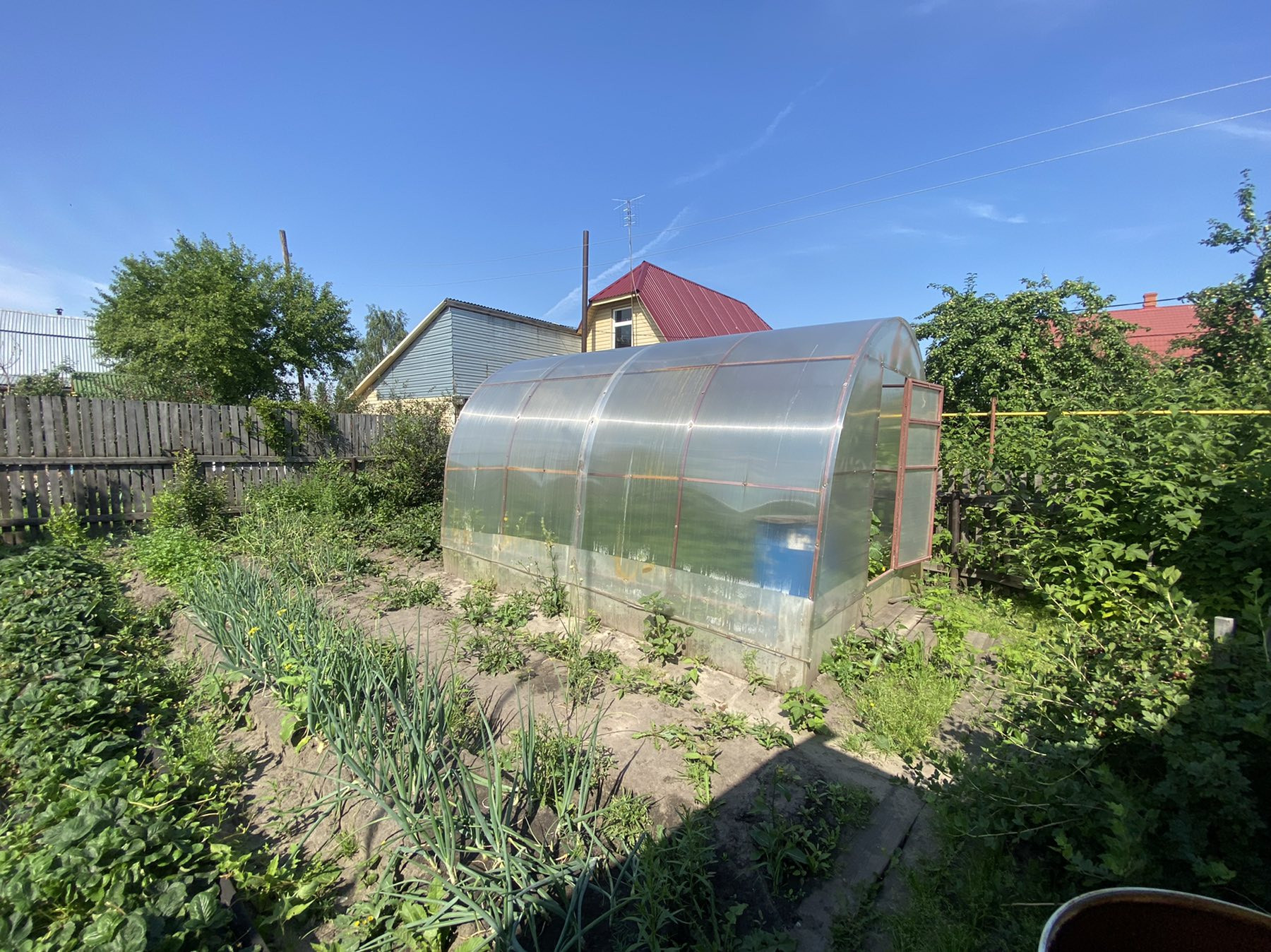 На участке баня из керамзитоблоков, заведен водопровод и теплые полы, беседка, уличный туалет, навес, куда вмещается 4 машины, погреб со спуском из ограды, две теплицы из поликарбоната, летний домик.