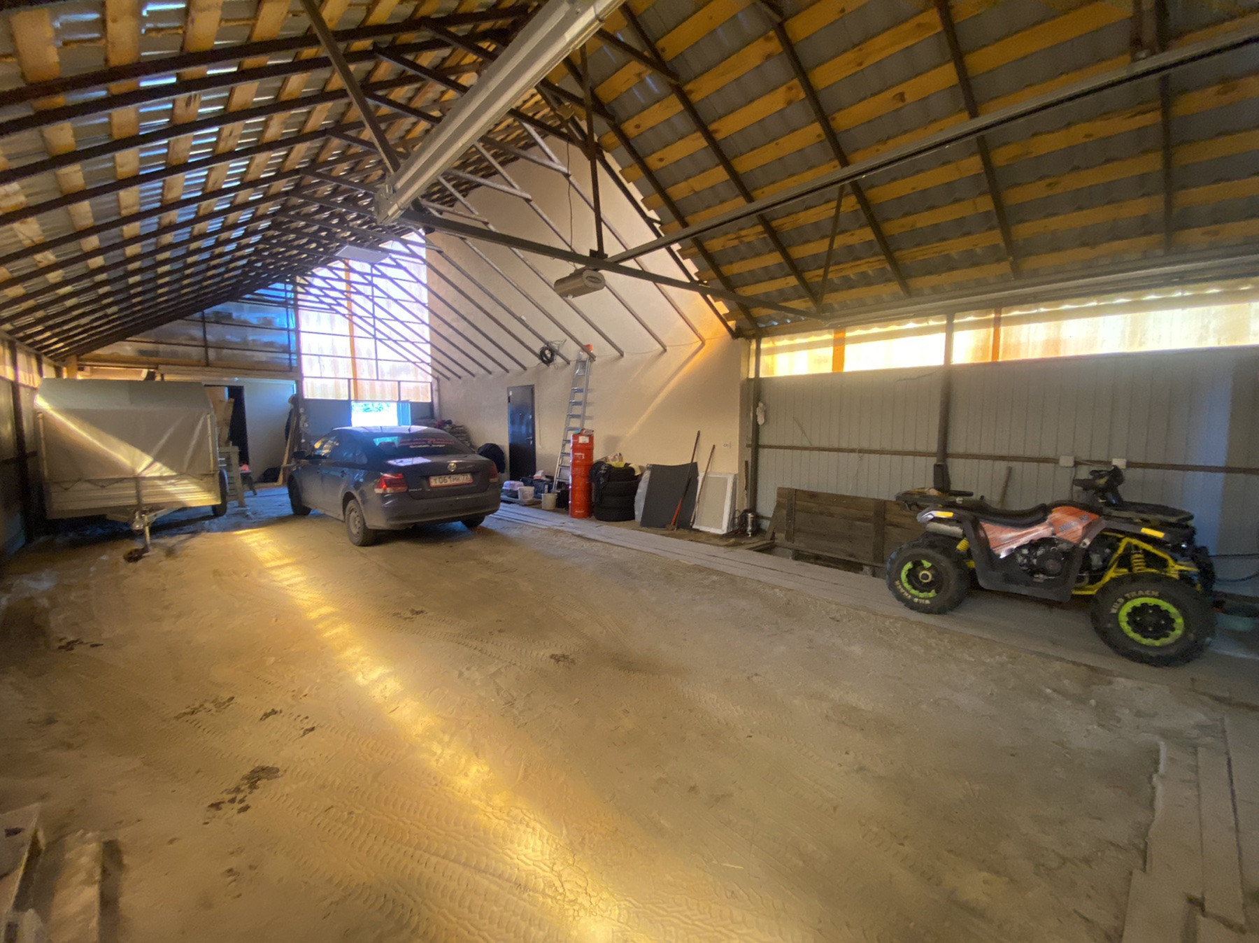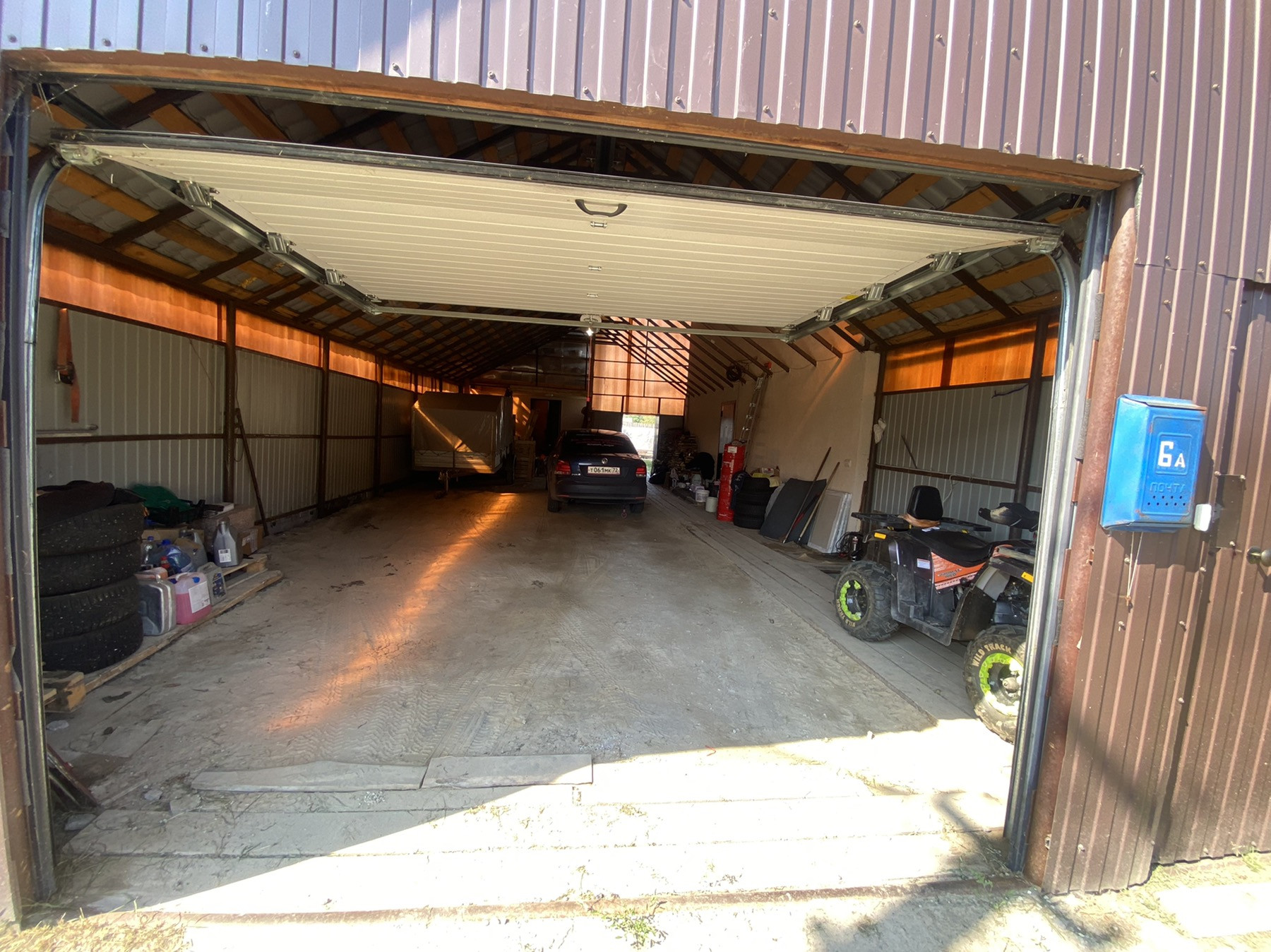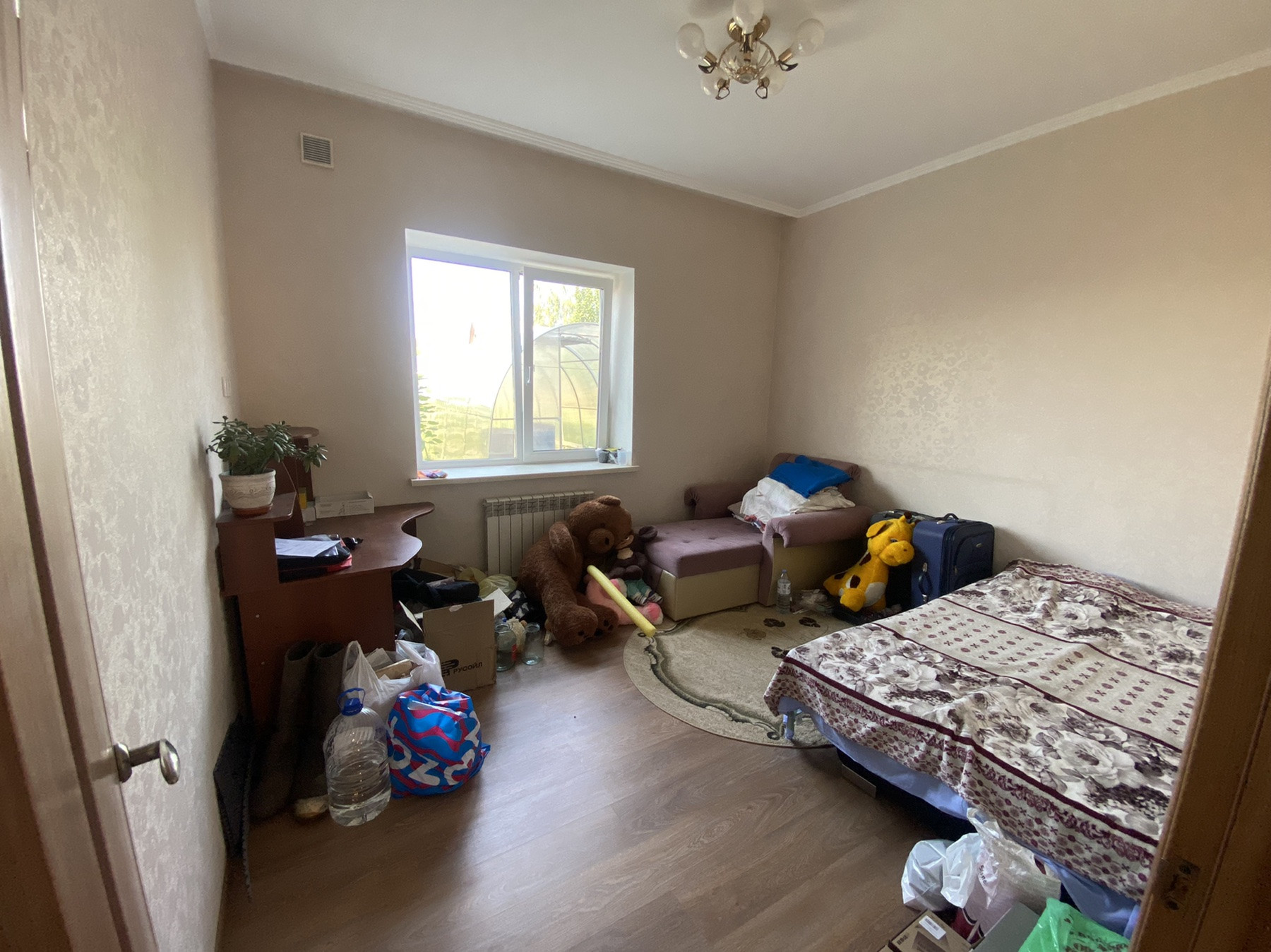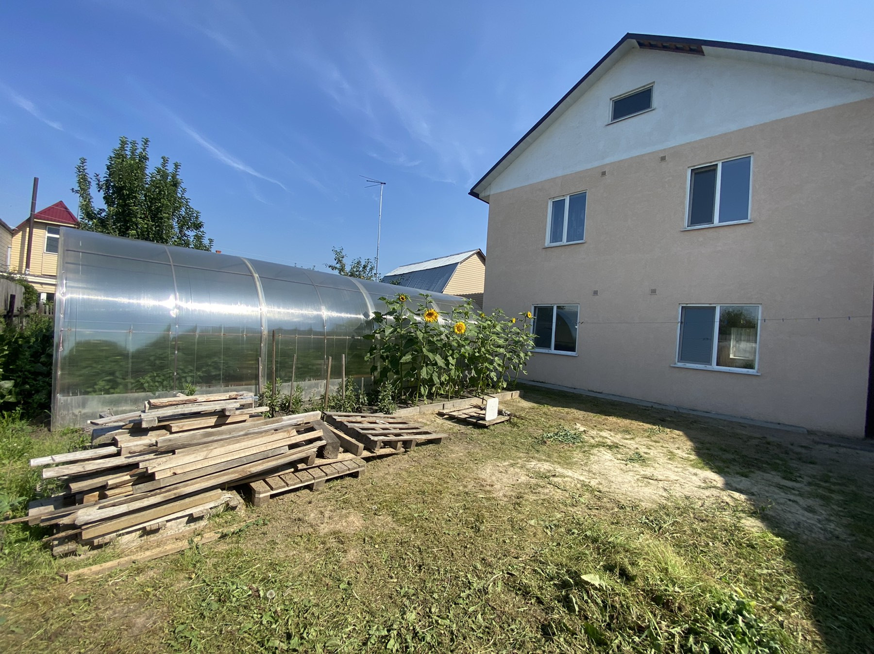 На участке баня из керамзитоблоков, заведен водопровод и теплые полы, беседка, уличный туалет, навес, куда вмещается 4 машины, погреб со спуском из ограды, две теплицы из поликарбоната, летний домик.