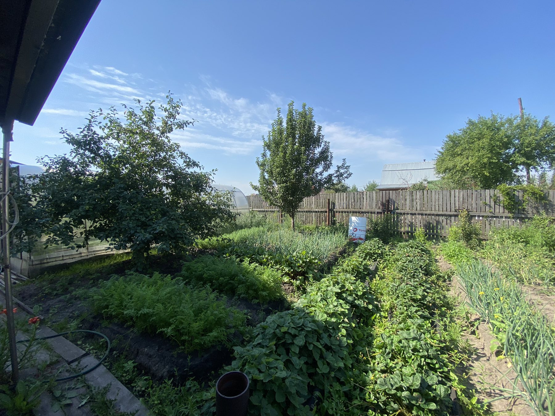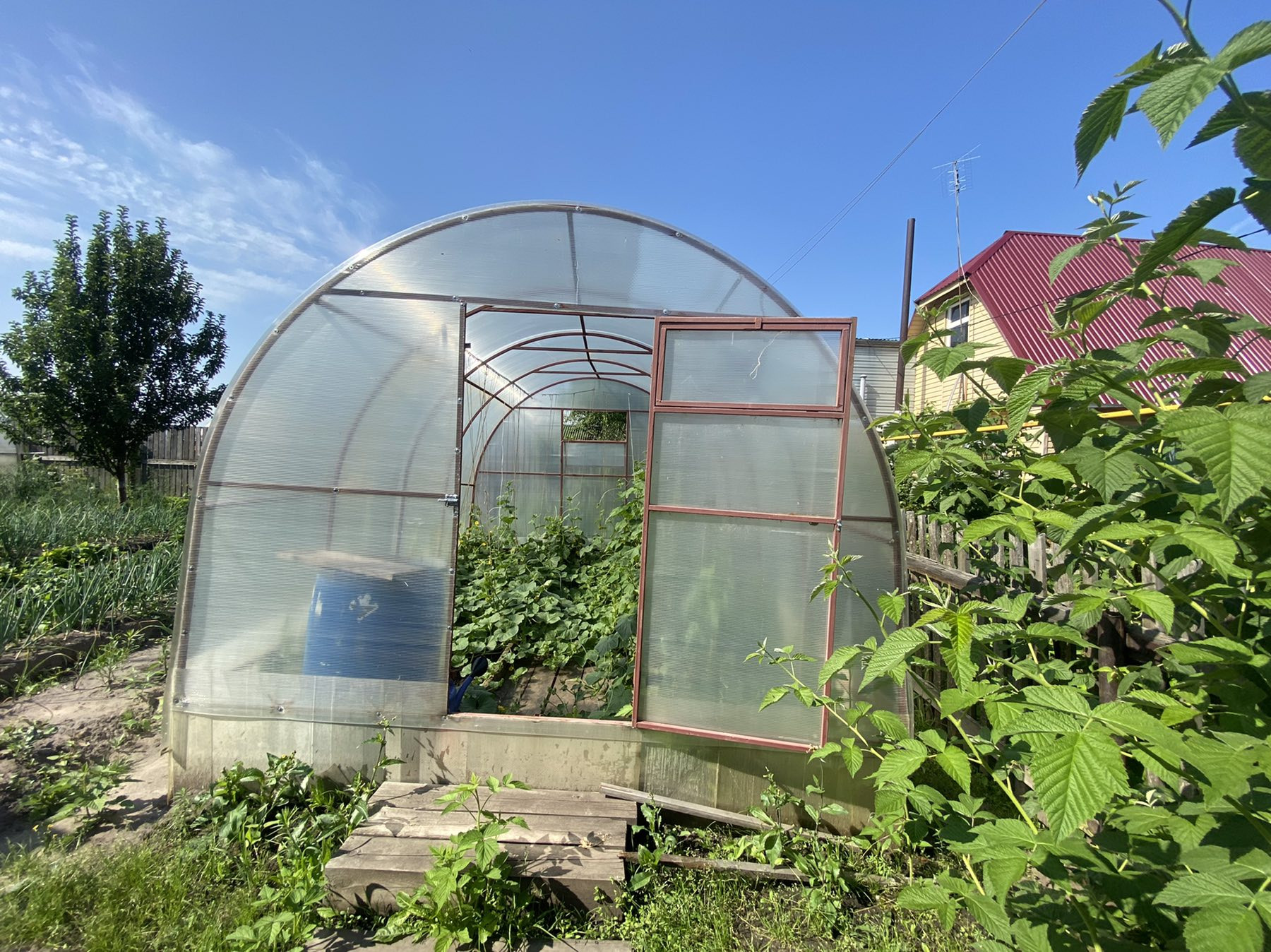 Участок разработан, растут яблони, вишня, малина, крыжовник, смородина, клубника.