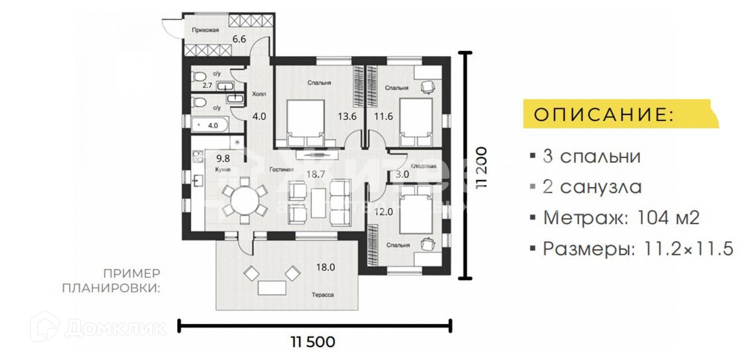 Общая площадь дома: 104м2