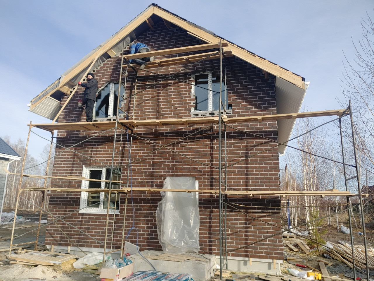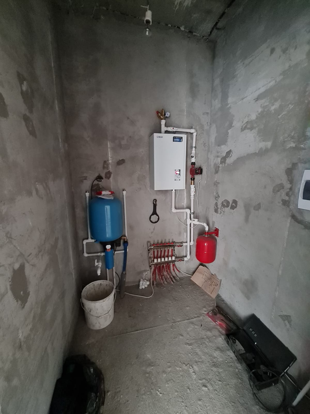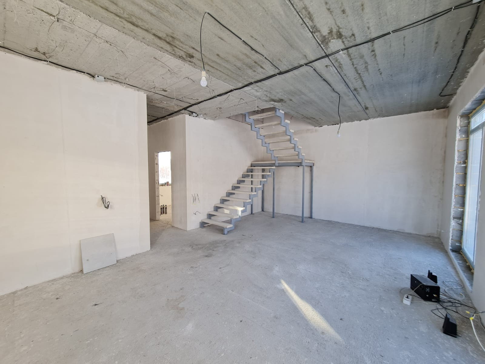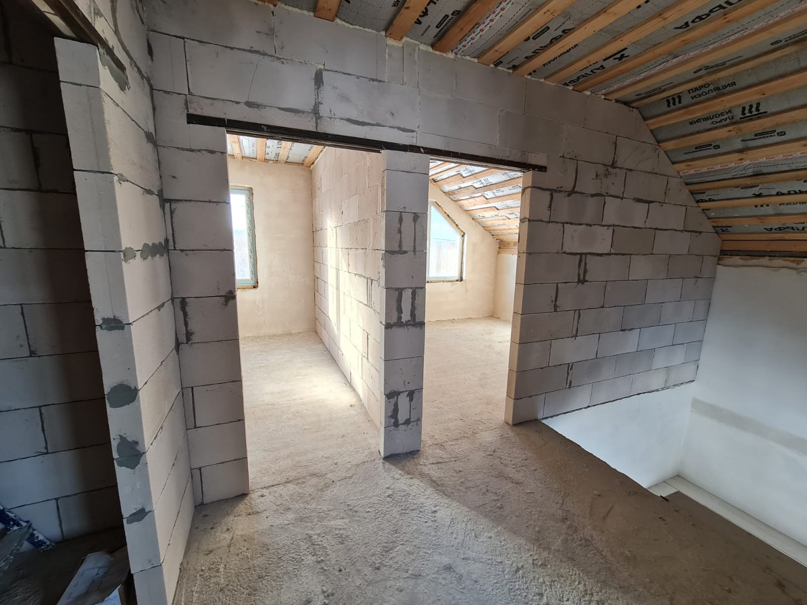 В доме выполнена предчистовая отделка; штукaтуpка, cтяжкa пола, водяной теплый пол (утеплитель, сетка, трубки, стяжка), установлен электрический котел, разводка электрики по всему дому.