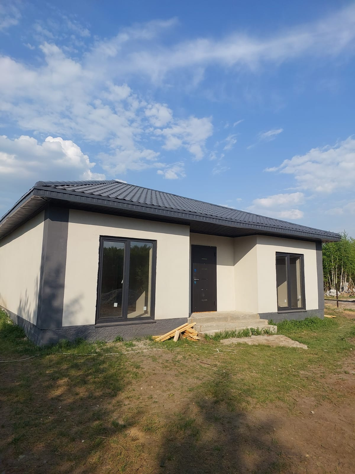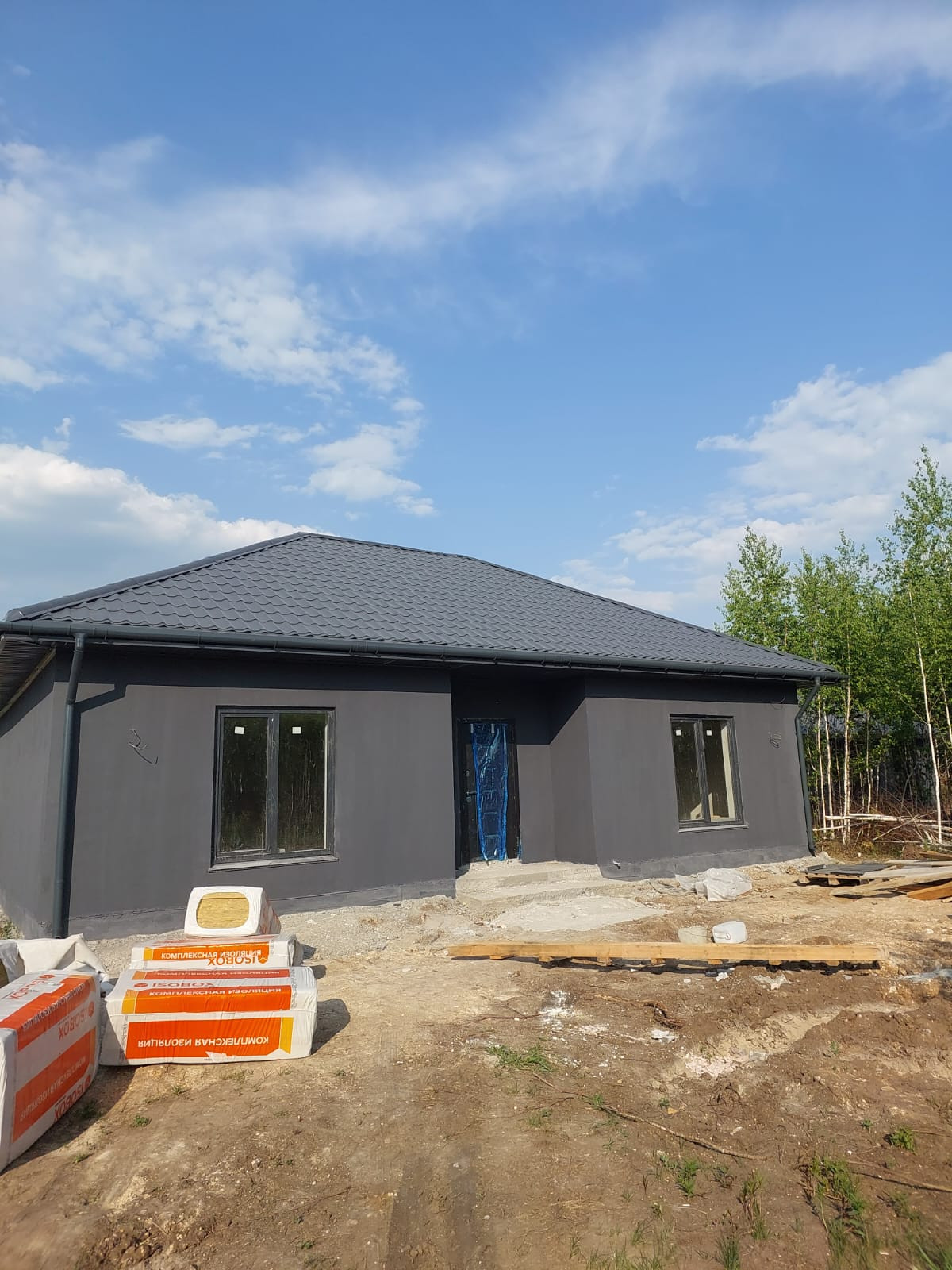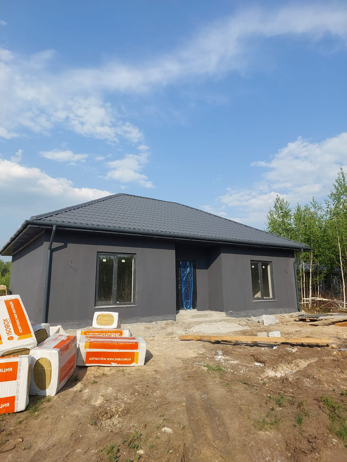 Фундамент монолитная бетонная плита, кровля металлочерепица 4.5мм, стены пенобетон 300мм, обшиты термопанелями "под кирпич", потолок утеплен минплитой 100мм, внутренние стены пенобетон 150мм, обшиты гипсокартоном, окна 2х камерный стеклопакет, хорошая входная дверь с защитой от промерзания, выполнена разводка эл-ва, уложены теплые водяные полы, заведены коммуникации (водопровод, канализация) септик 6.5 м3, скважина 65м.