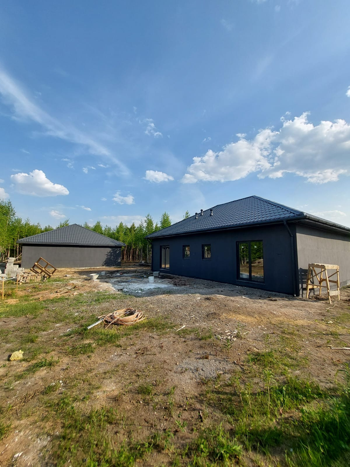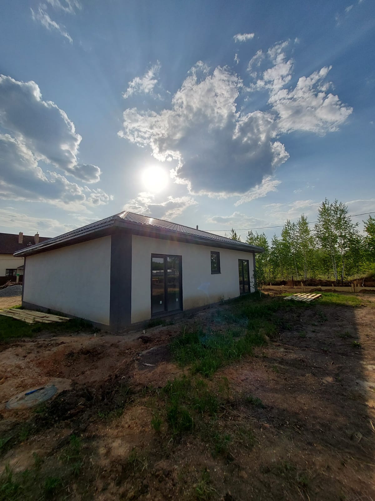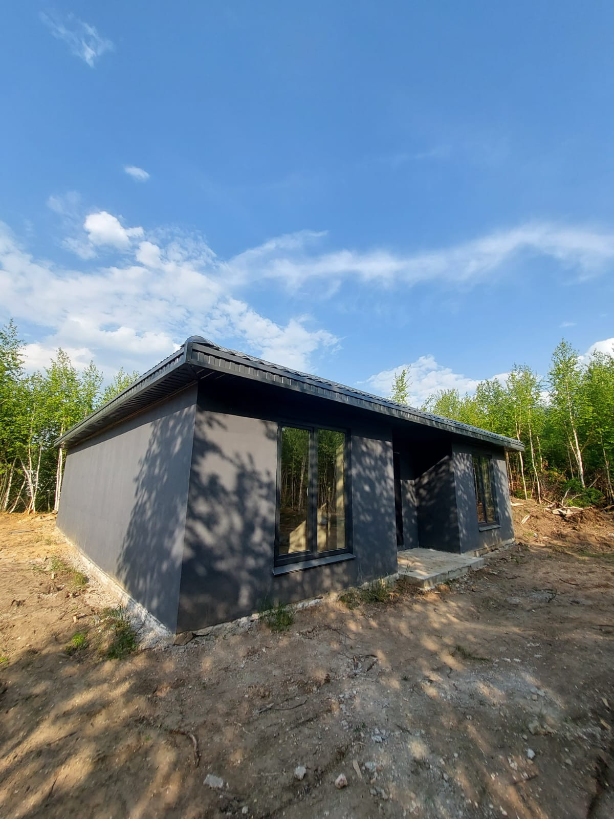 Фундамент монолитная бетонная плита, кровля металлочерепица 4.5мм, стены пенобетон 300мм, обшиты термопанелями "под кирпич", потолок утеплен минплитой 100мм, внутренние стены пенобетон 150мм, обшиты гипсокартоном, окна 2х камерный стеклопакет, хорошая входная дверь с защитой от промерзания, выполнена разводка эл-ва, уложены теплые водяные полы, заведены коммуникации (водопровод, канализация) септик 6.5 м3, скважина 65м.