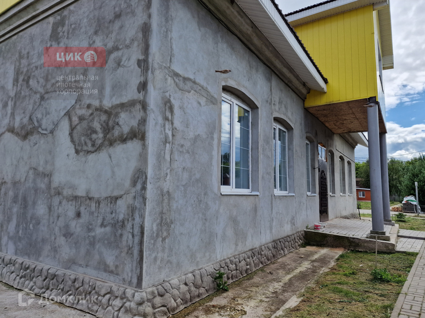 Дорожки вымещены тротуарной плиткой.  За основным домом есть альпийская горка, клумбы.