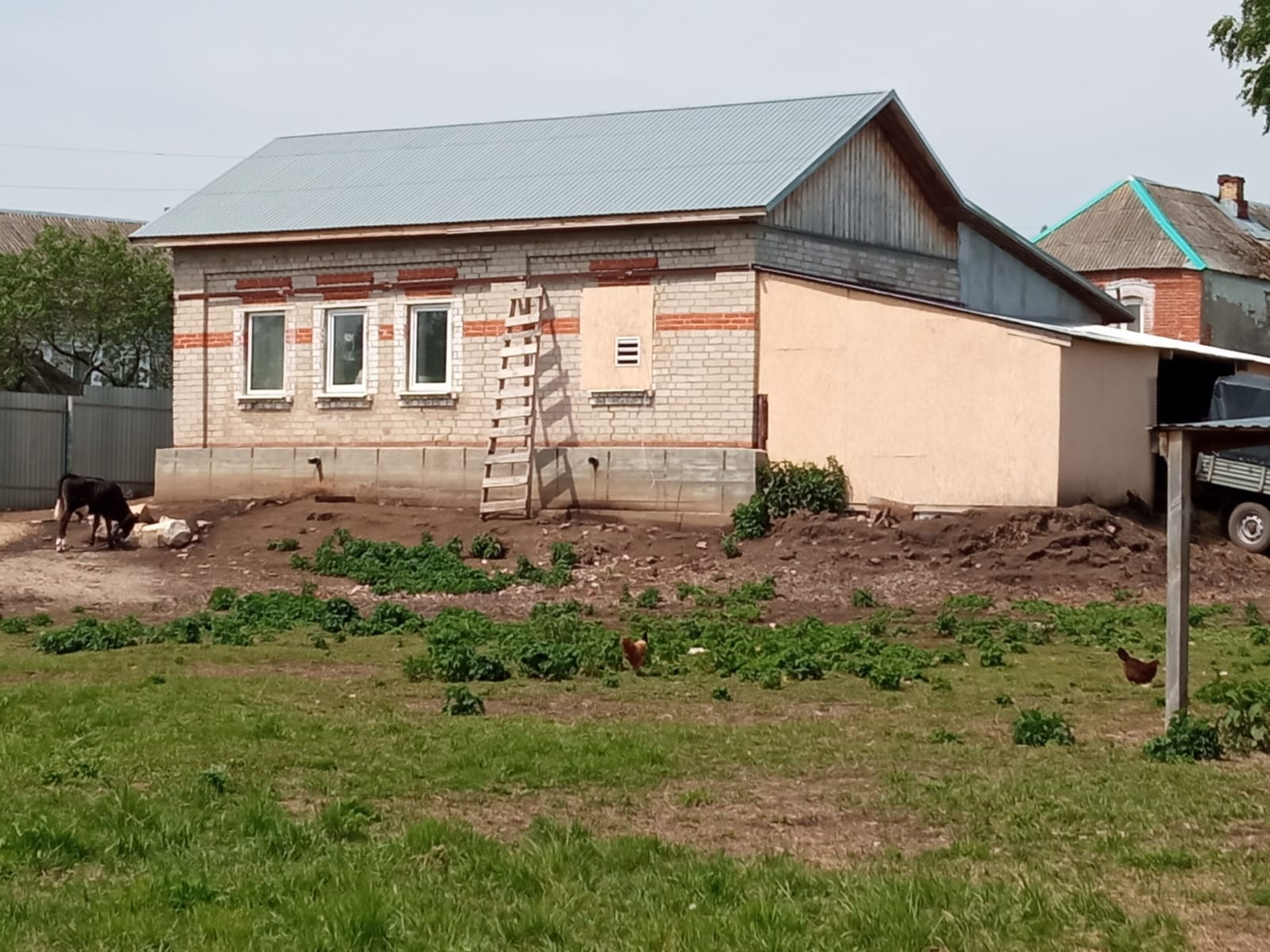 Коровник капитальный кирпичный, 110 кв. м. Есть слив для отходов, своя вода заведена в помещение. Просторный, светлый (много окон), теплый. Есть принудительная вытяжка большим осевым вентилятором. Большой выгул для коров, территория огорожена профлистом. Летний загон для свиней. Большое отделение для кур из оштукатуренных газоблоков.