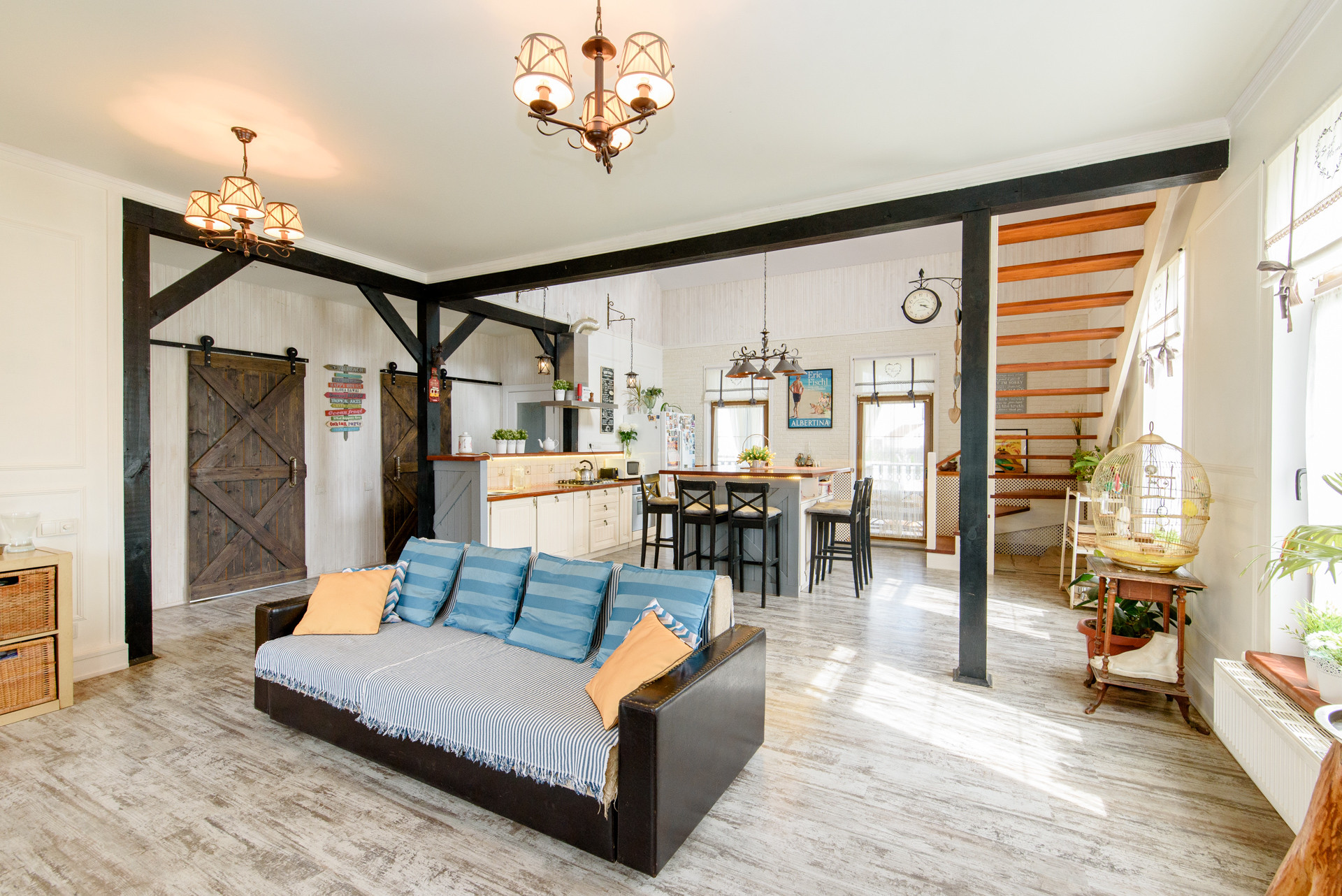 В домах вся мебель и техника новая, высокого качества. Дизайнерская отделка. Потолки 3,5 м. Просторная кухня-гостиная, две спальни, ванная.