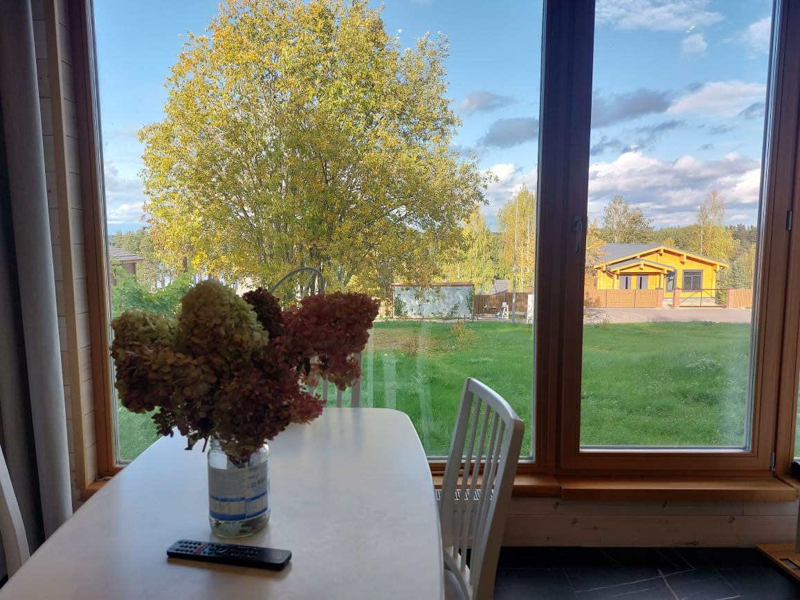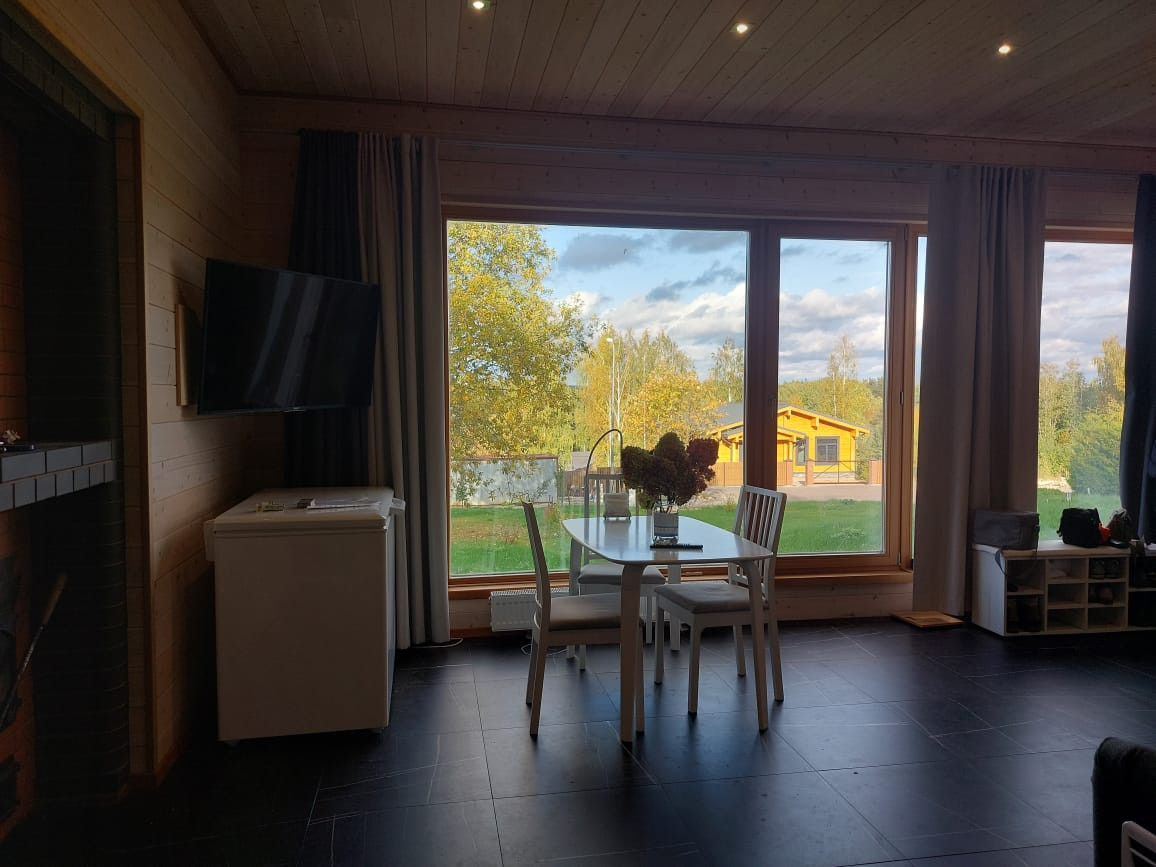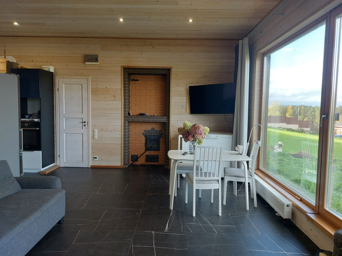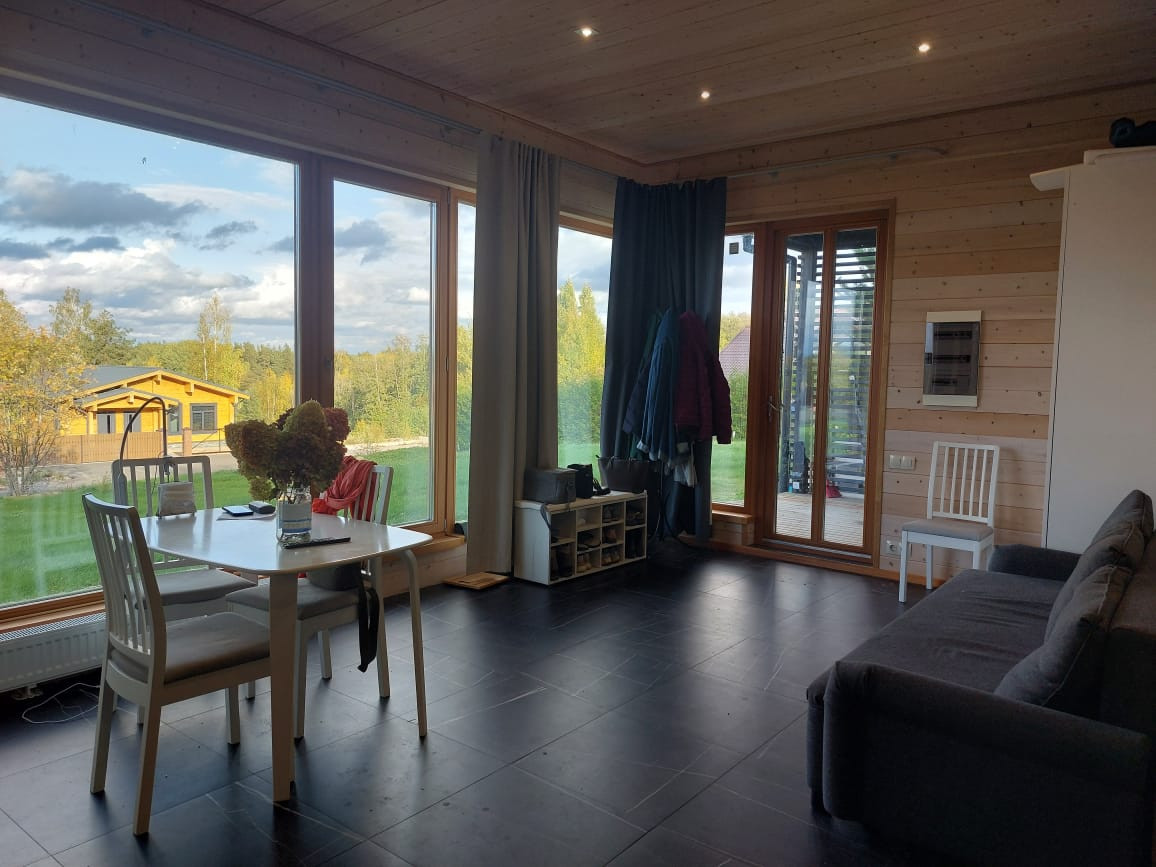Предлагаю вашему вниманию интересный вариант загородного дома в живописном уголке Карельского перешейка (элитный небольшой поселок). Дом небольшой, но продуманный, в нем поместились и просторная шикарная баня, и санузел, и душевая, небольшая спальня, а самое главное-уютная солнечная  кухня гостиная с окнами в пол и живописным видом.