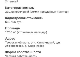 участок 15 соток Пустой Оформленный через МФЦ города Калязин кадастровый номер и номер участка есть каждое лето косился Находится в конце деревни Овсяниково Есть еще соседний участок |