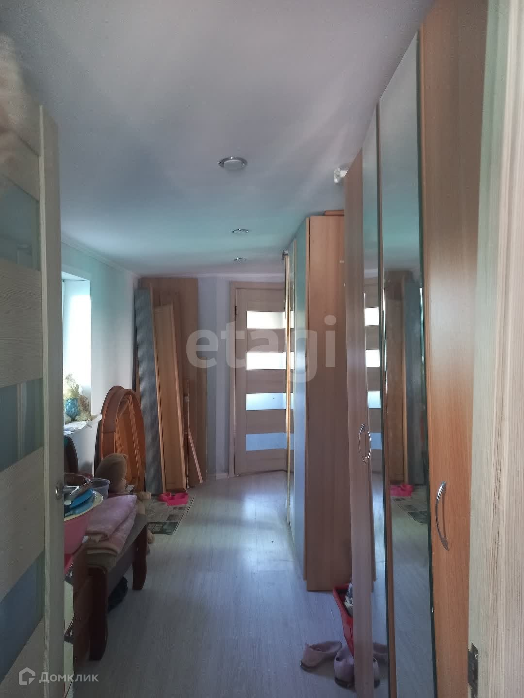 Материал стен бревно, обшит досками. Внутренняя отделка выполнена из гипсокартона, Окна ПВХ. На полах ламинат, только в двух комнатах постелен линолеум.