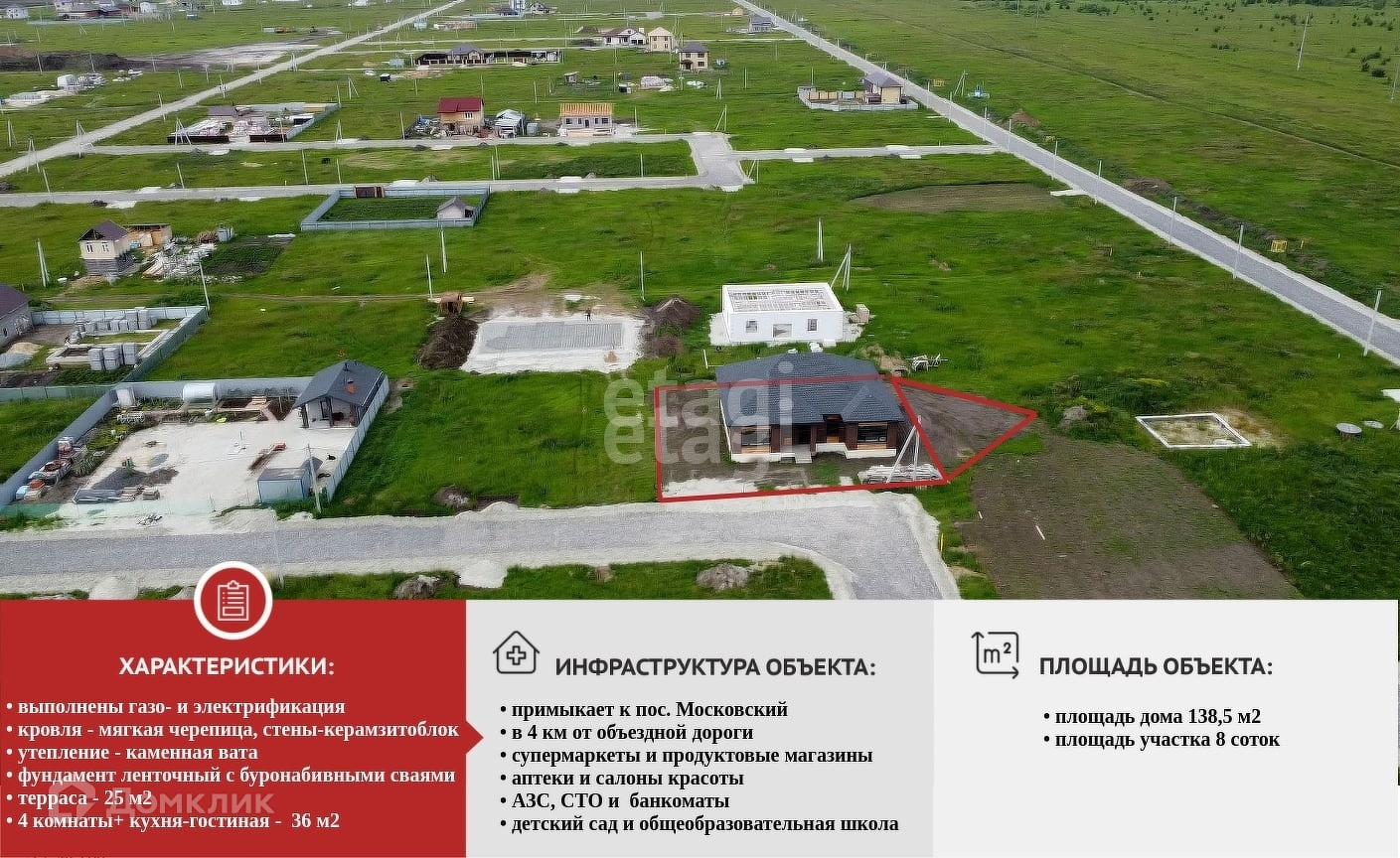 В коттедже выполнена основная внутренняя отделка, позволяющая проживать в доме прямо сейчас и планировать дальнейшие интерьерные решения. Дом построен из высококачественных материалов: кровля - мягкая черепица, стены-керамзитоблок, облицованный кирпичом с утеплением из каменной ваты. Фундамент ленточный с буронабивными сваями. Предусмотрено место для камина. В доме высокие потолки 3,2 метра. Большие окна оставляют в доме много света, при этом сохраняют тепло. Фасады дома украшены лиственницей, которая не утратит своего свежего вида долгие годы. Делали с душой, для себя. Лицевая сторона дома выходит на юго-восток - вам обеспечены теплые рассветы, а на террасе дома вы будете с удовольствие наблюдать, как садится солнце за горизонт. Площадь террасы - 25 кв.м — здесь будет комфортно проводить семейные ужины в кругу близких людей. Коттедж состоит из 4-х равноудаленных друг от друга светлых, просторных комнат, шикарной кухни-гостиной 36 кв.м. В доме два просторных санузла, отдельная постирочная, компактная гардеробная. Отопление- электрокотел, газ подведён к дому. Подача газа запланирована на лето. По всей площади дома выполнен тёплый водяной пол,в комнатах дополнительно установлены радиаторы отопления. Канализация-переливной септик. Водоснабжение обеспечено скважиной. Имеется система очистки воды. Прямо сейчас ведутся работы по устройству дорог- отсыпка щебнем. В дальнейшем планируется асфальтирование.