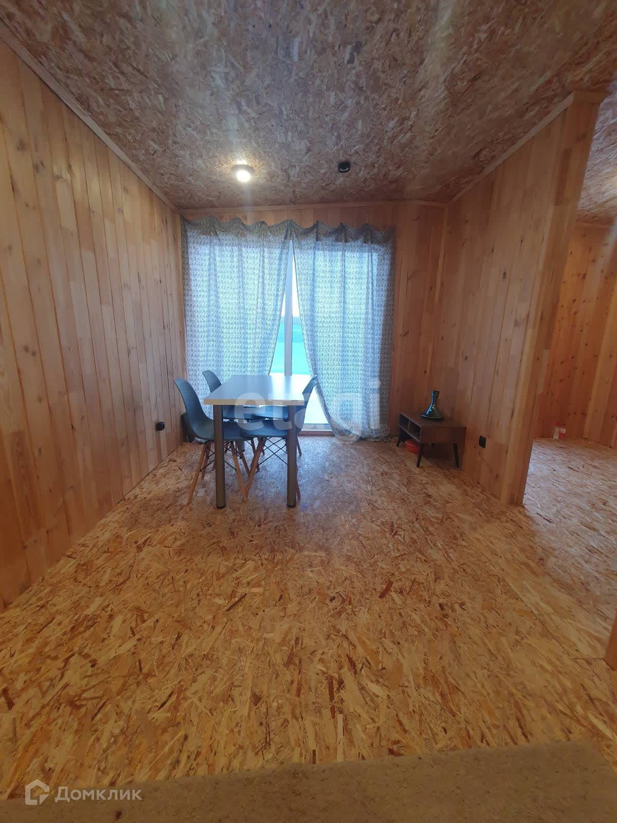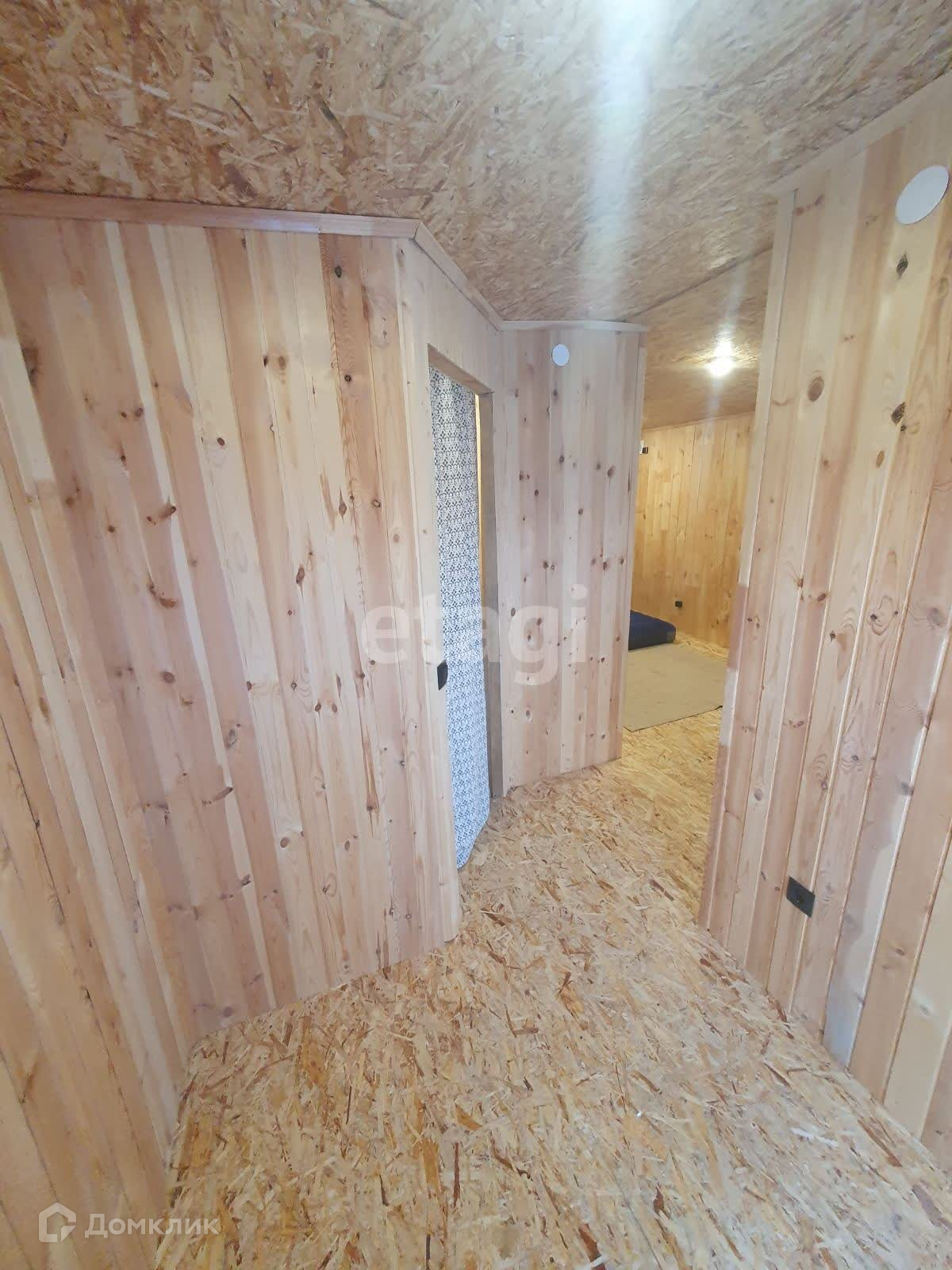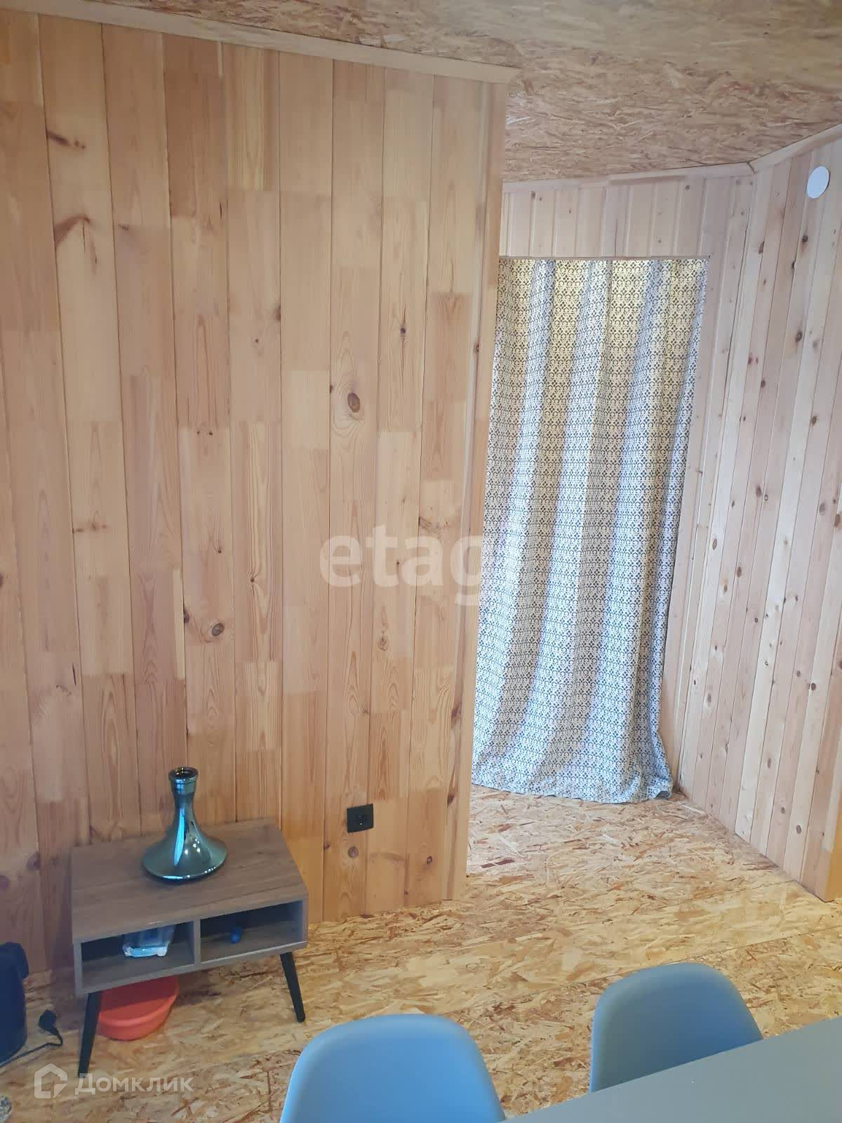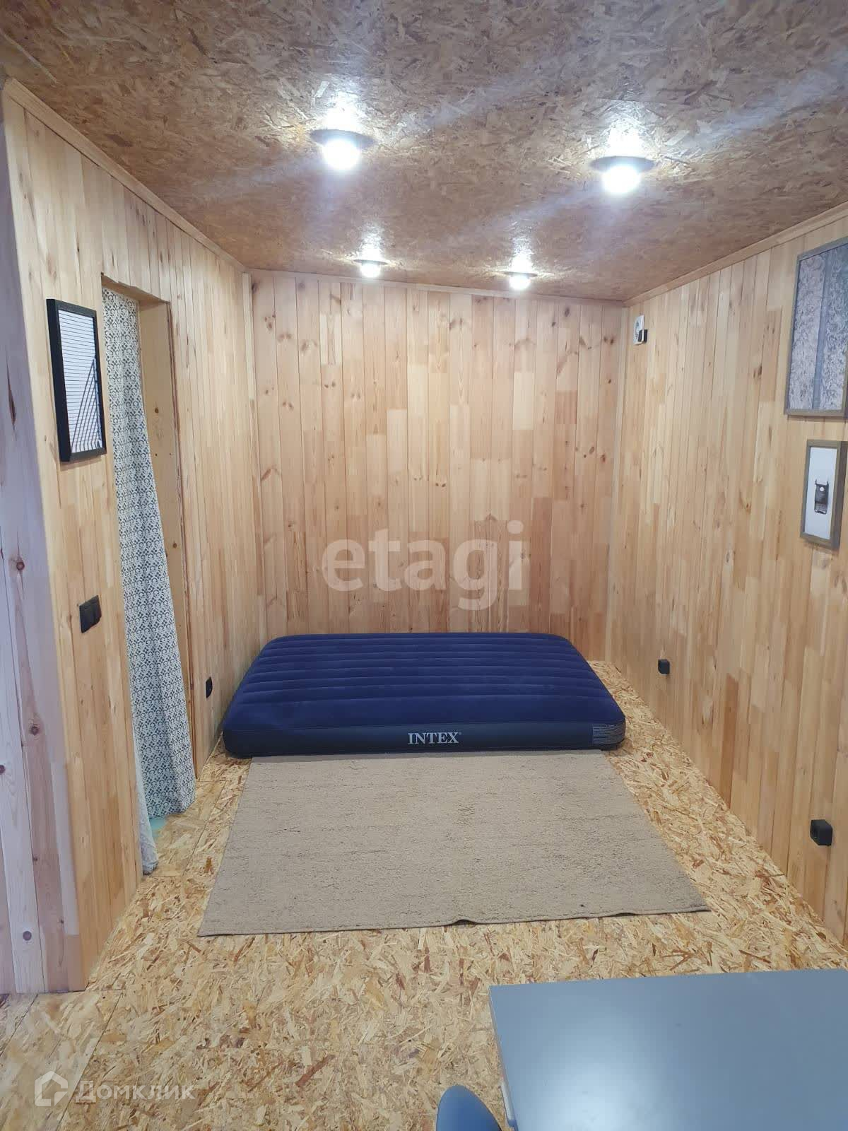 Внутренняя отделка стен кухни- гостинной выполнена широкой вагонкой в вертикальном исполнении, в остальных помещениях стандартной узкой вагонкой, фасад выполнен из имитатации бруса, обработан пропиткой, остальные стены и крыша-металлопрофиль. Дом стоит в дальнем углу участка, что позволяет построить капитальный дом на оставшейся территории.
