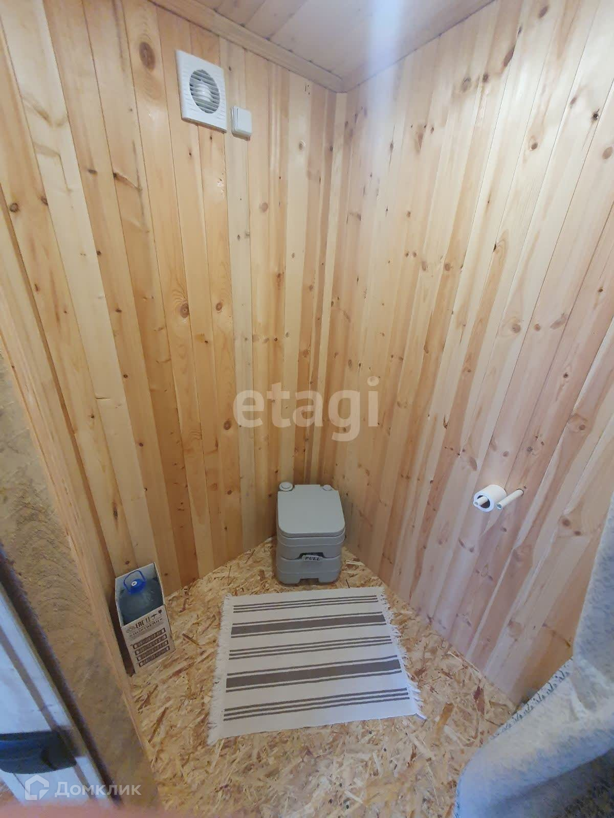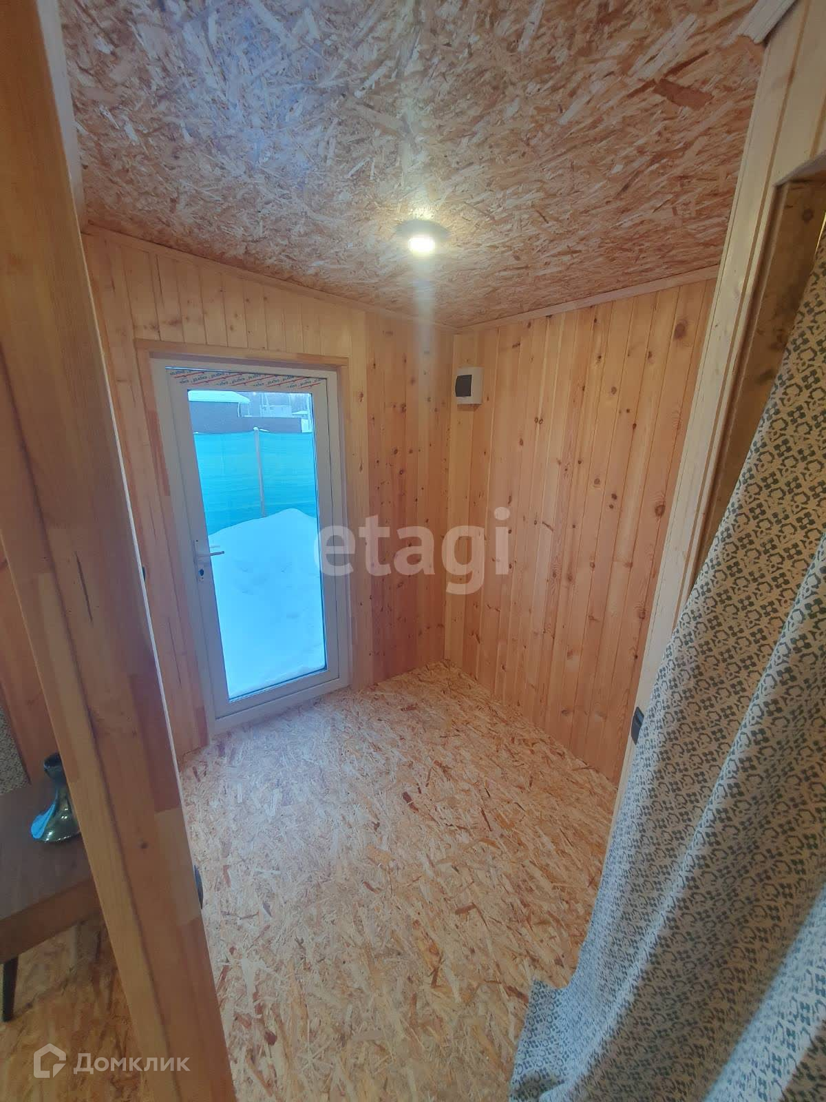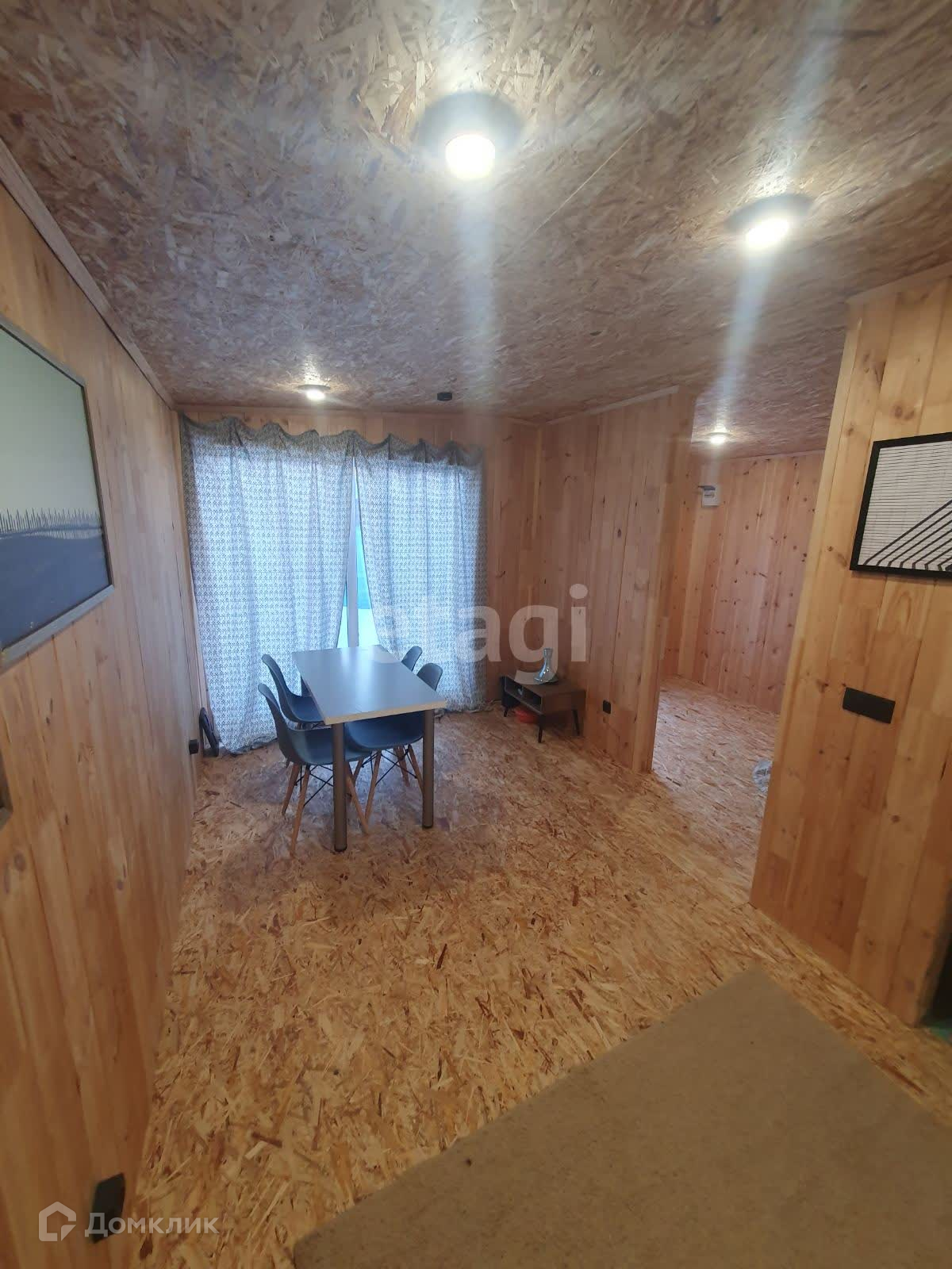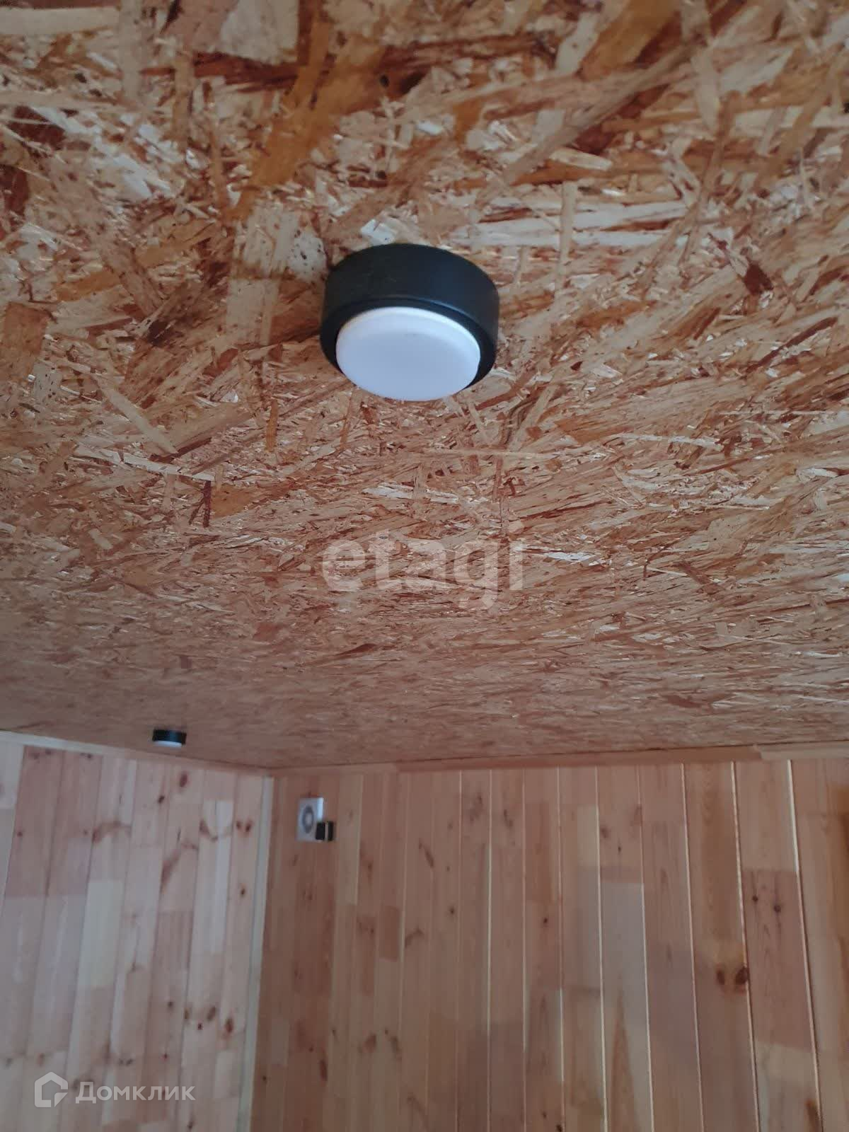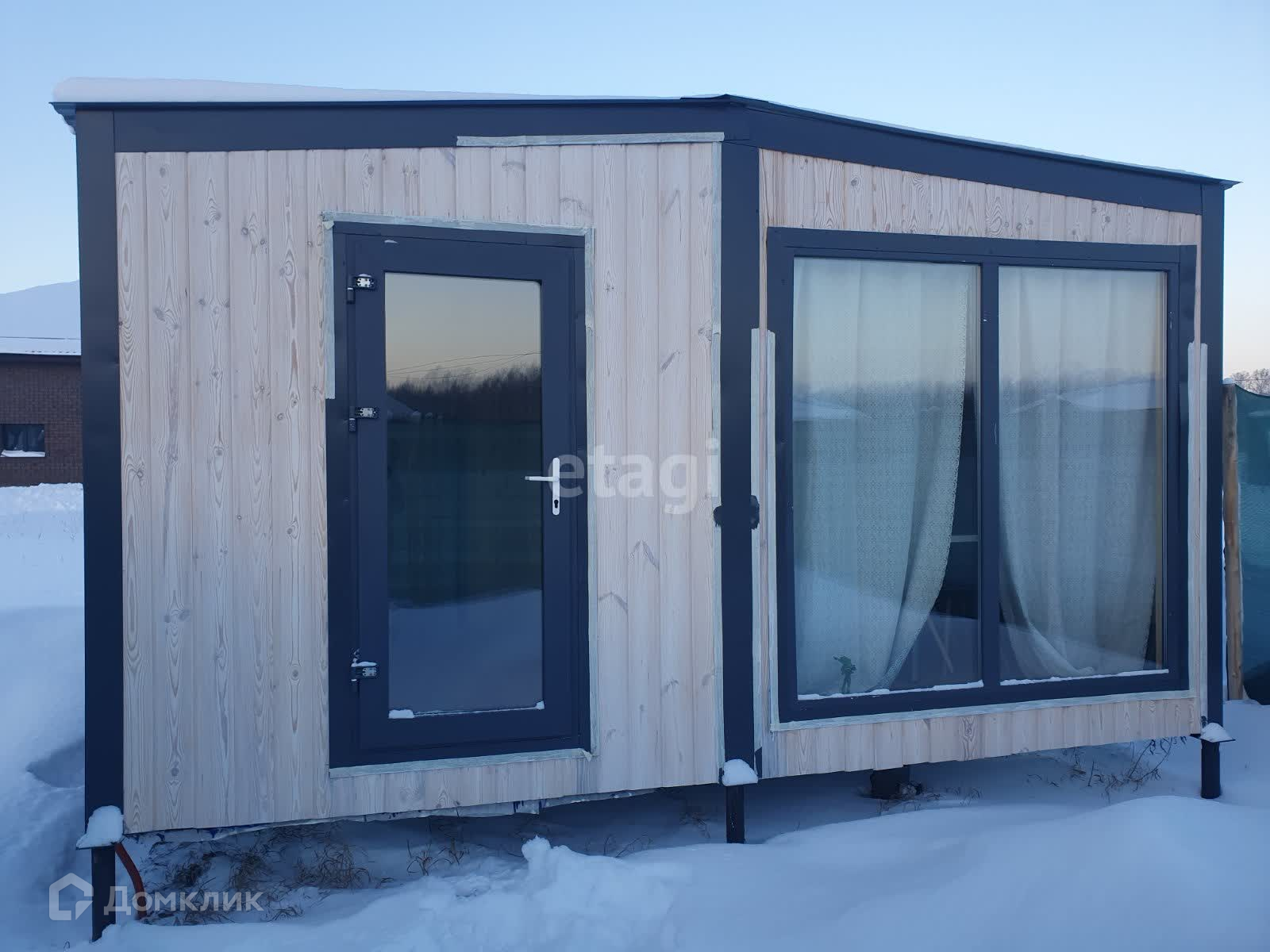 Внутренняя отделка стен кухни- гостинной выполнена широкой вагонкой в вертикальном исполнении, в остальных помещениях стандартной узкой вагонкой, фасад выполнен из имитатации бруса, обработан пропиткой, остальные стены и крыша-металлопрофиль. Дом стоит в дальнем углу участка, что позволяет построить капитальный дом на оставшейся территории.