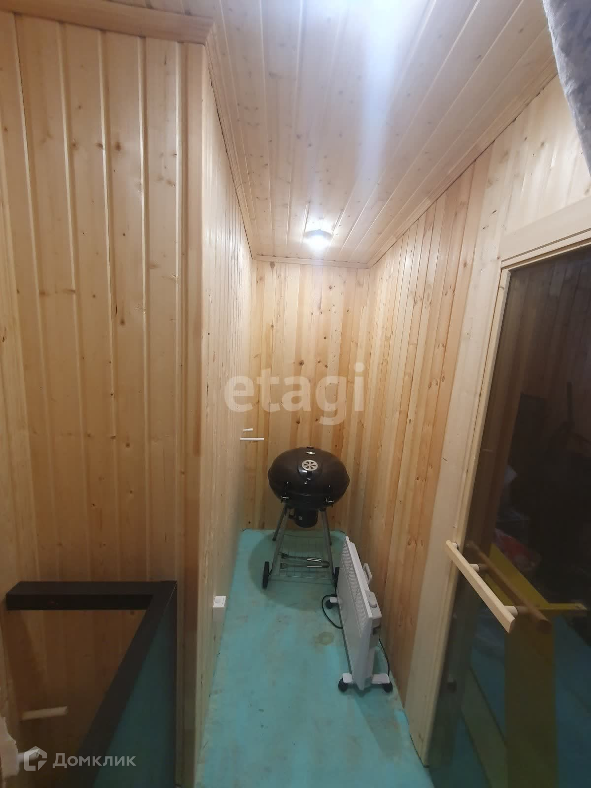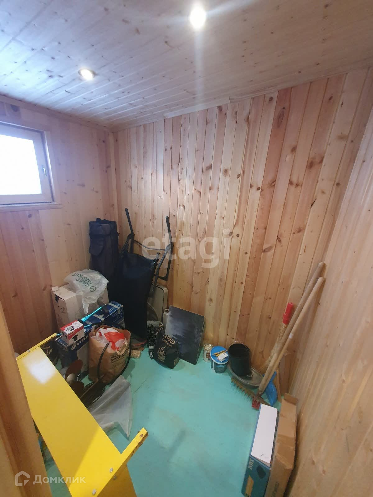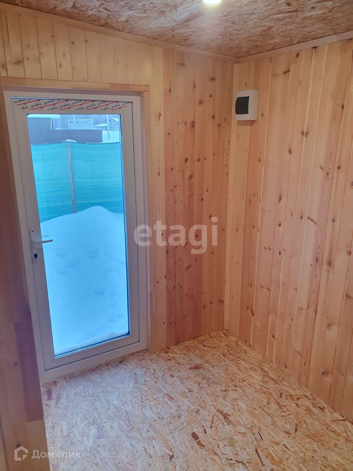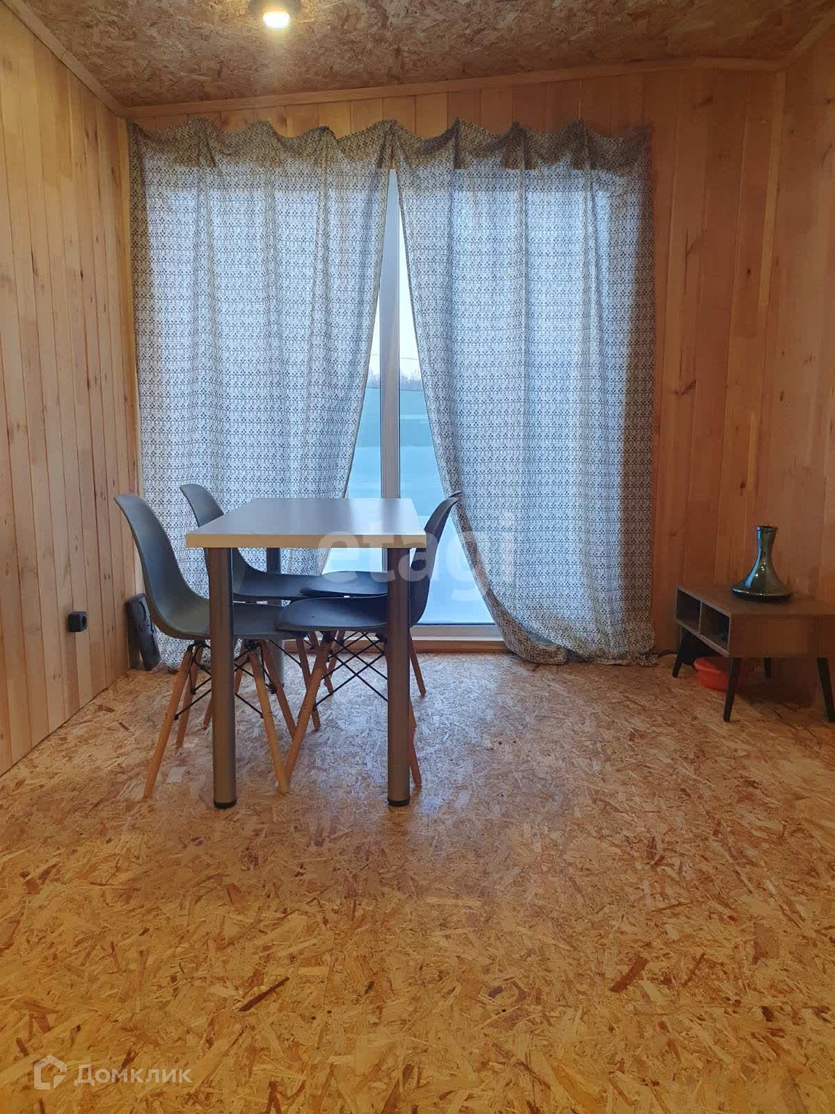 Внутренняя отделка стен кухни- гостинной выполнена широкой вагонкой в вертикальном исполнении, в остальных помещениях стандартной узкой вагонкой, фасад выполнен из имитатации бруса, обработан пропиткой, остальные стены и крыша-металлопрофиль. Дом стоит в дальнем углу участка, что позволяет построить капитальный дом на оставшейся территории.