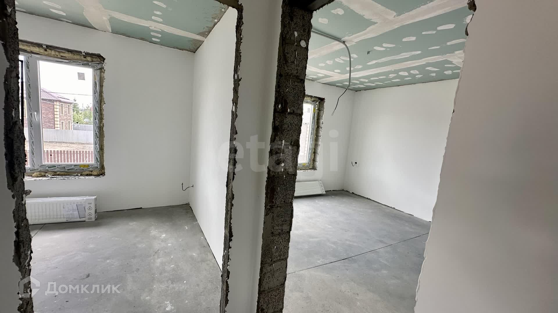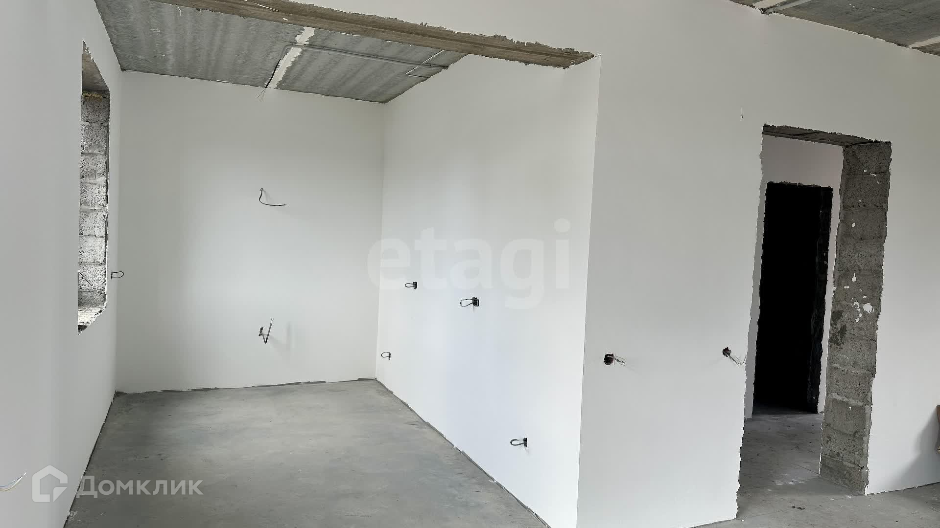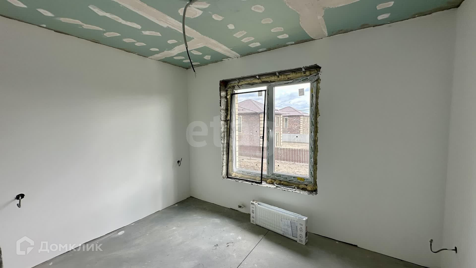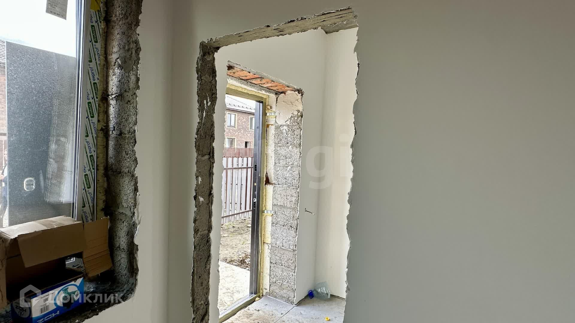 Внутренние работы выполнены с высоким качеством: стены отштукатурены и выровнены под маяк, готовые к поклейке обоев.
