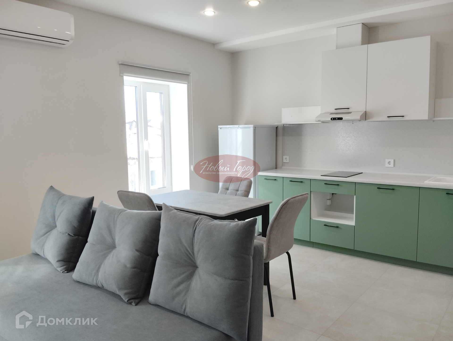 В кухне-гостиной - кухонный гарнитур, обеденный стол, стулья, 2х спальная кровать, кондиционер, эл.плита, холодильник.