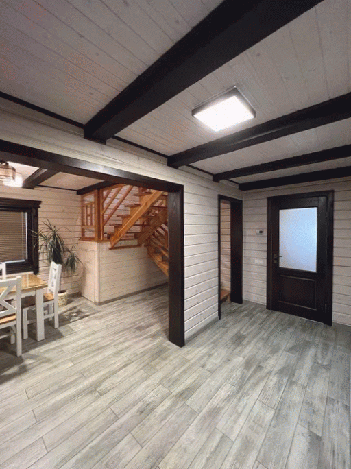 Дом построен из рубленного бревна, фундамент ленточный, крыша металлочерепица. Перекрытия частично монолитные, частично деревянные. На первом этаже в коридоре, на кухне и санузле теплый пол.