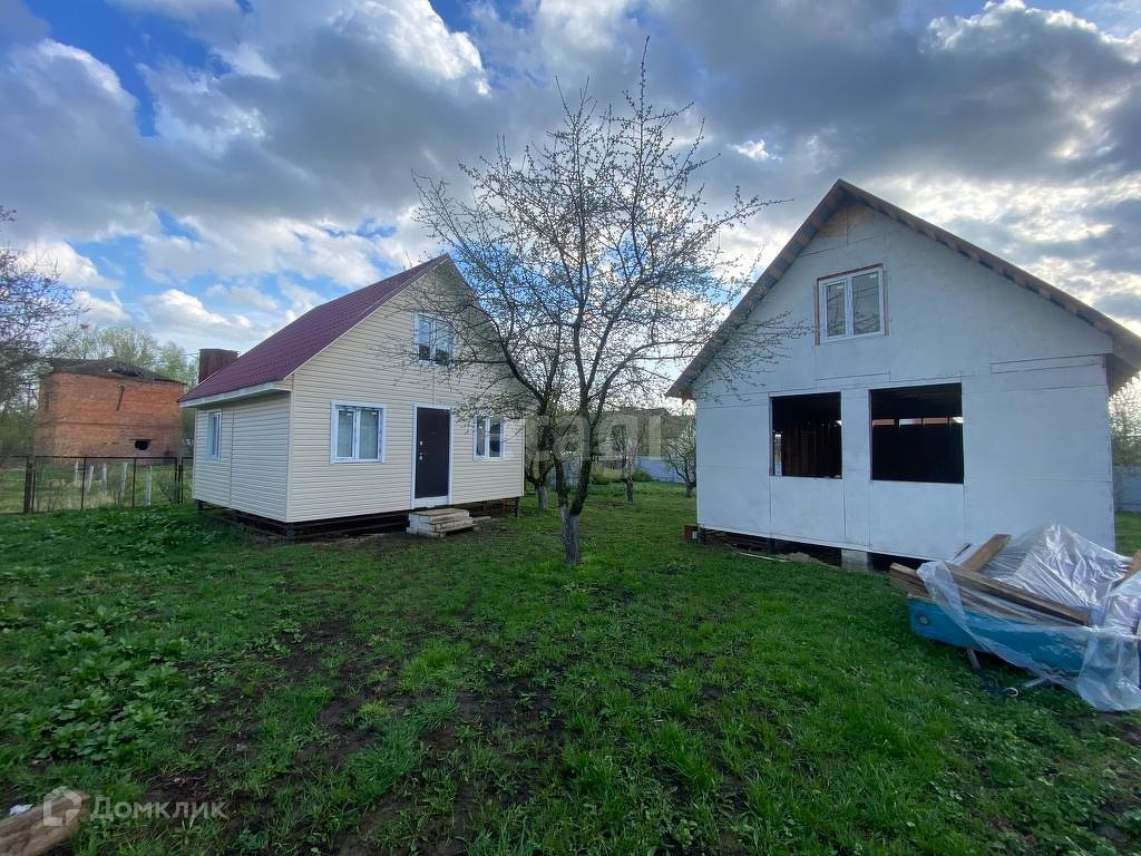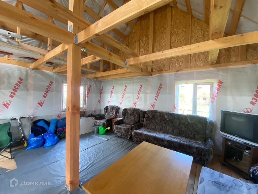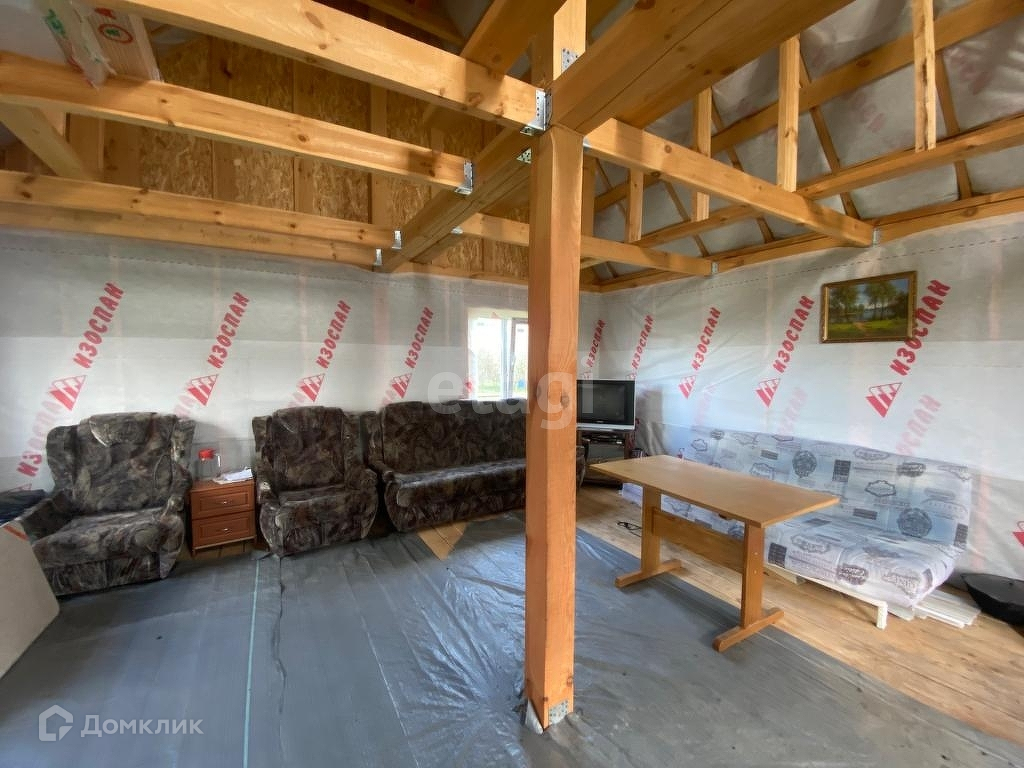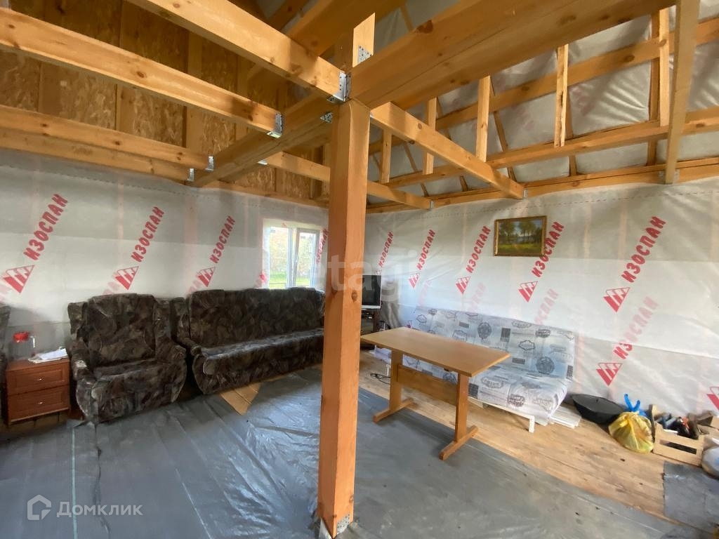 На участке каркасный домик 54 м2. - утеплён, без внутренней отделки.