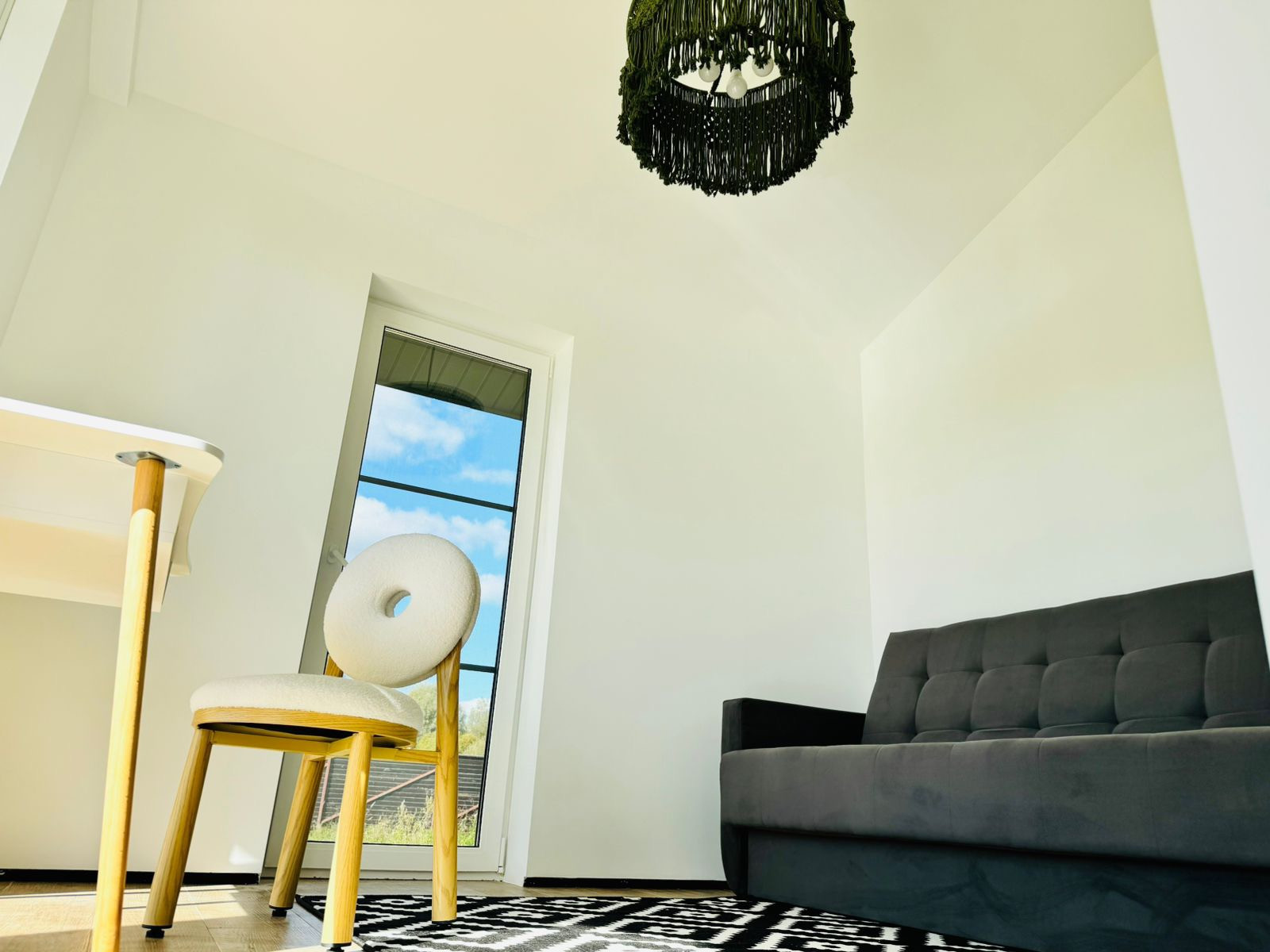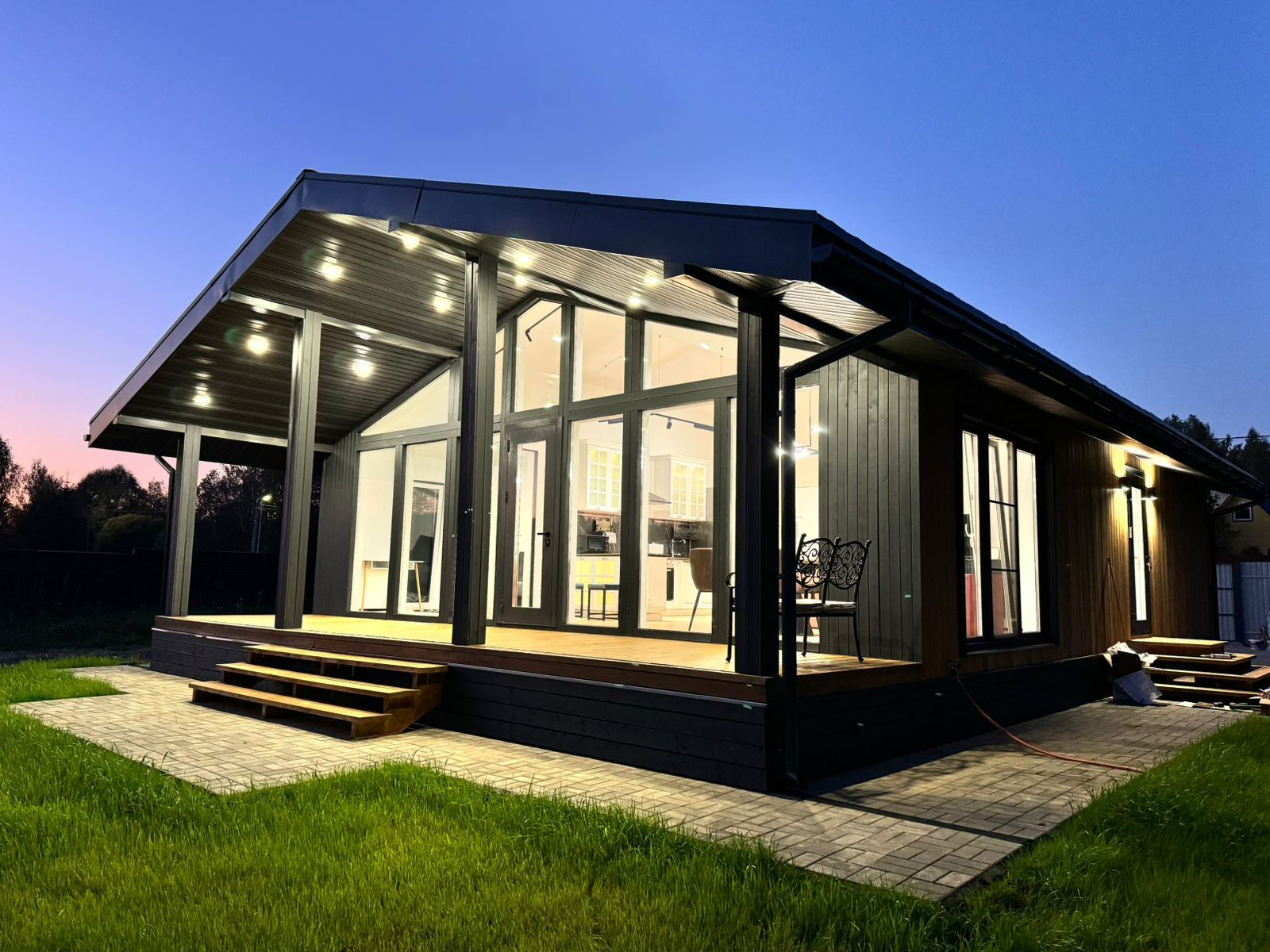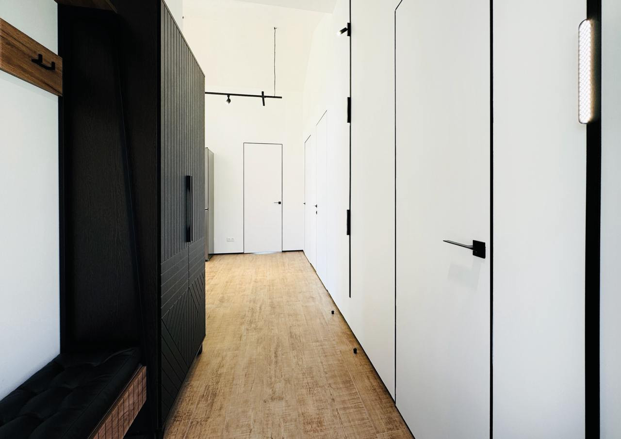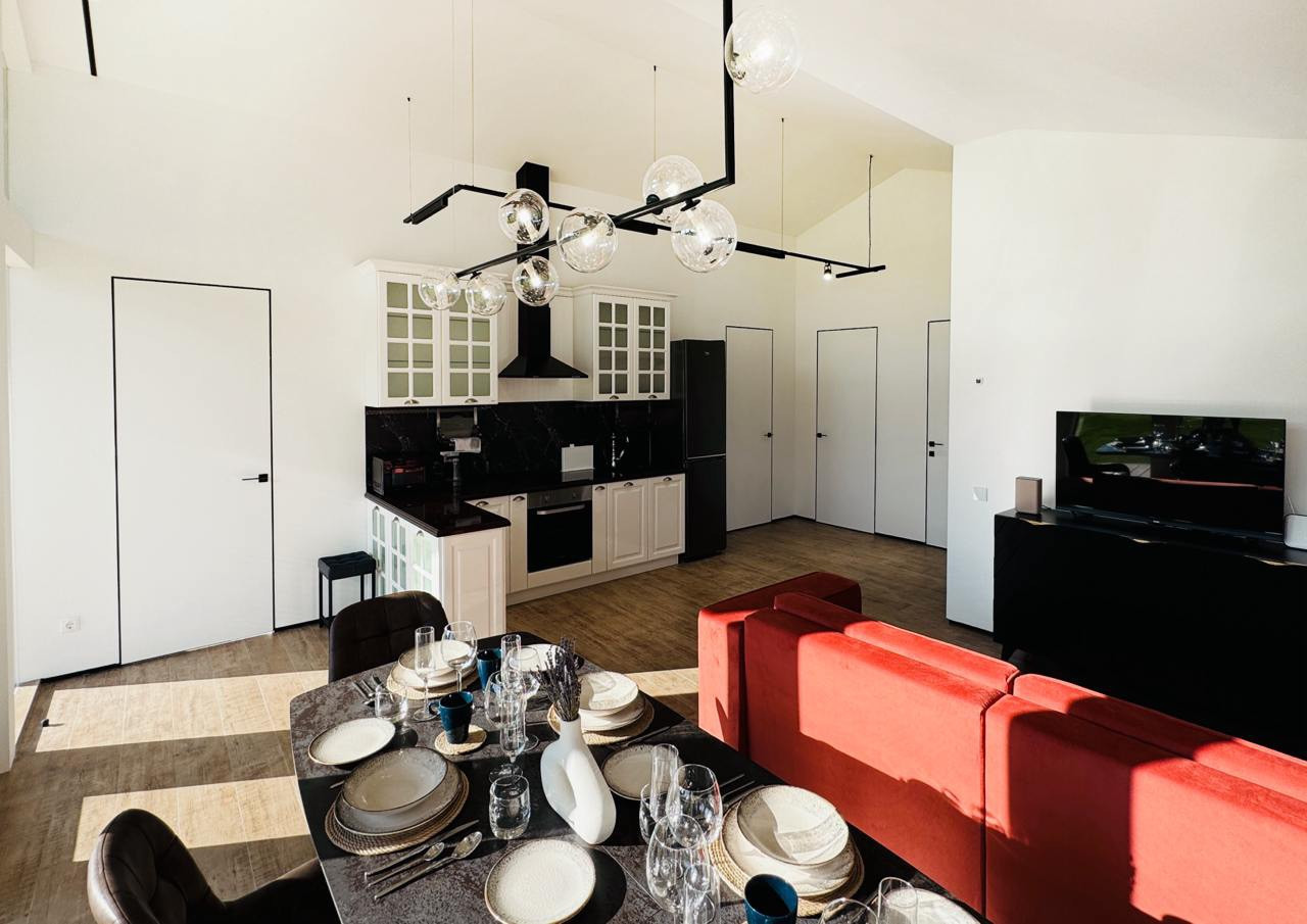 гостиная и кухня с панорамными окнами,потолок 4,2 м, хозяйственное помещение. Теплый пол во всех помещениях, двери скрытого монтажа высотой 2.2м. Низковольтные трековые светильники