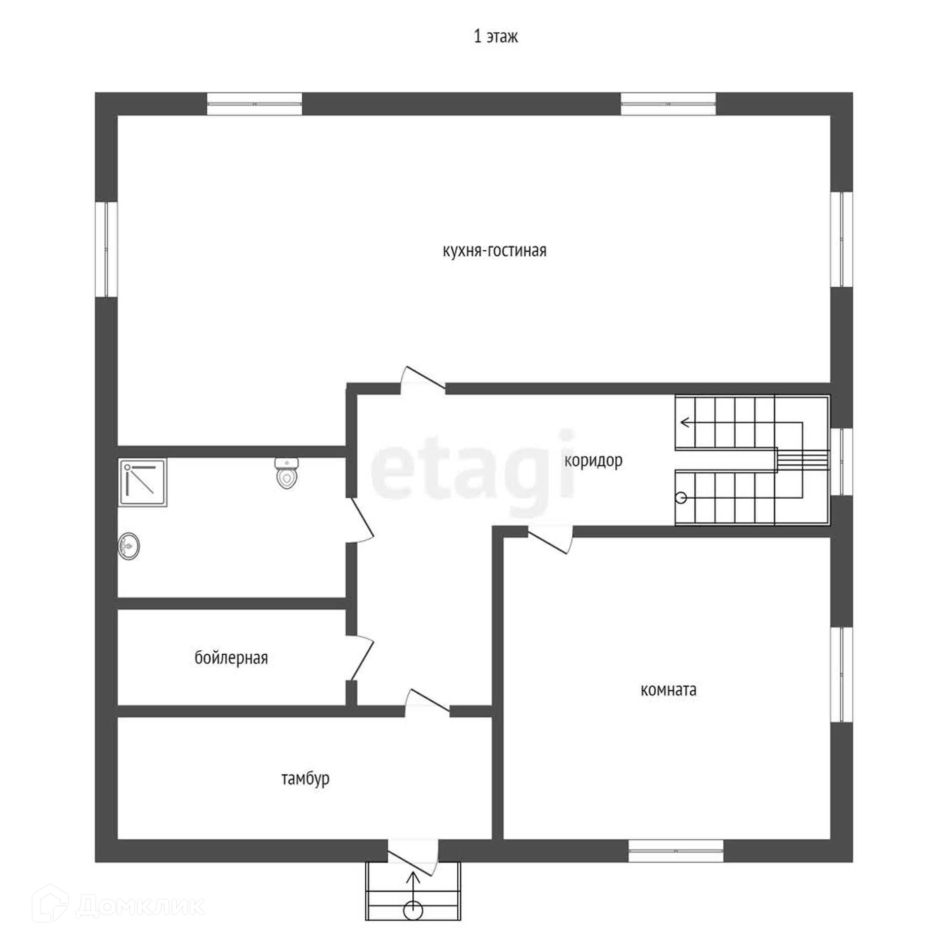 Первый этаж: шикарная кухня - гостиная 40 кв.м, комната, котельная, объединенный санузел. Кухня оснащена всей необходимой техникой.