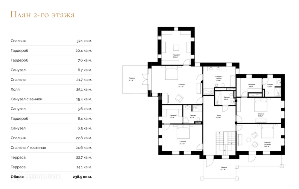 2 этаж: большая мастер-спальня со своей гардеробной и с/у + 3 просторные спальни со своими гардеробными и с/у.