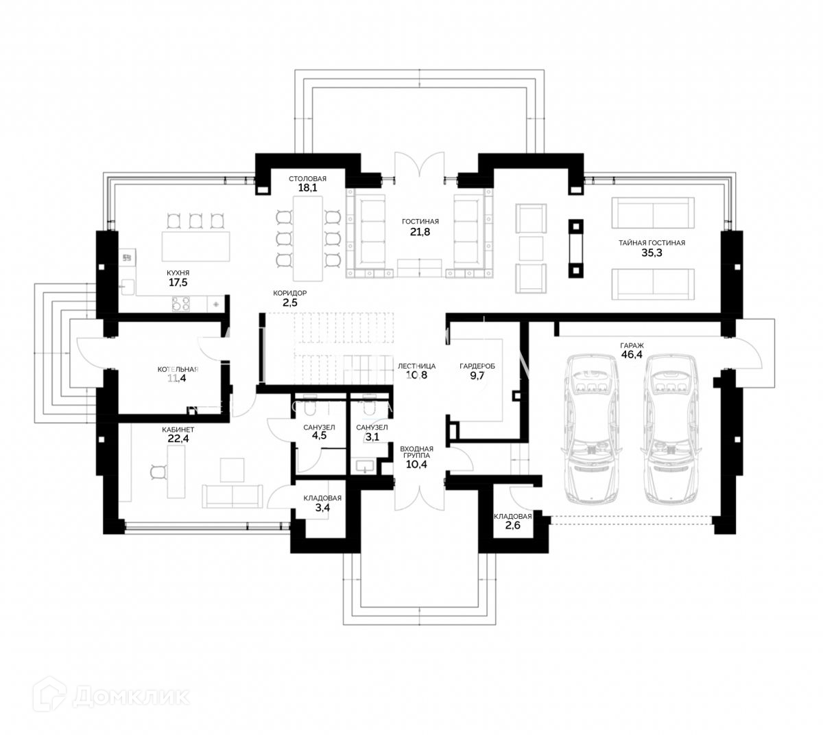1 этаж: - Кухня , столовая, гостиная, каминный зал, кабинет или спальня, 2 с/у, гардеробная, котельная, гараж на 2 м/м