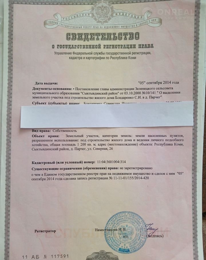 Продам земельный участок под строительство жилого дома. д. Парчег, ул. Северная, 26. Кадастровый номер: N11-11-01/155/2014-420.  Администрацией для строительства выделяется лес на корню.