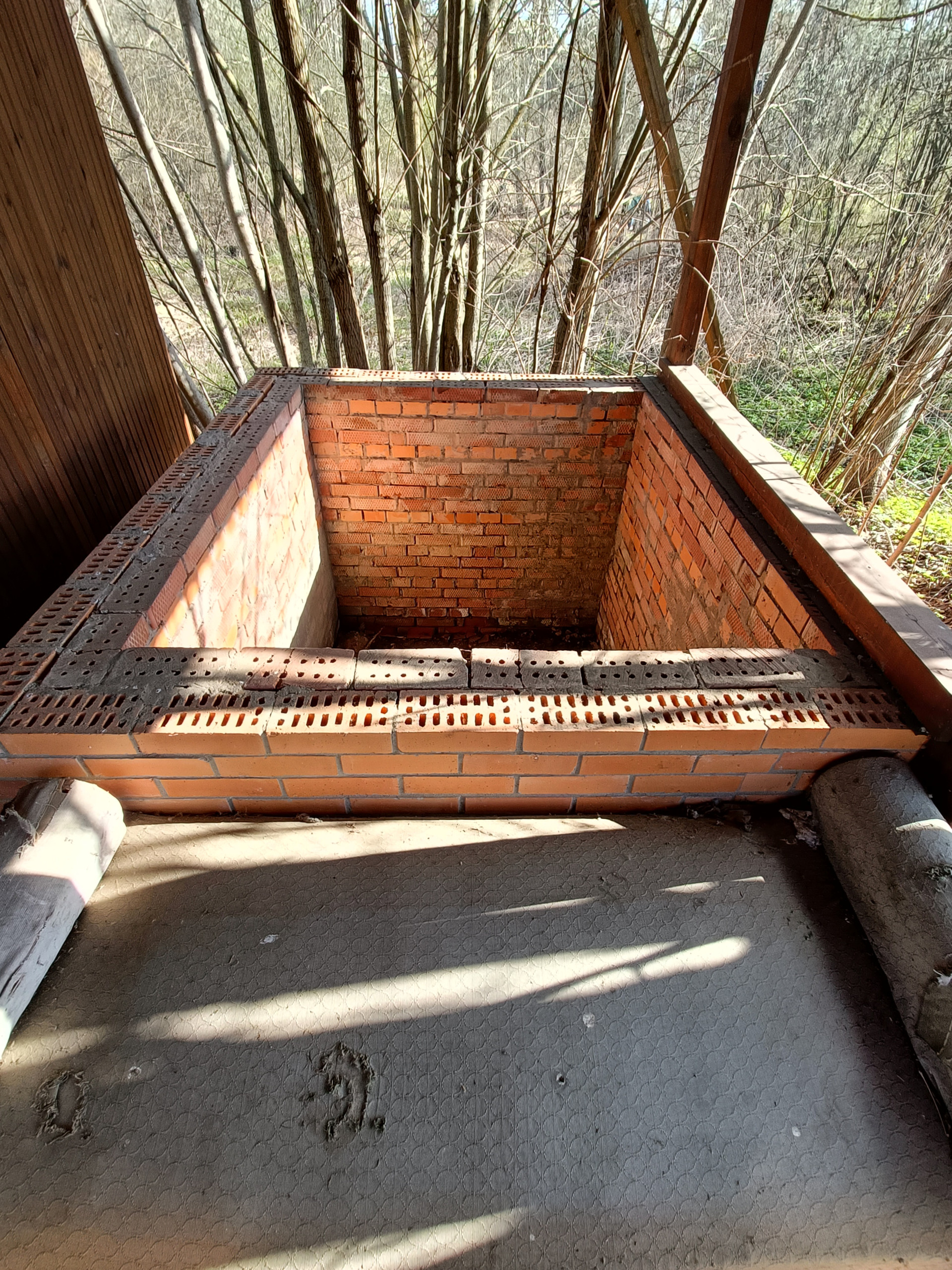 Выполнен из шпунтованного бруса 100*150 на ленточном фундаменте, глубина 2.30м.