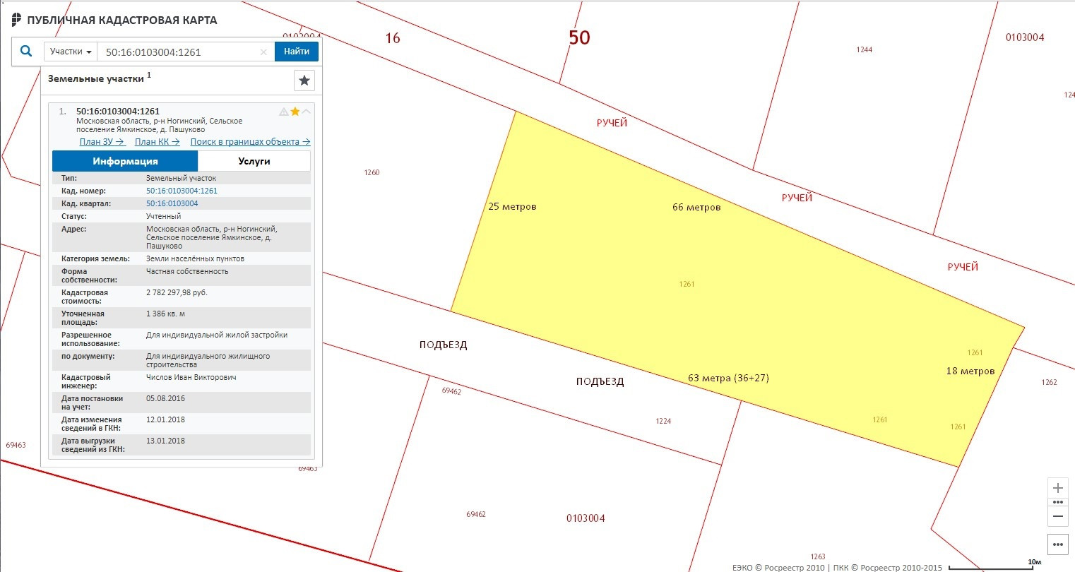 Участок правильной формы, 63 метра по фасаду, 18-25 метров в глубину, кадастровый номер 50:16:0103004:1261. Участку присвоен адрес, расположен на тихой спокойной улице в тупике, мимо участка проезда нет, за участком протекает ручей.
