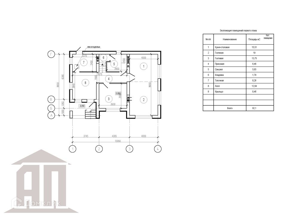 1 этаж: кухня-гостиная, комната, с/у.