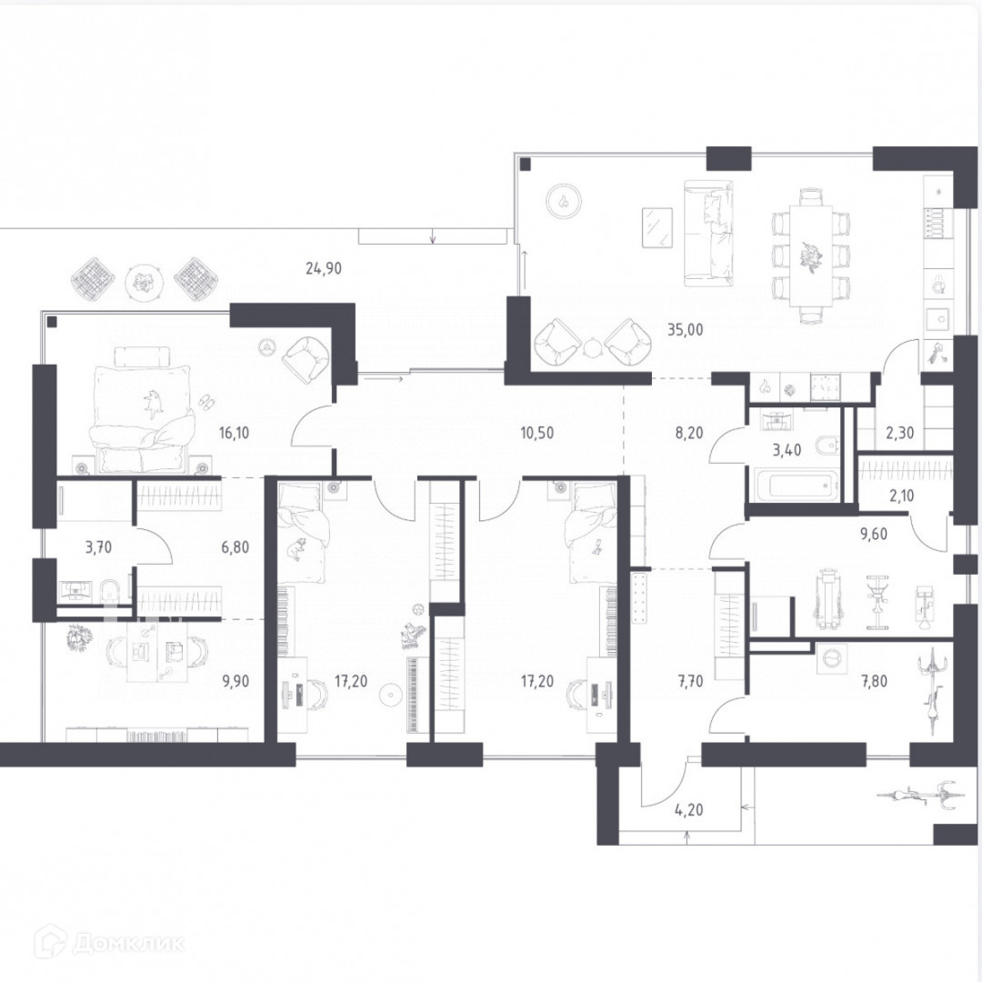 Планировка: прихожая, кладовая, кухня-гостиная, ванная комната, сауна, мастер-спальня с кабинетом и ванной комнатой, две спальни.