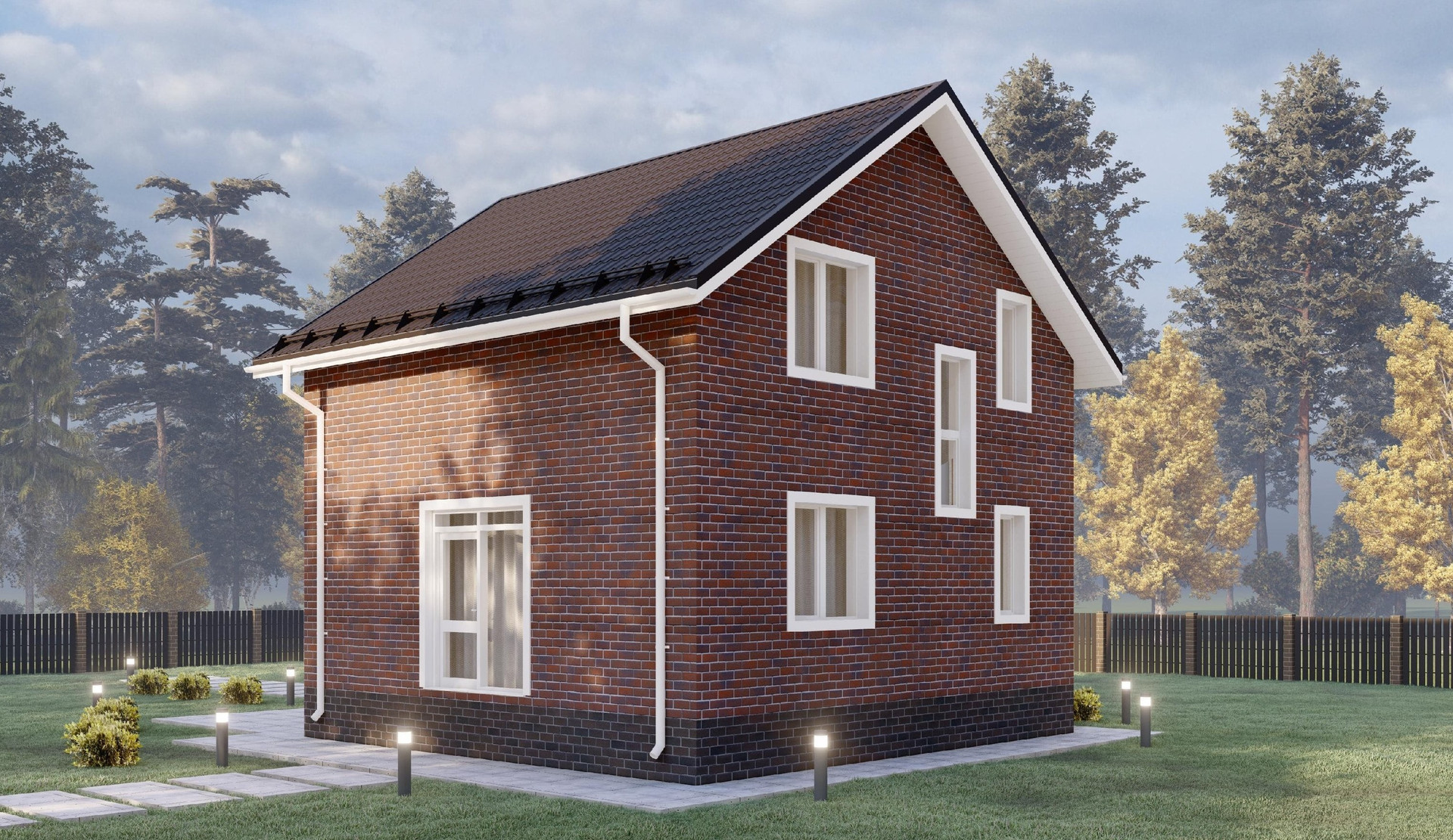 Каркасный дом в два этажа с крыльцом. Данный проект создан для тех, кто желает выбрать наиболее бюджетный вариант строительства. Это компактная, аккуратная постройка, которая за счет тщательно продуманной планировки никогда не покажется вам тесной. Комнаты обоих этажей получились светлыми и просторными. Благодаря квадратной форме объект удачно встанет в любом месте участка. Планировка включает себя тамбур, гардеробную, туалет, бойлерную и кухню-гостиную на первом этаже и 3 спальни, ванную и холл на втором этаже.