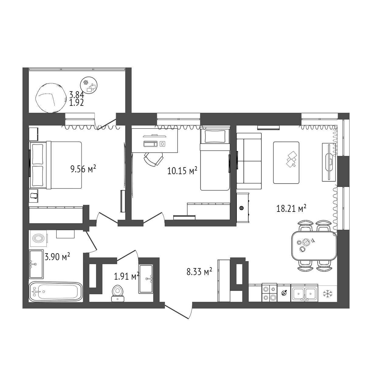 Общая площадь 55.9 м2